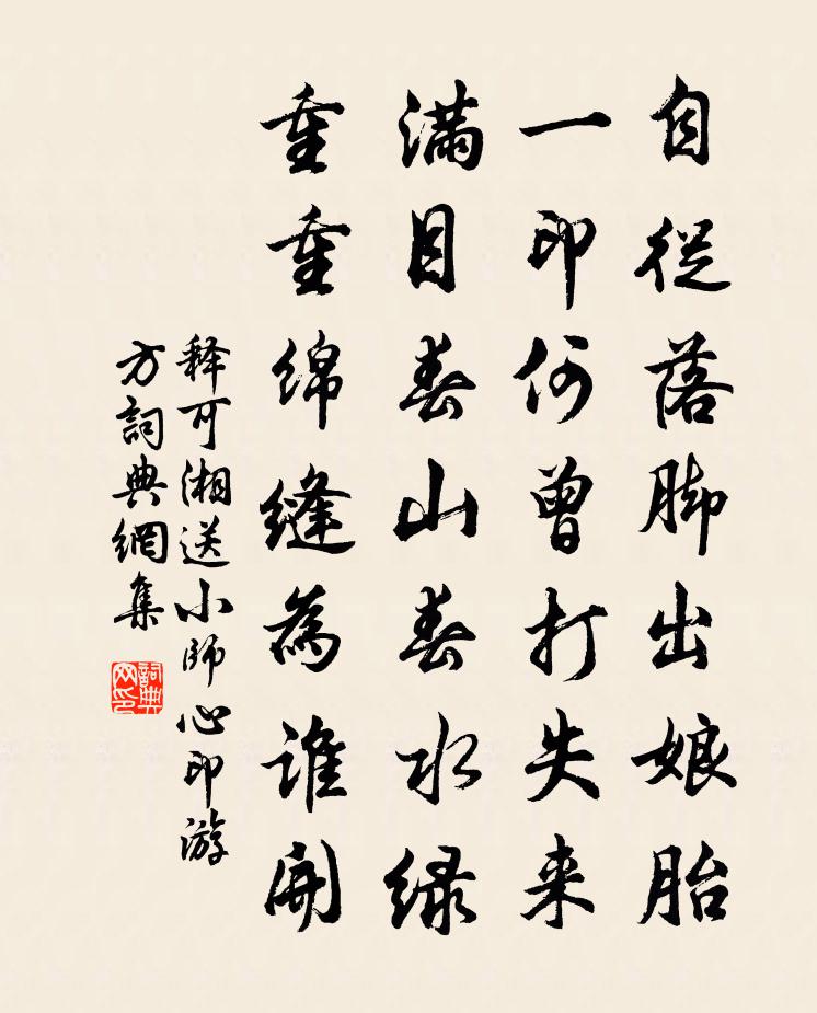 詩詞名句歷史字典書法欣賞書法字典國語詞典說文解字康熙字典古漢語字典標 題 作 者 詩 句 送小師心印遊方作者:釋可湘 朝代:宋代送小師心印遊方原文自從落腳出娘胎,一印何曾打失來。滿目春山春水綠,重重綿縫為誰開。詩詞問答問:送小師心印遊方的作者是誰?答:釋可湘問:送小師心印遊方寫於哪個朝代?答:宋代釋可湘送小師心印遊方書法欣賞送小師心印遊方書法作品詩詞推薦廣文先生送詩方思所以報之而未得忽鸝落庭樹趙蕃〔宋代〕王子詩如照,滕侯隱似真。倘來寧取遇,居易若為屯。酬倡雖才始,風期自夙親。江湖縱悠遠,德盛罔非鄰。冬至伊邇滯留桂陽有感曹彥約〔宋代〕如此生涯任轉蓬,幾年漂泊羨歸鴻。淒涼落日荒山外,黯澹愁雲暮靄中。業菊乍殘秋色遠,嶺梅將放雪光融。枯腸書畫一首劉克莊〔宋代〕大帝昭回獎叢藁,太師行草跋蘭亭。篋藏有物為呵護,巾襲令兒掌鑰扃。目眚端由書作崇,心痴常怕畫通靈。不如新春書懷孫應時〔宋代〕樂國急春早,寒窗獨夜分。舊期心不動,今恐老無聞。結習唯黃卷,凝愁奈折雲。梅梢香漸少,還起米爐薰。題法華寺五言二十韻李紳〔唐代〕花界無生地,慈宮有相天。化娥騰寶像,留影閟金仙。殿涌全身塔,池開半月泉。十峰排碧落,雙澗合清漣。藥草芍藥三首賈似道〔宋代〕上了甘泉三捷書,長淮萬里一塵無。清和時節如春在,紅藥精神與昔殊。叢玉生香歌可譜,圍金有客瑞重圖。公堂感懷方岳〔宋代〕曩昔行藏已熟籌,最為一策是無求。看人面孔有何好,如此頭顱只麽休。草草園廬山北住,匆匆歲月水東流。莫因餞王將軍赴雲中孟匡明〔唐代〕一師憑廟略,分閫佐元戎。勢亞彤弓寵,時推金印雄。關山橫代北,旌節壯河東。日轉前茅影,春生細柳風。飲冰虞美人范成大〔宋代〕玉簫驚報同雲重。仍怪金瓶凍。清明將近雪花翻。不道海堂消瘦、柳絲寒。王孫沈醉狨氈幕。誰怕羅衣薄。燭燈香畫堂春鄭域〔宋代〕東風吹雨破花慳。客氈曉夢生寒。有人斜倚小屏山。蹙損眉彎。合是一釵雙燕,卻成兩鏡孤鸞。暮雲修竹淚留殘。夏杪陳師道〔宋代〕一室青蕪長,終朝靜不嘩。聖賢開美酒,子母破新瓜。綠筱初翻籜,紅蕖稍薦花。咄嗟功業晚,覽照鬢初華。同翁士特李似表謁巽伯少卿因作醉歌劉子翬〔宋代〕翁劉異氏居同里,奕葉論交今久矣。隴西京兆實姻連,我既識翁因識李。巽卿自洛始遷閩,寄食僧房仍密邇。盍簪立春帖子太上皇后閣周必大〔宋代〕舊疑莊叟大椿年,一度春回歲八千。今見東皇與西母,誰言此語是虛傳。八月上浣與張元輔張子濟小飲德慶貢院聽檐下曾豐〔宋代〕金氣涵秋晚,銀河耿夜晴。天塗雲色淡,月浸桂花清。露坐疑僵發,風餐欲冰羹。壁蟲不相亮,更作戒寒聲。水調歌頭(次袁仲機韻)朱熹〔宋代〕長記與君別,丹鳳九重城。歸來故里,愁思悵望渺難平。今夕不知何夕,得共寒潭煙艇,一笑俯空明。有酒徑須醉喜雪次侯宰韻喻良能〔宋代〕凍筆難成授簡章,寒光先到讀書堂。亂飄撲面如平叔,幾點侵眉似馬良。霜夜楊萬里〔宋代〕月影全無只有星,如何夜色照人清。素娥未必饒青女,不道霜明勝月明。春盡日釋文珦〔宋代〕春去無緣得暫留,意行曉到古原頭。落花流水如多怨,老柳因風不奈愁。鵑聲作意歸何許,蝶夢無憑覺即休。林叟甲子日無雨偶成吳芾〔宋代〕連歲人懷水潦憂,年登猶嘆不全收。夏逢甲子天無雨,預喜今年又有秋。舟自震澤道吳興城外有感孫應時〔宋代〕憶向苕溪泊酒船,寧知綠髮便華顛。只今行腳一萬里,重此驚心二十年。箬笠簑衣真我事,清風明月苦論錢。晚涼名句推薦接天蓮葉無窮碧,映日荷花別樣紅。楊萬里《曉出淨慈寺送林子方》 尺之木必有節目,寸之玉必有瑕適。呂不韋《呂氏春秋·覽·離俗覽》 曲終人不見,江上數峰青。錢起《省試湘靈鼓瑟》 誠者,天之道也。誠之者,人之道也。誠者,不勉而中不思而得:從容中道,聖人也。誠之者,擇善而固執之者也子思《中庸·第二十章》 嘆息此人去,蕭條徐泗空李白《經下邳圯橋懷張子房》 大道如青天,我獨不得出。李白《行路難三首》 神龜雖壽,猶有竟時。曹操《龜雖壽》 淇澳春雲碧,瀟湘夜雨寒。憨山德清《詠竹五首》 此身行作稽山土,猶吊遺蹤一泫然。陸游《沈園二首》 樓頭客子杪秋後,日落君山元氣中。陳與義《登岳陽樓》
