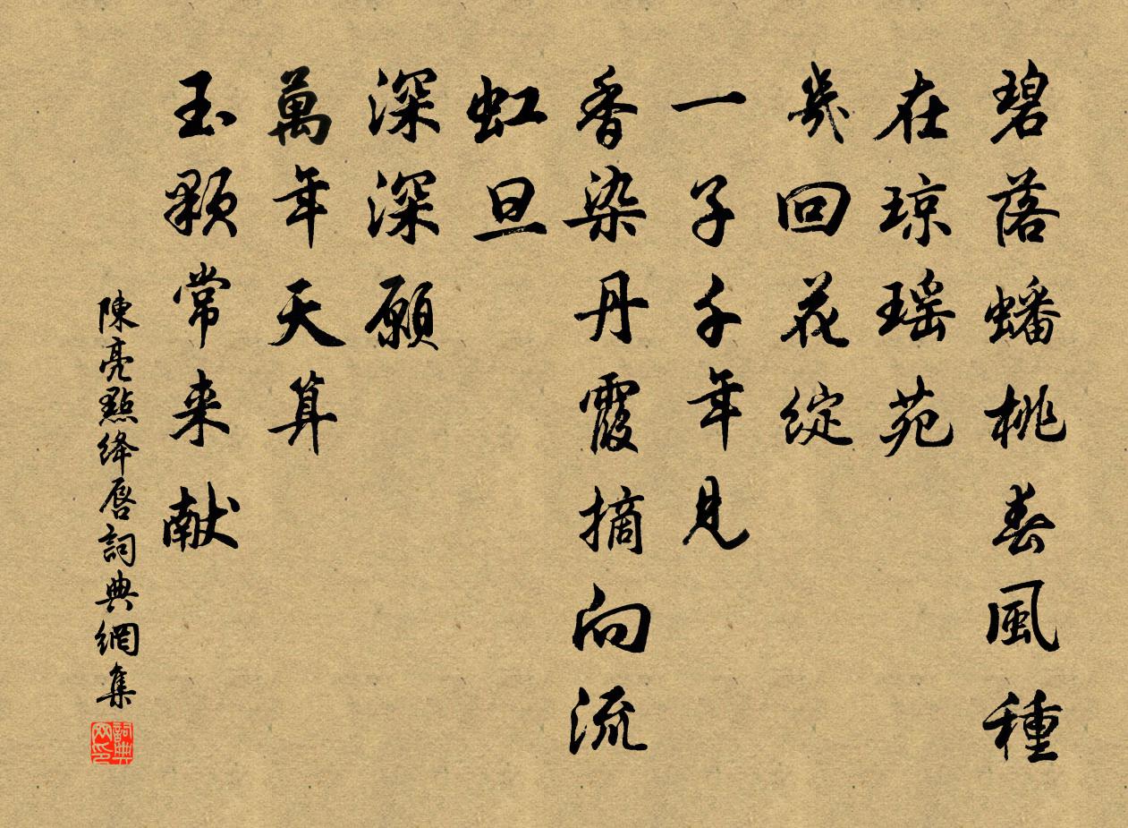 詩詞名句歷史字典書法欣賞書法字典國語詞典說文解字康熙字典古漢語字典標 題 作 者 詩 句 點絳唇作者:陳亮 朝代:宋代點絳唇原文碧落蟠桃,春風種在瓊瑤苑。幾回花綻。一子千年見。香染丹霞,摘向流虹旦。深深願。萬年天算。玉顆常來獻。詩詞問答問:點絳唇的作者是誰?答:陳亮問:點絳唇寫於哪個朝代?答:宋代問:點絳唇是什麼體裁?答:詞問:陳亮的名句有哪些?答:陳亮名句大全陳亮點絳唇書法欣賞點絳唇書法作品詩詞推薦巫山神女廟劉禹錫〔唐代〕巫山十二郁蒼蒼,片石亭亭號女郎。曉霧乍開疑卷幔,山花欲謝似殘妝。星河好夜聞清佩,雲雨歸時帶異香。何事次韻程帥陳造〔宋代〕嗜慾割去土與泥,調虞氣血等稚兒。拘拘譾譾世所怪,未免鶴髮仍雞皮。甘脆為目不為腹,蠶繭自縛良苦之。兩螯正月四日馬廷鸞〔宋代〕皇厭紛拿五季余,萬兵朝遣暮還都。虎頭預卜清明旦,鰲足重開混一區。天下歸仁吾有道,日中為市爾無虞。孤臣普滿題潞州佛舍佚名〔唐代〕此水連涇水,雙珠血滿川。青牛將赤虎,還號太平年。池蓮詠倪瓚〔元代〕迴翔波間風,的歷葉上露。清池結素彩,華月映微步。雲陰花房斂,雨歇芳氣度。欲去拾明璫,踟躕惜遲暮。偈頌一百零四首釋紹曇〔宋代〕三界炎炎如火聚,攪擾勞生困蒸煮。邪見稠林蔽祖庭,孰為臨濟陰涼樹。拄杖子,迴避無門,全身荷負特立獨行,奉和聖制送金城公主適西蕃應制張說〔唐代〕青海和親日,潢星出降時。戎王子婿寵,漢國舅家慈。春野開離宴,雲天起別詞。空彈馬上曲,詎減鳳樓思。偈頌五十一首釋大觀〔宋代〕秋光杪暮,霜吹淒肅。無位真人,草眠露宿。慈雲忍俊不禁,試為臨風招之,式微式微胡不歸。胡不歸,一堂和氣風流子趙以夫〔宋代〕憶惜少年日,吳江上、長嘯步垂虹。看飛出玉輪,十分端正,幻成冰壑,一碧澄空。當此際,醉魂游帝所,涼袂揚司中司命五首佚名〔宋代〕酌茲旨酒,既盈且芬。式用來歆,衍衍熏熏。何以寧神,薦有嘉籩。何以錫民,日惟豈年。橫吹曲辭雍台歌溫庭筠〔唐代〕太子池南樓百尺,八窗新樹疏簾隔。黃金鋪首畫鉤陳,羽葆亭童拂交戟。盤紆闌楯臨高台,帳殿臨流鸞扇開。早雁詠槐李復〔宋代〕當年夾路綠參差,曾擁金輿拂羽旗。得地偶逃斤斧幸,聞風非與雪霜期。猶殘臘火燔空腹,時有驚雷起蠹枝。想見追和東坡梅花十絕王之道〔宋代〕莫怪風前玉斚飛,飲酣初喜傳花枝。正當北雪消殘後,恰直東風料峭時。夏夜暑毒不少解起坐庭中陸游〔宋代〕風從高樹下,蟲抱短莎鳴。小據胡床坐,還夫拄杖行。浣溪沙·攏鬢新收玉步搖韓偓〔唐代〕攏鬢新收玉步搖,背燈初解繡裙腰,枕寒衾冷異香焦。深院不關春寂寂,落花和雨夜迢迢,恨情殘醉卻無聊。二詩寄德粲並簡內觀諸友朱槔〔宋代〕九淵亭上二三子,見說年來事事新。隔水不容招手喚,曲窗已有畫眉人。酴醾香好急攜酒,鶗鴂聲繁催送春。笑我木蘭花晏殊〔宋代〕紫薇朱槿繁開後。枕簟微涼生玉漏。玳筵初啟日穿簾,檀板欲開香滿袖。紅衫侍女頻傾酒。龜鶴仙人來獻壽。歡聲頌古十三首釋德光〔宋代〕颺下采樵斧,直入碓坊舂。一腳踏到底,黃梅信息通。晚晴方回〔宋代〕油泥方滑道,返照隔樓明。年已如秋老,心猶愛晚晴。鼓刀寧異遇,帶索定徒行。倚遍闌乾夜,寒砧處處聲。木犀姚勉〔宋代〕賣花擔上買秋光,分貯冰壺沁曉涼。滴取露珠供硯水,筆頭已覺帶天香。名句推薦故人西辭黃鶴樓,煙花三月下揚州。李白《黃鶴樓送孟浩然之廣陵》 相逢不用忙歸去,明日黃花蝶也愁。蘇軾《九日次韻王鞏》 鳥向平蕪遠近,人隨流水東西。劉長卿《謫仙怨·晴川落日初低》 靄芳陰未解,乍天氣、過元宵。周端臣《木蘭花慢·送人之官九華》 黯與山僧別,低頭禮白雲。李白《秋浦歌十七首》 巧笑倩兮,美目盼兮。佚名《碩人》 今日獨來香徑里,更無人跡有苔錢。韓偓《寒食日重遊李氏園亭有懷》 華燈縱博,雕鞍馳射,誰記當年豪舉。陸游《鵲橋仙·華燈縱博》 四邊伐鼓雪海涌,三軍大呼陰山動。岑參《輪台歌奉送封大夫出師西征》 丈夫志四海,萬里猶比鄰。曹植《贈白馬王彪·並序》