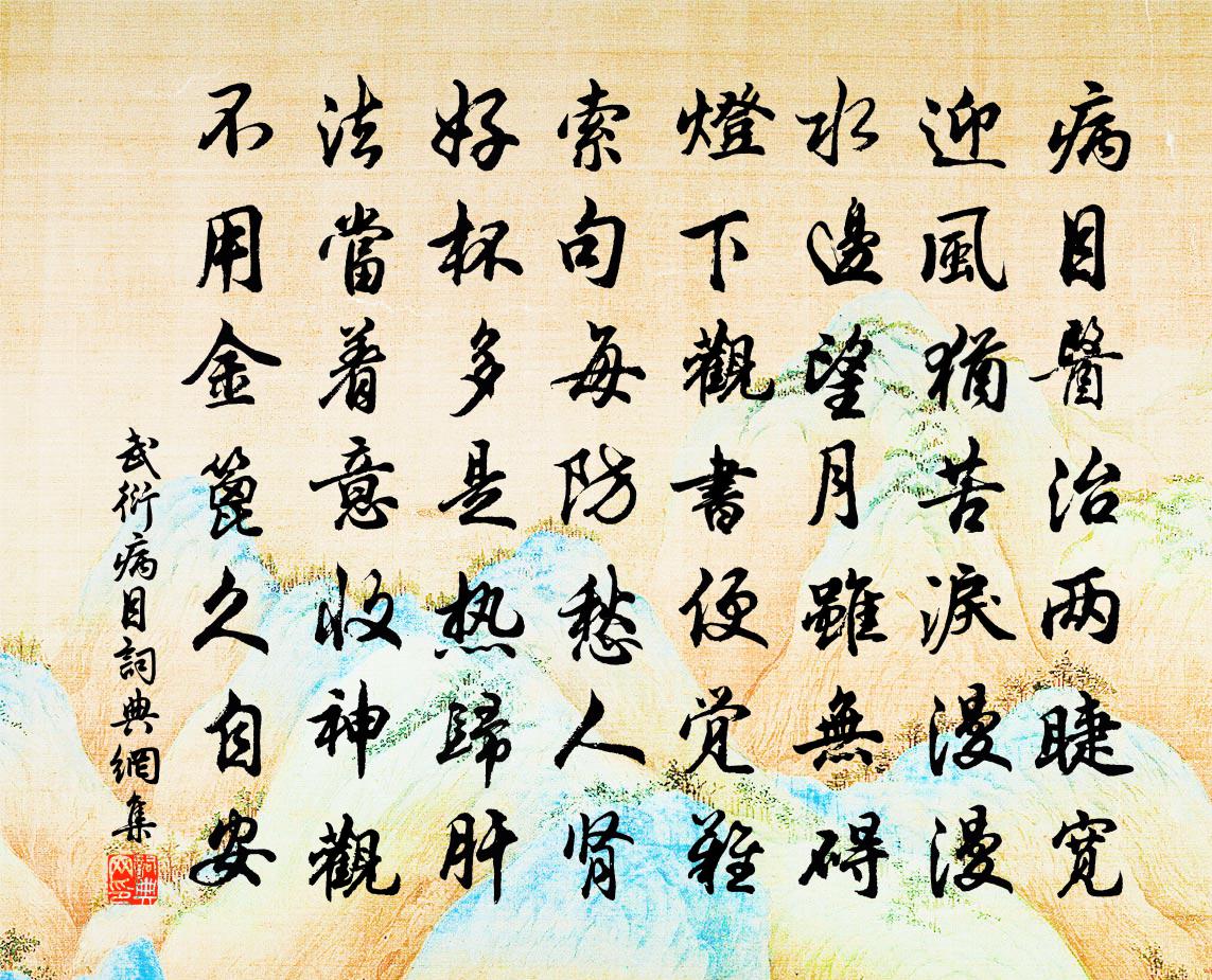 詩詞名句歷史字典書法欣賞書法字典國語詞典說文解字康熙字典古漢語字典標 題 作 者 詩 句 病目作者:武衍 朝代:宋代病目原文病目醫治兩睫寬,迎風猶苦淚漫漫。水邊望月雖無礙,燈下觀書便覺難。索句每防愁人腎,好杯多是熱歸肝。法當著意收神觀,不用金篦久自安。詩詞問答問:病目的作者是誰?答:武衍問:病目寫於哪個朝代?答:宋代武衍病目書法欣賞病目書法作品詩詞推薦之江淮留別京中親故耿湋〔唐代〕長雲迷一雁,漸遠向南聲。已帶千霜鬢,初為萬里行。繁蟲滿夜草,連雨暗秋城。前路諸侯貴,何人重客卿。感白髮汪莘〔宋代〕一枕黃粱夢欲殘,死生大海浪漫漫。鬢邊白髮休除卻,時向窗前把鏡看。雪竹於石〔宋代〕君子亭亭操,剛強能自持。夷齊餓欲死,巡遠守方危。大節不可屈,真心終莫移。人心與物理,每向歲寒枝。挽王大夫徐照〔宋代〕兩行身為郡,里中如不知。民歸清淨化,家似困窮時。秦木淒秋韻,湘雲結暮姿。若無遺愛在,何得後人思。頌古釋道顏〔宋代〕宣德門前過,回頭便招禍。若要無事時,且歸屋裡坐。嘆常生白居易〔唐代〕西村常氏子,臥疾不須臾。前旬猶訪我,今日忽雲殂。時我病多暇,與之同野居。園林青藹藹,相去數里余。村鄰海棠二首傅察〔宋代〕恰恰清明昨產過,海棠幽獨占春多。杜陵不是無心賦,才薄難工奈若何。百丈山袁陟〔宋代〕復嶺逾崷崒,層崖遍屈盤。寺當幽谷面,路指白雲端。樹老蒼天骨,藍凝上帝冠。右屏秋已凍,板屋夜多寒。三宿登華頂峰孟觀〔宋代〕偶因華頂宿,抬手摘星辰。不敢高聲語,恐尺天上人。有炎氏頌佚名〔先秦〕聽之不聞其聲。視之不見其形。充滿天地。苞裹六極。政府生日十首曹勛〔宋代〕朝回寶勒照金狨,彩服熙熙笑語中。隔坐屏風未為貴,袞衣真是黑頭公。題光武廟三首曹勛〔宋代〕故人高臥枕嚴溪,香火紛紛俗不疲。倘贊提封如帝業,也分百戶奉真祠。題廣陵妓屏二首呂岩〔唐代〕嫫母西施共此身,可憐老少隔千春。他年鶴髮雞皮媼,今日玉顏花貌人。花開花落兩悲歡,花與人還事一般。開在懷徐表兄劉宰〔宋代〕一笑相逢句曲天,別來十五換流年。忍胃渭上瓊瑰詠,無復通泉寶劍篇。北渚春回芳樹合,西山日暮碧雲連。雁來次韻陳元述見寄謝茶葛立方〔宋代〕露窠那畏主林神,小摘筠籃手自親。旋轉注湯雲作腳,繽紛出磨麴為塵。睡魔已戰三竿日,詩社聊嘗一信春。不把含山驛中王之道〔宋代〕日暖風輕晝睡余,海棠嬌褪玉肌膚。楊花也似知人意,來趁飛紅入座隅。贈張先生范仲淹〔宋代〕應是少微星,又雲嚴君平。浩歌七十餘,未嘗識戈兵。康寧福已大,清靜道自生,邈與神仙期,不犯寵辱驚。讀易贈彥清洪皓〔宋代〕好生惡殺號蒼天,天憫斯民欲息肩。自是大邦後不戢,在於南國使無{左亻右替日換心}。論功弗用矜三捷,寺勝念奴嬌劉鎮〔宋代〕調冰弄雪,想花神清夢,徘徊南土。一夏天香收不起,付與蕊仙無語。秀入精神,涼生肌骨,銷盡人間暑。稼軒愁菩薩蠻·花明月暗籠輕霧李煜〔唐代〕花明月暗籠輕霧,今宵好向郎邊去。剗襪步香階,手提金縷鞋。畫堂南畔見,一向偎人顫。奴為出來難,教郎恣意名句推薦江南臘盡,早梅花開後,分付新春與垂柳。蘇軾《洞仙歌·詠柳》 殘燈孤枕夢,輕浪五更風。徐昌圖《臨江仙·飲散離亭西去》 峨嵋山下少人行,旌旗無光日色薄。白居易《長恨歌》 對聖賢言語,必要我平時照樣行去,才算讀書。王永彬《圍爐夜話·第二則》 層樓望,春山疊;家何在?辛棄疾《滿江紅·點火櫻桃》 今日俸錢過十萬,與君營奠復營齋。元稹《遣悲懷三首·其一》 不戚戚於貧賤,不汲汲於富貴。陶淵明《五柳先生傳》 父耕原上田,子劚山下荒。聶夷中《田家》 君子成人之美,不成人之惡;小人反是。孔子弟子《論語·顏淵篇》 南去北來徒自老,故人稀。賀鑄《釣船歸·綠淨春深好染衣》
