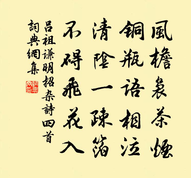 詩詞名句歷史字典書法欣賞書法字典國語詞典說文解字康熙字典古漢語字典標 題 作 者 詩 句 明招雜詩四首作者:呂祖謙 朝代:宋代明招雜詩四首原文風檐裊茶煙,銅瓶語相泣。清陰一疎箔,不礙飛花入。詩詞問答問:明招雜詩四首的作者是誰?答:呂祖謙問:明招雜詩四首寫於哪個朝代?答:宋代呂祖謙明招雜詩四首書法欣賞明招雜詩四首書法作品詩詞推薦崔伯易畫像贊陸游〔宋代〕古之君子,學以為己。可行則行,可止則止。仕以行義,止以遠恥。世衰道微,豈復知此。蚩蚩始學,青紫思拾。挽李仲輔三首張元乾〔宋代〕人生真寄爾,天問竟悠哉。三載重凶釁,一門皆異材。尚疑書未報,遽有訃先來。淚盡余青血,秋風萬壑哀。念奴嬌(落梅)趙長卿〔宋代〕玉龍聲杳,正瑤台曲舞,香山初徹。褪粉掐酥千萬顆,滿地平鋪銀雪。草褥香茵,苔錢買住,留待黃昏月。有人妝峽江龍祠趙汝績〔宋代〕坐占山回抱,平看水怒流。丹青今古像,香火往來舟。石插青莎岸,雲橫夕照樓。揚靈相恐動,巫覡有深謀。早冬白居易〔唐代〕十月江南天氣好,可憐冬景似春華。霜輕未殺萋萋草,日暖初乾漠漠沙。老柘葉黃如嫩樹,寒櫻枝白是狂花。此時挽徐吏部熊夢渭〔宋代〕安車駕夷路,佩玉造明庭。天定歸郎位,雲開出使星。心賞思綠野,夢不鸞青冥。千古行藏際,豐碑定有銘。臘雪一首蘇籀〔宋代〕吞屋糝空嗥越犬,如椽懸乳戰吳僧。皛然一色紛無際,飄瞥群花散卻凝。人跡禽飛遭屏絕,竹端松頂重何勝。將軍採桑子黃庭堅〔宋代〕馬湖來舞釵初賜,笳鼓聲繁。賢將開關。威竦西山八詔蠻。南溪地逐名賢重,深鎖群山。燕喜公閒。一斛明珠兩小謝賓客輓歌三首梅堯臣〔宋代〕當年罷會稽,還郡錦為衣。老作龍樓貴,終將鳳沼違。英魂游岱去,石槨渡江歸。揚子春風惡,南徐過客稀。眾帆雜言無錫惠山寺流泉歌皇甫冉〔唐代〕寺有泉兮泉在山,鏘金鳴玉兮長潺潺。作潭鏡兮澄寺內,泛岩花兮到人間。土膏脈動知春早,隈隩陰深長苔草。處買妾言楊維楨〔元代〕買妾千黃金,許身不許心。使君聞有婦,夜夜白頭吟。春雨陸游〔宋代〕擁被聽春雨,殘燈一點春。吾兒歸漸近,何處宿長亭?寄留夢炎許月卿〔宋代〕山屋好中秋,中齋炯在眸。中流誰砥柱,野水卻孤舟。上意甘盤甚,來遲季子留。願毋淹獨樂,留相九重休。失假山何師韞〔宋代〕片石亡來歲月深,昔時來覓到如今。誰知只在家山裹,枉費工夫到處尋。龍江館舍黃庚〔宋代〕幽棲俗事不相關,家在青松翠竹間。繞屋四圍都是水,隔林一片不多山。詩篇陶寫清秋景,書冊消磨白日間。門外點絳唇張掄〔宋代〕氣體沖融,四時長在陽春里。玉田瓊蕊。養就靈苗異。堪笑□□,□□□□□。□□□。□□流水。半落蒼□□。冬夜讀几案間雜書得六言二十首劉克莊〔宋代〕陰德必食陽報,忮心終為餒魂。智伯死而無後,愚公子又生孫。題稅軒新築送青亭四首張榘〔宋代〕花木中間著小亭,檐虛不礙兩峰青。數聲啼鳥鬧中過,不似家山子細聽。漁家傲 舟行自西溪至秦川,荷花一望,百里張翥〔元代〕紅白芙渠千萬朵。水仙恰試新梳裹。縞袂霞衣爭婀娜。香霞墮。凌波忽載行雲過。正好玩芳停畫舸。尊前自唱無人冬夜不寐姜特立〔宋代〕宵柝迢迢警睡魔,靜思甘分老林坡。忍胞只有嵇康懶,扣角曾無甯戚歌。不起妄心思世事,只將閒意養天和。時人名句推薦這次第,怎一個愁字了得!李清照《聲聲慢·尋尋覓覓》 織婦何太忙,蠶經三臥行欲老。元稹《織婦詞》 四寸之管無當,必不滿也。授官、予爵、出祿不以功,是無當也。商鞅《商君書·靳令》 白雲初下天山外,浮雲直向五原間。盧思道《從軍行》 寥落古行宮,宮花寂寞紅。元稹《行宮》 凡與敵戰,若敵人初來,陣勢未定,行陣未整,先以兵急擊之,則勝。佚名《百戰奇略·第四卷·先戰》 手紅冰碗藕,藕碗冰紅手。蘇軾《菩薩蠻·回文夏閨怨》 美言可以市尊,美行可以加人。老子《老子·德經·第六十二章》 今春香肌瘦幾分?縷頻寬三寸。王實甫《十二月過堯民歌·別情》 吾生如寄,尚想三徑菊花叢。楊炎正《水調歌頭·把酒對斜日》
