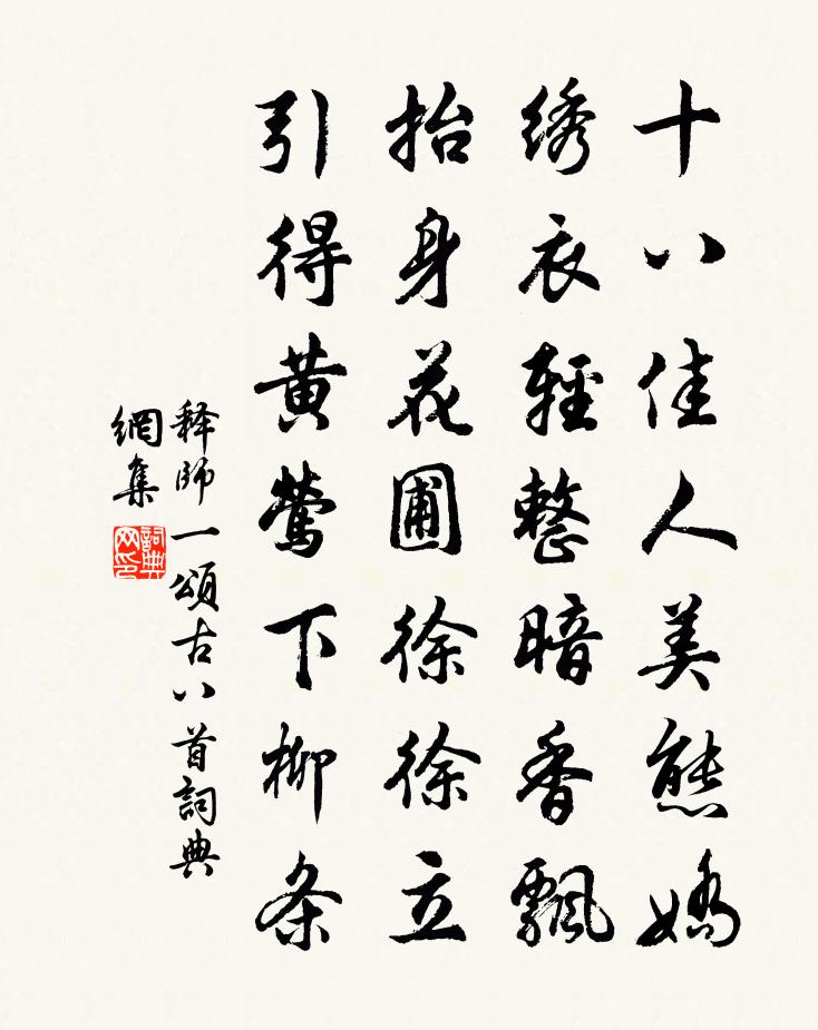 詩詞名句歷史字典書法欣賞書法字典國語詞典說文解字康熙字典古漢語字典標 題 作 者 詩 句 頌古八首作者:釋師一 朝代:宋代頌古八首原文十八佳人美態嬌,繡衣輕整暗香飄。抬身花圃徐徐立,引得黃鶯下柳條。詩詞問答問:頌古八首的作者是誰?答:釋師一問:頌古八首寫於哪個朝代?答:宋代釋師一頌古八首書法欣賞頌古八首書法作品詩詞推薦寄遷客張祜〔唐代〕萬里南遷客,辛勤嶺路遙。溪行防水弩,野店避山魈。瘴海須求藥,貪泉莫舉瓢。但能堅志義,白日甚昭昭。春詞二首張琰〔唐代〕垂柳鳴黃鸝,關關若求友。春情不可耐,愁殺閨中婦。日暮登高樓,誰憐小垂手。昨日桃花飛,今朝梨花吐。春色浣溪沙黃庭堅〔宋代〕飛鵲台前暈翠蛾。千金新買帝青螺。最難如意為情多。幾處淚痕留醉袖,一春愁思近橫波。遠山低盡不成歌。頌古四十八首釋慧開〔宋代〕描不成兮畫不就,贊不及佤休生受。本來面目沒處藏,世界壞時渠不朽。講德陳情上淮南李僕射八首許棠〔唐代〕天降賢人佐聖時,自然聲教滿華夷。英明不獨中朝仰,清重兼聞外國知。涼夜酒醒多對月,曉庭公退半吟詩。梁城句張釜〔宋代〕回首重陽嗟。泰山樑甫行曹植〔魏晉〕八方各異氣,千里殊風雨。劇哉邊海民,寄身於草墅。妻子象禽獸,行止依林阻。柴門何蕭條,狐兔翔我宇。傾杯樂(散水調)柳永〔宋代〕樓鎖輕煙,水橫斜照,遙山半隱愁碧。片帆岸遠,行客路杳,簇一天寒色。楚梅映雪數枝艷,報青春訊息。年華夢偈頌一百零一首釋慧性〔宋代〕春山青,春水綠。草葺葺,花簇簇。若能喪盡目前機,便見廬山真面目。高唐賦宋玉〔先秦〕昔者楚襄王與宋玉游於雲夢之台,望高之觀,其上獨有雲氣,崪兮直上,忽兮改容,須臾之間,變化無窮。王問玉重答柳柳州劉禹錫〔唐代〕弱冠同懷長者憂,臨岐回想盡悠悠。耦耕若便遺身老,黃髮相看萬事休。夢平山方岳〔宋代〕擊楫濤江二十春,平生蹤跡已成陳。秋城一別芙蓉老,夜柝幾番楊柳新。社燕欲歸仍擇木,佛霾不死每驚塵。如聞種竹張嵲〔宋代〕屏居倦幽獨,出門無所適。種竹滿前庭,坐玩凌寒色。森森密陰淨,竦竦條幹直。晴日借景光,霜風時盪析。自我題劉道士奉真亭梅堯臣〔宋代〕降真瀋水生爐煙,扣齒曉漱華池泉。心存昆閬未可到,夜瞻北斗何聯聯。顧茲虛室如有遲,一草一石幽且妍。芝蓋夜雨白居易〔唐代〕早蛩啼復歇,殘燈滅又明。隔窗知夜雨,芭蕉先有聲。綺霞峰陳岩〔宋代〕欲識晴嵐熊度奇,直須待到夕陽時。回光倒影山如染,狀出餘霞散綺詩。虞美人陳允平〔宋代〕彩雲別後房櫳悄。愁立西風曉。倚闌無語對黃花。惆悵玉郎應在、楚江涯。鈿箏空貯芳塵滿。寂寞朱弦斷。夜來一蝶戀花·豆蔻梢頭春色淺謝逸〔宋代〕豆蔻梢頭春色淺,新試紗衣,拂袖東風軟。紅日三竿簾幕卷,畫樓影里雙飛燕。攏鬢步搖青玉碾,缺樣花枝,葉葉感懷陸游〔宋代〕老病與世絕,屏跡三家村。我居一何陋,舉手屋可捫。客至不能迎,堅坐度朝昏。一窗修竹下,超然傲羲軒。外物家居三首孔武仲〔宋代〕曉色奪燈焰,秋寒侵薄帷。漏衛吟思斷,風從魂夢歸。萬慮不嬰抱,一心初息機。都忘塵土上,裘馬門輕肥。名句推薦可譽而不譽,非仁也。墨子《墨子·46章 耕柱》 汗血每隨邊地苦,蹄傷不憚隴陰寒。萬楚《驄馬》 石壕村里夫妻別,淚比長生殿上多。袁枚《馬嵬》 愛棄發之費,而忘長發之利,不知權者也。韓非及後人《韓非子·六反》 尋桃覓柳,開遍南枝未覺。辛棄疾《瑞鶴仙·賦梅》 漁父天寒網罟凍,莫徭射雁鳴桑弓。杜甫《歲晏行》 天公見玉女,大笑億千場。李白《短歌行》 獨抱濃愁無好夢,夜闌猶剪燈花弄。李清照《蝶戀花·暖雨晴風初破凍》 浮天滄海遠,去世法舟輕。錢起《送僧歸日本》 人歸山郭暗,雁下蘆洲白。韋應物《夕次盱眙縣》
