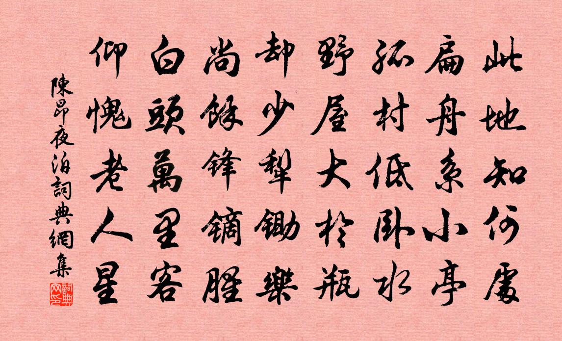 詩詞名句歷史字典書法欣賞書法字典國語詞典說文解字康熙字典古漢語字典標 題 作 者 詩 句 夜泊作者:陳昂 朝代:明代夜泊原文此地知何處?扁舟系小亭。孤村低臥水,野屋大於瓶。卻少犁鋤樂,尚余鋒鏑腥。白頭萬里客,仰愧老人星。詩詞問答問:夜泊的作者是誰?答:陳昂問:夜泊寫於哪個朝代?答:明代問:夜泊是什麼體裁?答:五律陳昂夜泊書法欣賞夜泊書法作品詩詞推薦次顏博士游紫羅洞五首李若水〔宋代〕休著青衫謁五侯,徑覓拄杖山中游。故山別來鬢毛禿,一飽累人成久留。碧嶂巉巉雲影底,儻得破茅甘老此。孤猿生查子管鑒〔宋代〕天教百媚生,賦得多情怨。背整玉搔頭,寬了黃金釧。情隨歌意深,故故回嬌眄。不是不相知,只為難相見。禁菸留題錦屏山下四首邵雍〔宋代〕滿川桃李弄芳妍,不忍重為風所殘。忍使一年春遂去,盡憑高處與盤桓。逍遙詠宋太宗〔宋代〕大道逢來是宿緣,終期定可訪真仙。山中修煉非州郡,城裡無荒隱市鄙鄽。秘術豈教容易得,幽深還許遞相傳。超臨江仙(贈送)蘇軾〔宋代〕詩句端來磨我鈍,鈍錐不解生芒。歡顏為我解冰霜。酒闌清夢覺,春草滿地塘。應念雪堂坡下老,昔年共采芸香。病起吟殘菊石介〔宋代〕病起重陽過,東離菊尚黃。殷勤擷寒蕊,子細嗅清香。老梗防閒蝶,清油護曉霜,叢邊強一酌,聊不負秋光。次姜堯章餞徐南卿韻二首陳造〔宋代〕姜郎未仕不求田,倚賴生涯九萬箋。稛載珠璣肯分我,北關當有合肥船。三用妙沙字韻簡叔剛孫應時〔宋代〕雄心八駿騁流沙,猛氣千人廢咄嗟。總有畫圖堪嘆息,應無大藥駐容華。田園終勝為形役,餐飯聊須努力加。此語採桑曲武衍〔宋代〕道是蠶忙未是忙,日長猶得事梳妝。羅敷有語何曾解,倚樹 * 馬上郎。卜運算元(丙午春即席和從善)趙師俠〔宋代〕楊柳褪金絲,艷杏搖紅影。欲雨還晴二月天,春色渾無定。曉夢不堪驚,午晝新來永。一掬歸心萬疊愁,空惹長亭和君倚日本刀歌司馬光〔宋代〕昆吾道遠不復通,世傳切玉誰能窮。寶刀近出日本國,越賈得之滄海東。魚皮裝巾香木鞘,黃白間雜鍮與銅。百金送王亞之曾幾〔宋代〕執手河梁有贈言,檣烏端為小留連。無風浪起勤看客,不盡江來穩放船。煙雨樓台空夢到,雲天鴻雁只書傳。不須句胡銓〔宋代〕萬古嗟無盡,千生笑有窮。答孔周翰求書與詩蘇軾〔宋代〕身閒曷不長閉口,天寒正好深藏手。吟詩寫字有底忙,未脫多生宿塵垢。不蒙譏訶子厚疾,反更刻畫無鹽醜。征西百字謠 海棠周權〔元代〕輕陰滯雨,正社燕新來,東風院落。十萬紅妝梳洗罷,翠袖春寒猶薄。富貴天姿,風流睡足,酒暈潮紅玉。個般艷句楊炎正〔宋代〕柴門引徑斜。次韻信表弟喭梅之作李彌遜〔宋代〕萬點隨風更是愁,從教停雪破除休。蓬萊花使漫青眼,姑射神人新白頭。待價瓊瑰聊可擬,聞風桃李亦增羞。看殘木蘭花/玉樓春晏幾道〔宋代〕風簾向曉寒成陣。來報東風訊息近。試從梅蒂紫邊尋,更繞柳枝柔處問。來遲不是春無信。開晚卻疑花有恨。又應郭補生朝李石〔宋代〕汾陽家世郎官星,百里隱隱聞雷聲。德人所至有別樣,不向尺箠求能名。上官嗔罵吏束濕,日下廩庾堆如京。此時答俞秀老王安石〔宋代〕諸偶緣安有,實相非相偶。雖神如季鹹,終亦失而走。名句推薦鳥銜野田草,誤入枯桑里。李白《樹中草》 老母與子別,呼天野草間。李白《豫章行》 清明上巳西湖好,滿目繁華。歐陽修《採桑子·清明上巳西湖好》 少小離家老大回,鄉音無改鬢毛衰。賀知章《回鄉偶書二首·其一》 便縱有千種風情,更與何人說?柳永《雨霖鈴·寒蟬淒切》 遷客此時徒極目,長洲孤月向誰明。李白《鸚鵡洲》 坐蔭從容煩暑退,清心恍惚微香觸。陸容《滿江紅·詠竹》 何當擊凡鳥,毛血灑平蕪。杜甫《畫鷹》 萬馬不嘶,一聲寒角,令行柳營。劉過《沁園春·張路分秋閱》 禮,經國家,定社稷,序民人,利後嗣左丘明《左傳·隱公·隱公十一年》