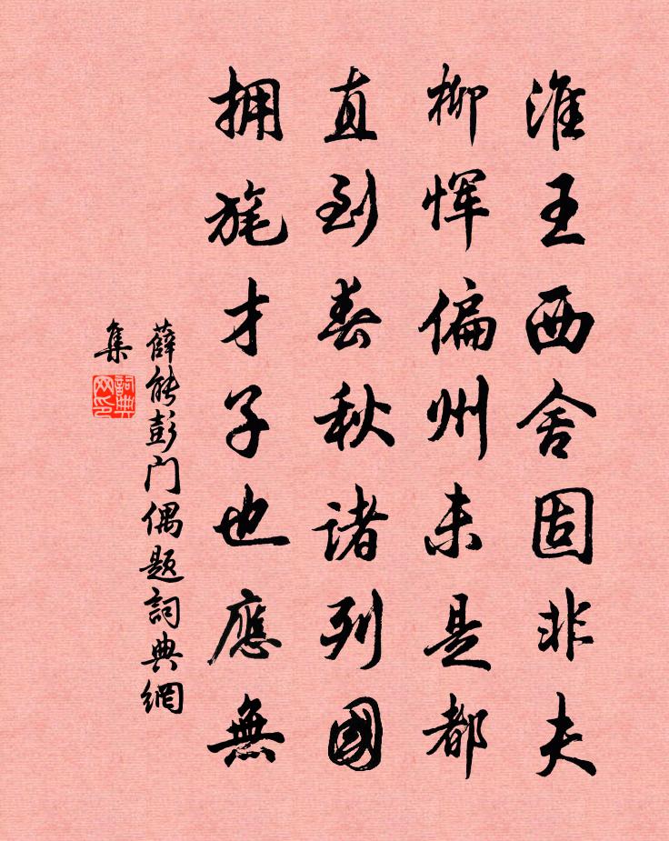詩詞名句歷史字典書法欣賞書法字典國語詞典說文解字康熙字典古漢語字典標 題 作 者 詩 句 彭門偶題作者:薛能 朝代:唐代彭門偶題原文淮王西舍固非夫,柳惲偏州未是都。直到春秋諸列國,擁旄才子也應無。詩詞問答問:彭門偶題的作者是誰?答:薛能問:彭門偶題寫於哪個朝代?答:唐代問:彭門偶題是什麼體裁?答:七絕薛能彭門偶題書法欣賞彭門偶題書法作品注釋全唐詩:卷561-76詩詞推薦題劉氏綠映亭二首呂祖謙〔宋代〕鷺浴魚跳在鏡屏,搖青浮碧太鮮明。牆東種得陰成幄,隔葉看來卻有情。劣隱白玉蟾〔宋代〕世態炎涼覺鼻酸,洞門空掩綠煙寒。仗三尺劍臨風舞,把一張琴對月彈。斫竹數竿容水過,倚松半日執經看。山林睹丞相曾公為桂帥時經過留題黃朝散〔宋代〕龍巖重到臘殘天,欲訪丹成行滿仙。因睹曾公題刻妙,氣騰忠誼拂雲煙。望蓬萊王哲〔元代〕真大道,能結坎和離。認取五行不到處,須知父母未生時。此理勿難知。須速省,下手便修持。上有三光常照耀,一百八盤范成大〔宋代〕疇昔辭桂林,自謂已出嶺。蛻蟬蠻煙中,恍若醉夢醒。今來峽山路,步步躡雲頂。仍聞蚯蚓瘴,顧與嶠南等。平生芭蕉三首楊萬里〔宋代〕檐牙窗額兩三株,只欠王維畫雪圖。開卷不題元字腳,碧窗圜蠟有如無。午憩二首楊萬里〔宋代〕嫩綠桐陰夾道遮,爛紅野果壓枝斜。日烘細草香無價,況有三枝兩朵花。漁家傲歐陽修〔宋代〕四月芳林何悄悄。綠陰滿地青梅小。南陌採桑何窈窕。爭語笑。亂絲滿腹吳蠶老。宿酒半醒新睡覺。雛鶯相語匆匆頌古七首釋祖璇〔宋代〕指出長生地不迷,造成無縫塔巍巍。大家從此無餘事,渴飲飢餐且度時。甘露亭詩李覯〔宋代〕乾坤父母莫匪慈,胚胎億兆成角覊。其間哺乳不及處,有時泣殺呱呱兒。南川上游號沃野,景佑丙子嘗凶飢。新田以湖州酥秀州木犀面油太和石本觀音像送莫萬趙蕃〔宋代〕天教桂蕊擅秋分,只道非秋無復存。底事蘭開梅落際,忽於膏飾見追魂。送傅守歸劉宰〔宋代〕北渚有狂士,病臥忘四時。綠暗知春晚,葉落識秋期。西風日已高,凝露方自茲。獨有歲寒心,不負流水知。贈趙去華陸游〔宋代〕趙子毫端萬斛珠,眼前百輩不枝梧。盛名豈待它年見,公論何曾一日無?我老杜門惟足睡,君豪折簡固難呼。此詩懷謹常三首吳則禮〔宋代〕吾有銅鼎湯,快瀹龍焙香。政使澆舌本,君無問糟床。次黃存之東皋韻黃文雷〔宋代〕藝木東皋下,新榮冒水涯。錦機分箔鬧,青子亞枝斜。犢角初生筍,龍鬚正引瓜。吸清雙玉井,留客品嘗茶。寄題吳介夫專壑七詠止宿劉學箕〔宋代〕大路古茅屋,問津欲何從。雞黍相款留,賢哉植杖翁。送南頓胡簿宋祁〔宋代〕密雪妍辭盛,垂窗怒翼開。聊從百里佐,初露七年材。集隼趨侯府,歌驪酬客罍。時年無道茀,庇邑邇天台。楚天遙帶過清江引薛昂夫〔元代〕屈指數春來,彈指驚春去。蛛絲網落花,也要留春住。幾日喜春晴,幾夜愁春雨。六曲小山屏,題滿傷春句。春若夜遊宮王哲〔元代〕身向深出寄寄。步青峰、恣情如意。冷即草衣慵即睡。囗餐松,渴來後,飲綠水。養就神和氣。自不寒不飢不寐。朝日張耒〔宋代〕朝日照山堂,流光泛疏牖。龍鍾病童子,掃地起持帚。堂中空四壁,惟一老病叟。蕭條野僧閒,鄙朴老農陋。雨來名句推薦臣聞君子樂得其志,小人樂得其事。姜子牙《六韜·文韜·文師》 獨有宦遊人,偏驚物候新。杜審言《和晉陵陸丞早春遊望》 節用儲蓄,以備凶災范曄《後漢書·本紀·肅宗孝章帝紀》 人過留名,雁過留聲。佚名《增廣賢文·下集》 律回歲晚冰霜少,春到人間草木知。張栻《立春偶成》 落魄江南載酒行,楚腰纖細掌中輕。杜牧《遣懷》 君子恥其言而過其行。孔子弟子《論語·憲問篇》 憶共錦衾無半縫,郎似桐花,妾似桐花鳳。王士禎《蝶戀花·和漱玉詞》 千虛不如一實。馮夢龍《警世通言·卷三》 自聞穎師彈,起坐在一旁。韓愈《聽穎師彈琴》