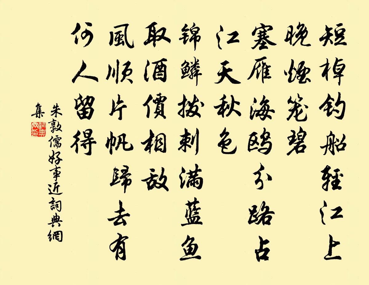 詩詞名句歷史字典書法欣賞書法字典國語詞典說文解字康熙字典古漢語字典標 題 作 者 詩 句 好事近作者:朱敦儒 朝代:宋代好事近原文短棹釣船輕,江上晚煙籠碧。塞雁海鷗分路,占江天秋色。錦鱗撥刺滿藍魚,取酒價相敵。風順片帆歸去,有何人留得。詩詞問答問:好事近的作者是誰?答:朱敦儒問:好事近寫於哪個朝代?答:宋代問:好事近是什麼體裁?答:詞問:朱敦儒的名句有哪些?答:朱敦儒名句大全朱敦儒好事近書法欣賞好事近書法作品詩詞推薦郊廟歌辭。祭太社樂章。肅和佚名〔唐代〕后土凝德,神功協契。九域底平,兩儀交際。戊期應序,陰墉展幣。靈車少留,俯歆樽桂。念奴嬌鄭達可〔宋代〕嫩涼如水,正一天風露,秋容如沐。明日中秋今夜月,千里清輝光足。周室姬公,唐家元軌,來享人間福。老人星宮詞王珪〔唐代〕玉兔何年上月宮,夜間搗藥特無蹤。神丹不老姮娥鬢,乞取刀圭駐玉容。歲暮磧外寄元撝岑參〔唐代〕西風傳戍鼓,南望見前軍。沙磧人愁月,山城犬吠雲。別家逢逼歲,出塞獨離群。發到陽關白,書今遠報君。宮詞王仲修〔宋代〕卷幕風來滿殿涼,暉暉紅日上迴廊。郢坊初進酴醾酒,別是人間一種香。酬進士秦顒若李鹹用〔唐代〕鶯默平林燕別軒,相逢相笑話生前。低飛旅恨看霜葉,曲寫歸情向暮川。在野孤雲終捧日,朝宗高浪本蒙泉。何勞偶作二首白玉蟾〔宋代〕露滴中宵月,松搖古谷風。三身紅萏菡,四智碧芙蓉。讀劉蕡策陳洎〔宋代〕藥石危言治亂箴,賈生晁錯是知音。可憐當日司文者,不畏人言合愧心。孺人陳氏輓詞樓鑰〔宋代〕令子齊年好,相從識壺彜。蕭生結綬日,孟母卜鄰時。未下升堂拜,俄聞陟屺悲。天涯致芻束,淚落薤歌辭。上冢方岳〔宋代〕一杯麥飯灑悲辛,不盡煙蕪舊與新。地下豈無擔板漢,世間但有乞墦人。荼蘼芍藥幾何日,寒食清明又一春。自是秋雨簡劉主簿宋伯仁〔宋代〕秋到天涯未兩旬,西風無日不霖霪。數行新雁千門曉,十幅輕帆萬里心。落宦只宜聞早去,長淮未許作狂吟。江南楊尚書和晴字韻詩適趨部宿再韻謝之魏了翁〔宋代〕冬令陰陰我獨晴,世間寒暑本思成。玉珂金鑰聲中睡,無限山林入耳聲。頌古一百則釋正覺〔宋代〕扇子破,索犀牛,棬攣中字有來由。誰知桂轂千年魄,妙作通明一點秋。與雲耕重會復別釋文珦〔宋代〕久別思見面,重逢反成悲。相持問年紀,各在桑榆時。道途筋力殘,玄發成素絲。時命苟不遭,有才亦奚為。榮華漢宮春(吳侍郎生日)劉克莊〔宋代〕此老先生,尚不留東閣,肯博西涼。我儂爭敢,來近思曠之旁。朱顏未改,絕勝如、蔡義張蒼。元自有,安丹灶地花村六韻吳融〔唐代〕地勝非離郭,花深故號村。已憐梁雪重,仍愧楚雲繁。山近當吟冷,泉高入夢喧。依稀小有洞,邂逅武陵源。月好鷓鴣天朱敦儒〔宋代〕我是清都山水郎。天教分付與疏狂。曾批給雨支風券,累上流雲借月章。詩萬首,酒千觴。幾曾著眼看侯王。玉樓得道陽王哲〔元代〕得道陽來得道陽。自然碧洞雲房。玉訣雲符清氣爽,金丹大藥勝衣裝。豈似人間輕薄郎。徒夸黃白滿箱筐。我寶三同劉貢甫學士登石鼓合江亭一首張舜民〔宋代〕乘興俄成石鼓游,可堪搖落楚江秋。岩中名字今何在,亭下瀟湘古亦愁。萬里再驚金馬客,一家重上木蘭舟。卻令送傑老住仙遊唐士恥〔宋代〕中庭可明月,況此方揚輝。霏譚隔千里,使我幾忘歸。名句推薦君看石芒碭,掩淚悲千古李白《丁督護歌》 青山飛起不壓物,野水流來欲濕人牛殳《琵琶行》 江暗雨欲來,浪白風初起。何遜《相送》 得成比目何辭死,願作鴛鴦不羨仙。盧照鄰《長安古意》 孝有三:大孝尊親,其次弗辱,其下能養。戴聖《禮記·祭義》 分明小像沉香縷,一片傷心欲畫難。納蘭性德《於中好·送梁汾南還為題小影》 窮巷多怪,曲學多辯。愚者之笑,智者哀焉;狂夫之樂,賢者喪焉。商鞅《商君書·更法》 聞人善則疑之,聞人惡則信之,此滿腔殺機也。陳繼儒《小窗幽記·集靈篇》 夜來風雨聲,花落知多少。孟浩然《春曉》 風雨滿城,何幸兩重陽之近;文天祥《回董提舉中秋請宴啟》