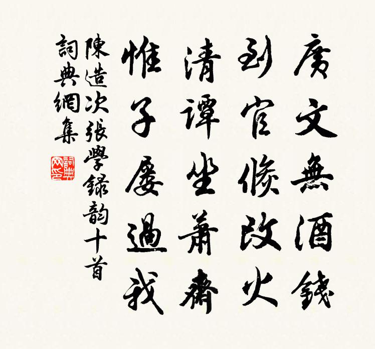 詩詞名句歷史字典書法欣賞書法字典國語詞典說文解字康熙字典古漢語字典標 題 作 者 詩 句 次張學錄韻十首作者:陳造 朝代:宋代次張學錄韻十首原文廣文無酒錢,到官倏改火。清譚坐蕭齋,惟子屢過我。詩詞問答問:次張學錄韻十首的作者是誰?答:陳造問:次張學錄韻十首寫於哪個朝代?答:宋代陳造次張學錄韻十首書法欣賞次張學錄韻十首書法作品詩詞推薦題劍灘陳宓〔宋代〕山在溪中水在山,人生何處鬼門關。數聲柔櫓風雷外,一葉輕舟劍戟間。為問片時驚陷溺,何如竟日緩躋攀。信知目痛一月未愈自和前九首劉克莊〔宋代〕乍可頻看短劍,渠肯高張長檠。已與鷗盟浩蕩,都忘鵠立通明。宋人及楚人平公羊高〔先秦〕外平不書,此何以書?大其平乎己也。何大其平乎己?莊王圍宋,軍有七日之糧爾!盡此不勝,將去而歸爾。於是題劉民用居士藏六庵釋曇華〔宋代〕虛空正體沒邊涯,藏六如何蓋覆伊。要聽少林無孔笛,從來多是逆風吹。和王子元過大庾嶺余靖〔宋代〕秦皇戍五嶺,茲為楚越隘。尉佗去黃屋,舟車通海外。峭巘倚雲漢,推輪日傾害。賢哉張令君,鐫鑿濟行邁。地失宿華陰東郭客舍憶閻防岑參〔唐代〕次舍山郭近,解鞍鳴鐘時。主人炊新粒,行子充夜飢。關月生首陽,照見華陰祠。蒼茫秋山晦,蕭瑟寒松悲。久從至後承元煇見和複次韻書病中近況十首方回〔宋代〕往事付杯酒,殘生余幅巾。更須占大衍,久已玩同人。犒少傭奴懶,迎遲過客嗔。悔曾迷宦海,素不媚錢神。次韻曾帥遣意三首郭印〔宋代〕文章遊戲裡,政事笑談餘。種就三田藥,編成一帙書。情忘心自適,神定氣長舒。四海曾人子,何人可學歟。和唐秘校見貽長篇吳儆〔宋代〕君才離奇臥壑松,力回萬牛匠非哲。我如坎井可窺底,短綆未汲固自竭。饑寒驅置簿領中,巧匠旁觀指濡血。逢人嚴陵方巾華岳〔宋代〕浮雲掃盡天宇清,千花萬花開錦屏。好風吹皺一池綠,白鳥點破千山青。客行五里復五里,兩眼丹青間紅紫。杖屨奉懷羅仲共叔共二友李彌遜〔宋代〕征衫一著字溪東,結友何人繼兩龔。寸步相期偶胡越,尺書不斷見心胸。吟邊快睹推三語,吏退冥搜想二松。別後故鄉除夜周弘亮〔唐代〕三百六十日雲終,故鄉還與異鄉同。非唯律變情堪恨,抑亦才疏命未通。何處夜歌銷臘酒,誰家高燭候春風。詩成失調名佚名〔宋代〕鼎里坎離,壺中天地,滿懷風月,一吸虛空。塵寰里,何人識我,開口問鴻濛。雲中。三弄笛,岳陽樓外,天遠霞寒食寓懷梁顥〔宋代〕明日一百五,春風余幾何。愁隨新火出,病憶故人多。草色牆陰合。花香宿雨和。耿懷殊不寐,終夕扣壺歌。暮春寄元九白居易〔唐代〕梨花結成實,燕卵化為雛。時物又若此,道情復何如。但覺日月促,不嗟年歲徂。浮生都是夢,老小亦何殊。唯與雜詠一百首張說劉克莊〔宋代〕玉檢匪頒隆,珠簾餽遺通。更揮諛墓筆,褒讚死姚崇。好事近呂渭老〔宋代〕長記十年前,彼此玉顏雲發。尊酒幾番相對,樂春花秋月。而今各自困飄零,憔悴幾年別。說著大家煩惱,且大家懷溪雲壑釋文珦〔宋代〕夜深台殿閉,空室自安禪。松頂掛寒月,竹根鳴暗泉。理方因靜勝,道不在言傳。溪友同知此,今居何處邊。益壽美金花侯善淵〔元代〕忘形遺照。無垢清虛真至妙。物外霞輝。天岸波澄混太微。列開丹竅。悟入重玄明總要。出化星儀。風御靈飆易象和關子東筇杖王之望〔宋代〕老境生涯正倚君,周旋夷險共悲欣。最憐磊磊多高節,未肯斑斑出異文。漢閣燈來徒照夜,葛陂龍去謾拿雲。願為名句推薦感時花濺淚,恨別鳥驚心。杜甫《春望》 天地有正氣,雜然賦流形。文天祥《正氣歌》 枯木逢春猶再發,人無兩度再少年。佚名《增廣賢文·上集》 慘慘時節盡,蘭葉復凋零。徐幹《室思》 欲系青春,少住春還去。朱淑真《蝶戀花·送春》 雨窗和淚搖湘管。意長箋短。許棐《後庭花·一春不識西湖面》 雲無心以出岫,鳥倦飛而知還。陶淵明《歸去來兮辭·並序》 誠者,非自成己而已也。所以成物也。成己仁也。成物知也。性之德也,合外內之道也。故時措之宜也。子思《中庸·第二十五章》 積雪覆平皋,飢鷹捉寒兔。孟浩然《南歸阻雪》 綠葉陰濃,遍池亭水閣,偏趁涼多。元好問《驟雨打新荷》