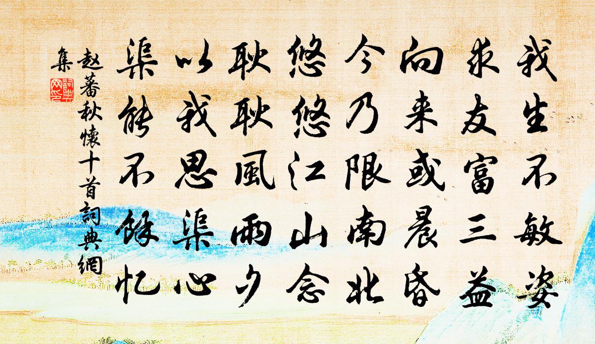詩詞名句歷史字典書法欣賞書法字典國語詞典說文解字康熙字典古漢語字典標 題 作 者 詩 句 秋懷十首作者:趙蕃 朝代:宋代秋懷十首原文我生不敏姿,求友富三益。向來或晨昏,今乃限南北。悠悠江山念,耿耿風雨夕。以我思渠心,渠能不余憶。詩詞問答問:秋懷十首的作者是誰?答:趙蕃問:秋懷十首寫於哪個朝代?答:宋代趙蕃秋懷十首書法欣賞秋懷十首書法作品詩詞推薦千秋歲(次韻兵曹席孟惠廨黃梅)葉夢得〔宋代〕曉煙溪畔。曾記東風面。化工更與重裁翦。額黃明艷粉,不共妖紅軟。凝露臉。多情正似當時見。誰相滄波岸。特初夏朱淑真〔宋代〕竹搖清影罩幽窗,兩兩時禽噪夕陽。謝卻海棠飛盡絮,困人天氣日初長。三鳥詠之二竹雞詞賀鑄〔宋代〕東南澤國陂塘闊,旱歲少逢晴五月。田間蛙喜雨冥冥,竹下雞啼泥滑滑。而予不耕陂下田,田皋驅馬揮長鞭。稻塍九日三首蘇轍〔宋代〕狂夫老無賴,見逐便忘歸。小酌還成醉,僑居不覺非。妻孥應念我,風雨未縫衣。憂患十年足,何時賦式微。偈頌七十二首釋祖欽〔宋代〕西來十萬路迢迢,智鑒當軒影莫逃。四海浪平龍睡千穩,九霄雲淨鶴飛高。闕題釋文珦〔宋代〕眾患皆因有欲,一閒全得無聞。心定常如止水,身安不喜行雲。獻高駢佚名〔唐代〕我昔勝君昔,君今勝我今。人生一世事,何用苦相侵。登樓對雪二首張嵲〔宋代〕冰花不省如斯暴,疑是吹沙打夜窗。莫遣沉陰增敵氣,且將盈尺作農祥。求心齋詹初〔宋代〕生生天地心,吾人秉其真。虛靈無一物,純然惟元仁。如何彼放失,物慾共沉淪。客感乃為主,本主翳埃塵。鑒此牧牛兒陸游〔宋代〕溪深不須憂,吳牛自能浮。童兒踏牛背,安穩如乘舟。寒雨山陂遠,參差煙樹晚。聞笛翁出迎,兒歸牛入圈。送任師中任清江蘇洵〔宋代〕吾老尚喜事,羨君方少年。有如伏櫪馬,看彼始及鞍。奔騰過吾目,蕭條正思邊。誰知脫吾羈,傲睨登太山。君今謁告之楚出都間晚泊張耒〔宋代〕馬跡不在眼,浪聲初泊船。蒼禾荒霽澤,紅樹表霜川。淮海南浮地,星辰北拱天。東方聊一飽,楚稻不論錢。順寧憶弟王遂〔宋代〕猶憐膝下競兒嬉,歲月光陰去若馳。閒倚闌乾思舊事,卻如故老話淳熙。桃源洞毛漸〔宋代〕洞門流水日潺潺,桃塢依然枕水邊。春色年年花自好,遊人誰復遇嬋娟。和圓機題草蟲晁說之〔宋代〕怒劍無煩起逐蠅,從教小物此馮陵。禮加蛙臂何時用,書到蠶頭幾日能。半是苔邊徒有感,全收芋處肯生憎。如椽醜奴兒/採桑子陳允平〔宋代〕歲寒時節千林表,獨耐風霜。妒粉欺黃。澹澹衣裳薄薄妝。西湖十二闌乾曲,倚遍寒香。白鷺橫塘。一片孤山幾夕粘蠔石方翥〔宋代〕累累蠔山著石面,此非所有能無疑。細看大石深孔竅,舟人撐篙跡猶遺。乃知此山千載前,洶湧尚作海渺瀰。蛟龍保聖院陳舜俞〔宋代〕門深鎖蒼苔,地靈育嘉樹。寂然煙雲宅,不接市朝路。苟能灰心居,即是古樂處。別倉使二首陳文蔚〔宋代〕千里江頭訪故人,事雖論舊道彌新。縣知一味憂勤意,要活九州窮困民。秋月洞明波底影,祥風潛有雪中春。荒山謝春旛強至〔宋代〕曉策羸驂趁謝恩,君王昨夜賜春旛。塗金翦彩雖雲異,競戴還同拜禁門。名句推薦已是懸崖百丈冰,猶有花枝俏。 * 《卜運算元·詠梅》 肉腐出蟲,魚枯生蠹。荀子《荀子·勸學》 文章合為時而著,歌詩合為事而作。白居易《與元九書》 相望試登高,心隨雁飛滅。孟浩然《秋登蘭山寄張五》 碧水浩浩雲茫茫,美人不來空斷腸。李白《早春寄王漢陽》 含弘光大,品物鹹亨。佚名《易傳·彖傳上·坤》 天下無難事,只怕有心人。曹雪芹《紅樓夢·第四十九回》 酒醒人靜奈愁濃。殘燈孤枕夢,輕浪五更風。徐昌圖《臨江仙·飲散離亭西去》 君行四月草萋萋,柳花桃花半委泥。納蘭性德《送蓀友》 訪戴歸來,尋梅懶去,獨釣無聊。薛昂夫《蟾宮曲·雪》