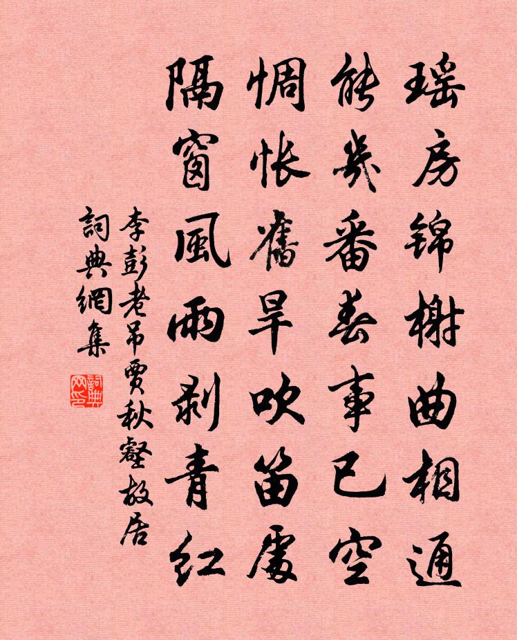 詩詞名句歷史字典書法欣賞書法字典國語詞典說文解字康熙字典古漢語字典標 題 作 者 詩 句 吊賈秋壑故居作者:李彭老 朝代:宋代吊賈秋壑故居原文瑤房錦榭曲相通,能幾番春事已空。惆悵舊旱吹笛處,隔窗風雨剝青紅。詩詞問答問:吊賈秋壑故居的作者是誰?答:李彭老問:吊賈秋壑故居寫於哪個朝代?答:宋代問:吊賈秋壑故居是什麼體裁?答:七絕李彭老吊賈秋壑故居書法欣賞吊賈秋壑故居書法作品詩詞推薦句蘇紳〔宋代〕一篇此日摛鴻藻,五色它年浴鳳文。南柯子/南歌子佚名〔宋代〕花萼清輝近,蓬萊紫氣濃。濮園流慶與天同。生得名駒千里、籋秋風。閱武戈初偃,論文酒不空。摩挲銅狄灞橋東莊宗中原之寶圖贊釋心月〔宋代〕搜尋乾坤宇宙間,中原之寶秘形山。若非呈似老興化,往往人將作等閒。去者日以疏佚名〔兩漢〕去者日以疏,來者日以親。出郭門直視,但見丘與墳。古墓犁為田,松柏摧為薪。白楊多悲風,蕭蕭愁 * 。思還題彭州陽平化徐氏〔唐代〕尋真游勝境,巡禮到陽平。水遠波瀾碧,山高氣象清。殿嚴孫氏貌,碑暗系師名。夜月登壇醮,松風森磬聲。憂患中作姜特立〔宋代〕吉凶既同域,憂喜亦同途。萬緣互起滅,誰能久歡娛。歡娛既不久,悲恨常與俱。唯有嵇阮輩,乃能脫囚抱。一醉過宜陽城二首邵雍〔宋代〕六國區區共事秦,疲於奔命尚難親。如何殺盡半天下,豈是關東沒一人。題秋堂四蘭釋紹曇〔宋代〕娥英吊舜於九疑,泣淚如雨。佩玉零亂,半委塵泥。送甥蔡駰下第還廣平梅堯臣〔宋代〕爾持金錯刀,不入鵝眼貫。已遭俗棄擲,妄意堪憤惋。他時有識別,終必為寶玩。懷之歸河朔,慎勿輒熔鍛。改作上元日劉筠〔宋代〕漢典久傳祠太乙,竺墳亦說會夫人。蟾蜍吐耀祥輪滿,菡萏凝華寶檠新。風轉相竽來帝樂,香焚夾道雜車塵。承平句羅志仁〔宋代〕冷吸蟬吭露,清搖鶴背霜。念始嬌(壽暨乾)黃人傑〔宋代〕挽紅留翠,為東皇、那住二分春色。燕舞迴風鶯度曲,晴晝光生瑤席。天女擎香,長庚入夢,還有飛仙謫。方瞳方句杜甫〔唐代〕君看牆頭桃樹花,儘是行人眼中血。 坐客宋周士忽垂光和復用元韻答之三首強至〔宋代〕風流雙腕轉凝酥,舞徹伊州汗有珠。探手始知簾外冷,照堂獸炭焰圍爐。初冬快晴陪宣卿叔夏遊石頭庵過三生藏窮深極胡寅〔宋代〕游梁屐齒破蒼苔,深沼筇枝駭蟄雷。如海亂山爭起伏,碧波直欲撼蓬萊。生查子·落梅庭榭香晏幾道〔宋代〕落梅庭榭香,芳草池塘綠。春恨最關情,日過闌乾曲。幾時花里閒,看得花枝足。醉後莫思家,借取師師宿。太常引劉秉忠〔元代〕桃花流水鱖魚肥。青*笠,綠蓑衣。風雨不須歸。管甚做、人間是非。兩肩雲衲,一枝筇杖,盡日可忘機。之子欲舟中蘇泂〔宋代〕小睡醒來欲二更,村深那聽鼓鐘聲。舟中反覆無窮事,只道寒天不會明。卦名詩權德輿〔唐代〕節變忽驚春,臨風騁望頻。支頤倦書幌,步履整山巾。時鳥漸成曲,雜芳隨意新。曙霞連觀闕,綺陌麗鹹秦。天地明禋進戒詩程公許〔宋代〕於赫圓宰,視聽自民。惟聖能饗,非德莫親。乃眷炎宋,受命以仁。十月三葉,涵每毓春。德厚流光,施及吾君。名句推薦忠臣不借人以力,貞女不假人以色。劉向《列女傳·貞順傳·楚白貞姬》 大直若屈,大巧若拙,大辯若訥。老子《老子·德經·第四十五章》 平生塞北江南,歸來華發蒼顏。辛棄疾《清平樂·獨宿博山王氏庵》 敗葉填溪水已冰,夕陽猶照短長亭。納蘭性德《浣溪沙·敗葉填溪水已冰》 驚塞雁,起城烏,畫屏金鷓鴣。溫庭筠《更漏子·柳絲長》 酷憐嬌易散,燕子學偎紅。納蘭性德《臨江仙·絲雨如塵雲著水》 離別家鄉歲月多,近來人事半消磨。賀知章《回鄉偶書二首》 高節志凌雲,不敢當滕六。環山樵《薛寶釵·雪竹》 富而不驕,貴而不舒。司馬遷《史記·五帝本紀》 草色青青柳色黃,桃花歷亂李花香。賈至《春思二首·其一》