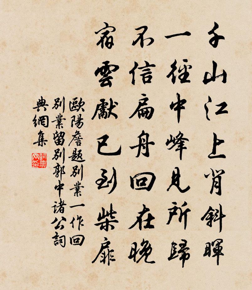 詩詞名句歷史字典書法欣賞書法字典國語詞典說文解字康熙字典古漢語字典標 題 作 者 詩 句 題別業(一作回別業留別郭中諸公)作者:歐陽詹 朝代:唐代原文千山江上背斜暉,一徑中峰見所歸。不信扁舟回在晚,宿雲先已到柴扉。詩詞問答問:《題別業(一作回別業留別郭中諸公)》的作者是誰?答:歐陽詹問:該詩寫於哪個朝代?答:唐代問:該詩是什麼體裁?答:七絕書法欣賞題別業(一作回別業留別郭中諸公)書法作品注釋全唐詩:卷349-73詩詞推薦慶清朝慢李清照〔宋代〕禁幄花低張,雕欄花巧護,就中獨占殘春。客華淡佇,綽約俱見天真。待得群花過後,一番風露曉妝新。妖嬈艷態黃灣書事時虜人犯淮曹勛〔宋代〕海邊鼓角動星辰,我復驅貧近海濱。強對溪山方袖手,不堪梅柳已驚春。新元北客愁邊淚,故國西郊日暮塵。誰與晚到盩厔耆老家盧綸〔唐代〕老翁曾舊識,相引出柴門。苦話別時事,因尋溪上村。數年何處客,近日幾家存。冒雨看禾黍,逢人憶子孫。亂藤露韓偓〔唐代〕鶴非千歲飲猶難,鶯舌偷含豈自安。光濕最宜叢菊亞,盪搖無奈綠荷乾。名因霈澤隨天眷,分與濃霜保歲寒。五色送趙叔靜教授閩中四首陳傅良〔宋代〕百吏不可試,卷懷州校官。翩然落南閩,不為荔子丹。彫蟲妙經術,倚市多儒冠。吾道未必貴,政此良已難。自合江亭過渡觀趙穆仲園亭何耕〔宋代〕喚舟芳草渡,擊馬綠楊陰。步入莓苔徑,門開花竹林。王孫隨牒遠,婺女隱雲深。想見西南望,悠悠空賞心。贈崔秋浦其一李白〔唐代〕吾愛崔秋浦,宛然陶令風。門前五楊柳,井上二梧桐。山鳥下廳事,檐花落酒中。懷君未忍去,惆悵意無窮。有感趙崇嶓〔宋代〕舞罷歌停歲月深,當時勝跡盡銷沉。飛雲捲雨人爭賞,留得佳名尚到今。殢人嬌向子諲〔宋代〕白似雪花,柔於柳絮。胡蝶兒、鎮長一處。春風駘蕩,驀然吹去。得遊絲、半空惹住。波上精神,掌中態度。分明題鶴鳴泉曹松〔唐代〕仙鶴曾鳴處,泉兼半井苔。直峰拋影入,片月瀉光來。瀲灩侵顏冷,深沉慰眼開。何因值舟頂,滿汲石瓶回。郊廟歌辭。祭太社樂章。舒和佚名〔唐代〕神道發生敷九稼,陰極乘仁暢八埏。緯武經文隆景化,登祥薦祉啟豐年。晨霜客路曾豐〔宋代〕臥駭窗紗已報明,籃輿札札破霜行。踏開凍淖瓊漿溜,搖動凝梢玉屑傾。山色喜人猶念舊,鳥聲冤客不留情。從今再次韻後篇戲朱陳造〔宋代〕似聞新醖敵宜城,想對檐花又獨傾。別乘工為海鯨吸,廣文當念露蟬清。投醪頻遣春浮頰,盜印寧無夜闖營。約束次韻石七三六言七首黃庭堅〔宋代〕萬里草荒先壟,六年蟲蠹群經。老喜寬恩放去,心似驚波不停。種柳宋自遜〔宋代〕短研深煨倒插宜,明年便有綠垂垂。只因因造化容易,不見歲寒冰雪時。叔孫通徐鈞〔宋代〕秦府藏書熟見聞,三王遺意可追尋。如何綿蕞因秦陋,古禮淪亡恨到今。庭鶴釋智圓〔宋代〕支遁放君真有意,衛公憐汝太無端。司晨守禦那堪用,殷頂霜毛祇好看。盛山十二詩茶嶺韋處厚〔唐代〕顧渚吳商絕,蒙山蜀信稀。千叢因此始,含露紫英肥。歸路過南溪橋二首楊萬里〔宋代〕愛他風物重徘徊,歸路遲遲卻快哉。曲折緣溪非細好,忽逢斷岸卻回來。右丞李相公自洛移鎮河陽梅堯臣〔宋代〕侯服花齊三輔,花天台聳百僚。新章刻花虎,舊德冠金貂。已作歌襦化,方期執玉朝。雙鞬辭洛宅,千騎向河橋。名句推薦夜覺曉非,今悔昨失顏之推《顏氏家訓·序致篇》 吞舟之魚,陸處則不勝螻蟻呂不韋《呂氏春秋·覽·審分覽》 天下不患無臣,患無君以使之。天下不患無財,患無人以分之。管仲《管子·牧民》 天若不愛酒,酒星不在天。李白《月下獨酌四首》 短夢依然江表,老淚灑西州。張炎《八聲甘州·記玉關踏雪事清游》 喧鳥覆春洲,雜英滿芳甸。謝朓《晚登三山還望京邑》 柳下繫舟猶未穩,能幾日、又中秋。劉過《唐多令·蘆葉滿汀洲》 流星飛玉彈,寶劍落秋霜。張玉娘《從軍行》 何當共剪西窗燭,卻話巴山夜雨時。李商隱《夜雨寄北》 同心一人去,坐覺長安空。白居易《別元九後詠所懷》