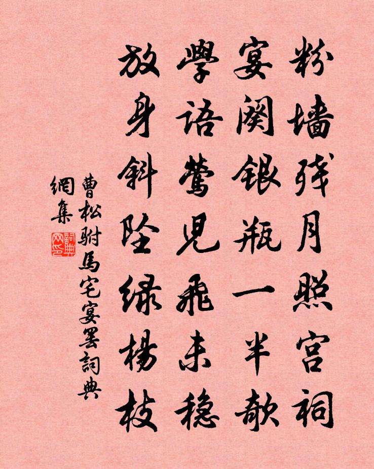 詩詞名句歷史字典書法欣賞書法字典國語詞典說文解字康熙字典古漢語字典標 題 作 者 詩 句 駙馬宅宴罷作者:曹松 朝代:唐代駙馬宅宴罷原文粉牆殘月照宮祠,宴闋銀瓶一半欹。學語鶯兒飛未穩,放身斜墜綠楊枝。詩詞問答問:駙馬宅宴罷的作者是誰?答:曹松問:駙馬宅宴罷寫於哪個朝代?答:唐代問:駙馬宅宴罷是什麼體裁?答:七絕曹松駙馬宅宴罷書法欣賞駙馬宅宴罷書法作品注釋全唐詩:卷717-56詩詞推薦王評事駙馬花燭詩盧綸〔唐代〕萬條銀燭引天人,十月長安半夜春。步障三千隘將斷,幾多珠翠落香塵。一人女婿萬人憐,一夜調疏抵百年。為報句袁韶〔宋代〕宴堂聯族子,講席後諸生。相峰寺曾季貍〔宋代〕一燈投宿阿蘭若,雨過涼生夜氣清。何許秋聲驚客夢,檐間不斷一鈴鳴。三姝媚佚名〔宋代〕薔薇花謝去,更無情、連夜送春風雨。燕子呢喃,似念人憔悴,往來朱戶。漲綠煙深,早零落、點池萍絮。暗憶年自詠白居易〔唐代〕隨宜飲食聊充腹,取次衣裘亦暖身。未必得年非瘦薄,無妨長福是單貧。老龜豈羨犧牲飽,蟠木寧爭桃李春?隨分次韻晁補之廖正一贈答詩黃庭堅〔宋代〕晁子抱材耕谷口,世有高賢踐台斗。頃隨計吏西入關,關夫數日傳車還。封侯半屬妄校尉,射虎猛將猶行間。無因四紋四時楊冠卿〔宋代〕輕風透幕羅衾薄,滿萼嬌紅綴小桃。明月對愁縈錦字,斷弦空暗紫檀槽。禪人寫真求贊釋正覺〔宋代〕誰道物齊,俱亡品題。欺唇一鼻直,蓋眼兩眉低。大千同入印,三世未分畦。斫額望之不及,擬心思也還迷。頌古一百則釋正覺〔宋代〕芥城劫石妙窮初,活眼環中照廓虛。不許夜行投曉到,家音未肯付鴻魚。偈頌二十四首釋智遇〔宋代〕春入湖山,先放花明。御苑人歸上國,南山鶴唳青公。壯皇都人傑地靈,窺紫府洞天風月。木蘭花慢 賦紅梨花王惲〔元代〕愛一枝香雪,幾暮雨,洗妝殘。盡空谷幽居,佳人寂寞,淚粉蘭乾。芳姿似嫌雅淡,問誰將、大藥駐朱顏。塞上胭悼孩子於鵠〔唐代〕年長始一男,心亦頗自娛。生來歲未周,奄然卻歸無。裸送不以衣,瘞埋於中衢。乳母抱出門,所生亦隨呼。嬰孩隨牒至南康軍呈李宰四首曾豐〔宋代〕善刀初不露鋒芒,五柳圍門琴臥堂。百里桑麻春塞眼,四時風月夜搜腸。游九鎖楊伯岩〔宋代〕曉山雲樹碧生秋,乘興間為洞府游。片石卻將仙路隔,負人平昔慕浮丘。述懷華岳〔宋代〕我生胸次不塵埃,不學兒遭遇旬自媒。詩料雖憑風月制,宦途還聽鬼神開。十年教養猷初壯,半世功名念已灰。安游爛柯山羊滔〔唐代〕步登春岩里,更上最遠山。聊見宇宙闊,遂令身世閒。清輝賞不盡,高駕何時還。石樑聳千盡,高盼出林□。亘壑淮西趙漕子固輓詩虞儔〔宋代〕疏搞廷臣右,經傳弟子行。江淮歸德政,蠻貊誦文章。世路風波惡,仙家日月長。西林曾有約,楚挽莫淒涼。感遇之卅六陳子昂〔唐代〕浩然坐何慕。吾蜀有峨眉。念與楚狂子。悠悠白雲期。時哉悲不會。涕泣久漣洏。夢登綏山穴。南采巫山芝。探元閨怨周在〔明代〕江南二月試羅衣,春盡燕山雪尚飛。應是子規啼不到,故鄉雖好不思歸。逢年與德粲同之溫陵謁大智禪師醫作四小詩送洪邁〔宋代〕石樑跨蠔山,永與方壺久。憑君持一杯,往酹濟川手。遙知相攜處,溟渤浸箕斗。作詩問大鈞,猶有斯人否。名句推薦君行逾十年,孤妾常獨棲。曹植《明月上高樓》 黑雲壓城城欲摧,甲光向日金鱗開。李賀《雁門太守行》 良冶之子,必學為裘;良弓之子,必學為箕戴聖《禮記·學記》 兵者詭道,善因事變。房玄齡《晉書·帝紀·第一章》 幼敏悟過人,讀書輒成誦。歐陽修《畫地學書》 隨風潛入夜,潤物細無聲。杜甫《春夜喜雨》 聲樂之入人也深,其化人也速。荀子《荀子·樂論》 風力雖尚勁,然徒步則汗出浹背。袁宏道《滿井遊記》 兒女紛紛夸結束,新樣釵符艾虎。劉克莊《賀新郎·端午》 失之毫釐,差以千里。班固《漢書·傳·東方朔傳》