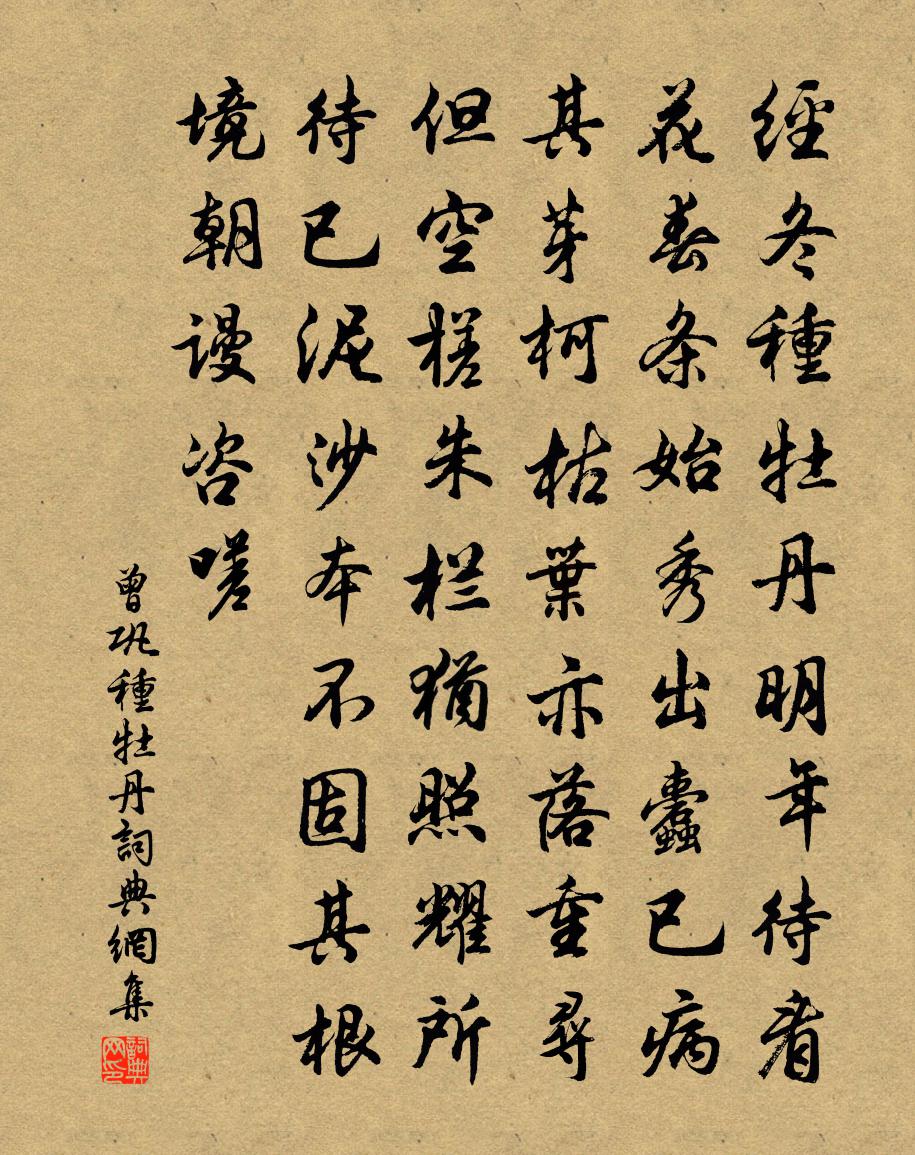 詩詞名句歷史字典書法欣賞書法字典國語詞典說文解字康熙字典古漢語字典標 題 作 者 詩 句 種牡丹作者:曾鞏 朝代:宋代種牡丹原文經冬種牡丹,明年待看花。春條始秀出,蠹已病其芽。柯枯葉亦落,重尋但空槎。朱欄猶照耀,所待已泥沙。本不固其根,境朝謾咨嗟。詩詞問答問:種牡丹的作者是誰?答:曾鞏問:種牡丹寫於哪個朝代?答:宋代曾鞏種牡丹書法欣賞種牡丹書法作品詩詞推薦聲聲慢(和韻賦江梅)李曾伯〔宋代〕修潔孤高,凌霜傲雪,蕭然塵外丰姿。一白無瑕,玉堂茅舍俱宜。飄飄羽衣縞袂,都不染、富貴膏脂。調羹事,看次韻程以忠同飲方回〔宋代〕風雲變化世常有,丘壑盤旋誰與同。駕馭孟嘉真得勢,滑稽方朔浪言工。律嚴詩友何妨少,租薄秋田亦幸豐。兩手正月十八日甘棠院蔡襄〔宋代〕天氣和柔酒更醇,緩歌花底正青春。狂花有意憐醉客,撩亂飛紅滿一身。題菊花冊楊皇后〔宋代〕莫惜朝來準酒錢,淵明身即是花仙。重陽滿滿杯中泛,一縷黃金是一年。清平樂徐逸〔宋代〕風韶雨秀。春已平分後。陡頓故人疏把酒。閒恁畫闌搔首。爭須攜手踏青。人生幾度清明。待得燕慵鶯懶,楊花點送裘父侄還鄉二首曾協〔宋代〕塵外情懷得自由,便推琴鶴上歸舟。露寒月白關心夜,山瘦江清滿意秋。卻背京城無眷戀,去尋古蹟有遲留。奚奴滿庭芳董穎〔宋代〕紅鬥風桃,綠肥菸草,楊柳春暗重門。五陵佳興,釀醞付芳尊。窈窕笙簫叢里,金猊篆、霧繞雲紛。勾情也,歌眉同德麟諸公觀秋風閣自賦詩台乘月泛江李廌〔宋代〕虛閣凌縹緲,危台俯湠漫。憑檻眺落景,倚柱送歸翰。空濛暝色合,戃怳天宇寬。皎皎明月上,炯炯青林端。寂歷禪人並化主寫真求贊釋正覺〔宋代〕默默無思,閒閒不羈。秋濯星河色,風吹月盪漪。二儀前是我,萬像里名誰。似難去取,決定相隨。李郎中輓詩二首魏了翁〔宋代〕太息金泉守,西歸空好音。孳孳求友意,懇懇愛君心。謀道身多阨,憂時力不任。懷人今永已,為世一沾襟。湖闊李群玉〔唐代〕楚色籠青草,秋風洗洞庭。夕霏生水寺,初月盡雲汀。棹響來空闊,漁歌發杳冥。欲浮闌下艇,一到斗牛星。句蔣密〔唐代〕綺羅因片葉,桃李謾同時。夢井元稹〔唐代〕夢上高高原,原上有深井。登高意枯渴,願見深泉冷。裴迴繞井顧,自照泉中影。沉浮落井瓶,井上無懸綆。念此溫泉范成大〔宋代〕砂床毓靈源,石液漱和氣。郁攸甑常蒸,觱沸鼎百沸。人生本無垢,安用滌腸胃。一瓢灩清肥,回首謝羅罻。山深眼兒媚(寓城思歸竹庵留行賦呈)黎廷瑞〔宋代〕暖雲挾雨洗香埃。劃地峭寒催。燕兒知否,鶯兒知否,廝句春回。小樓日日重簾卷,應是把人猜。杏花如許,桃花登頫江三絕趙宰增為四複次韻答之追和陳造〔宋代〕兩夜北風吹石裂,雪神驕蹇更淹留。羈人坐嘆肌生粟,媚白妖紅耐此不。六月八日苦暑二首張耒〔宋代〕羲和午停車,草木靜若萎。我居倦煩促,誰與開我懷。出井泉失冷,迎涼幌空開。翩翩投林羽,饑渴復誰哀。仁哉挽許秋浦馬廷鸞〔宋代〕蒼顏白髮王官谷,綠幕黃簾六館生。閱世舊嗟身偃蹇,懷人新有淚縱橫。送陸暢侍御歸揚州姚合〔唐代〕故園偏接近,霅水洞庭邊。歸去知何日,相逢各長年。山川南北路,風雪別離天。楚色窮冬燒,淮聲獨夜船。從軍黃山雜詠滴水岩鄧宗度〔宋代〕石壁碎寒流,行人暮已愁。更傾風月耳,無水不生秋。名句推薦為有書來與我期,便從蘭杜惹相思。莊棫《定風波·為有書來與我期》 蝸角虛名,蠅頭微利,算來著甚乾忙。蘇軾《滿庭芳·蝸角虛名》 奈南牆冷落,竹煙槐雨。吳文英《惜秋華·七夕前一日送人歸鹽官》 我住長江頭,君住長江尾。李之儀《卜運算元·我住長江頭》 度德而處之,量力而行之左丘明《左傳·隱公·隱公十一年》 此生只是償詩債,白菊開時最不眠。司空圖《白菊雜書四首》 雍雍新雁咽寒聲,愁恨年年長相似。李煜《謝新恩·冉冉秋光留不住》 荷花嬌欲語,愁殺蕩舟人。李白《淥水曲》 江上幾人在,天涯孤棹還。溫庭筠《送人東遊》 人生亦有命,安能行嘆復坐愁?鮑照《擬行路難·其四》
