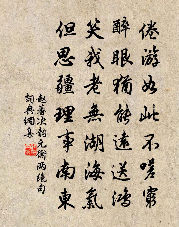 詩詞名句歷史字典書法欣賞書法字典國語詞典說文解字康熙字典古漢語字典標 題 作 者 詩 句 次韻元衡兩絕句作者:趙蕃 朝代:宋代次韻元衡兩絕句原文倦遊如此不嗟窮,醉眼猶能遠送鴻。笑我老無湖海氣,但思疆理事南東。詩詞問答問:次韻元衡兩絕句的作者是誰?答:趙蕃問:次韻元衡兩絕句寫於哪個朝代?答:宋代趙蕃次韻元衡兩絕句書法欣賞次韻元衡兩絕句書法作品詩詞推薦和王覺民梅花詩王之道〔宋代〕梅花似是東君客,漏洩春風犯寒坼。冰肌玉骨照雙泉,應為孤根借泉脈。先生狂得次公醒,詩思藹藹飄晴雲。為憐梅林分韻得舊字杜謹言〔宋代〕去城十里南郊外,突兀老梅餘十輩。玉雪為骨冰為魂,氣象不與凡木對。我來窮冬煙雨晦,把酒從公對公酹。人言觀冬設上東川楊尚書賈島〔唐代〕匏革奏冬非獨樂,軍城未曉啟重門。何時卻入三台貴,此日空知八座尊。羅綺舞中收雨點,貔貅閫外捲雲根。逐遷上明達皇后冊寶五首真宗〔宋代〕清官有嚴,廣樂在庭。鐘鼓筦聲,九變既成。縮茅以獻,潔秬惟聲。靈游可想,來燕來寧。和人七夕楊萬里〔宋代〕愛月斜仍細,占星久未過。浪傳商用事,正苦汗成河。蛛喜今宵綴,蠅憎昨日多。吾文那乞巧,詩或擬陰何。台城路/齊天樂張炎〔宋代〕清時樂事中園賦,怡情楚花湘草。秀色通簾,生香聚酒,修景常留池沼。閒居自好。奈車馬喧塵,未教閒了。把菊嘉禾百詠徐長者園張堯同〔宋代〕丹砂猶未就,白髮忽成翁。卻有憐春意,栽花向此中。江城子 詠臘雪尹志平〔元代〕瓊花繚亂玉塵飛。滿長堤。擁柴扉。暖焙窗明,安用繡簾幃。夜靜雲收銀鑒滿,看雪月,斗光輝。季冬真瑞古今奇昭君怨程過〔宋代〕試問愁來何處。門外山無重數。芳草不知人。翠連雲。欲看不忍重看。心事只堪腸斷。腸斷宿孤村。雨昏昏。答陳秀才齊己〔唐代〕萬事皆可了,有詩門最深。古人難得志,吾子苦留心。野疊涼雲朵,苔重怪木陰。他年立名字,笑我老雙林。隴頭水(一作吟)於濆〔唐代〕行人何彷徨,隴頭水嗚咽。寒沙戰鬼愁,白骨風霜切。薄日朦朧秋,怨氣陰雲結。殺成邊將名,名著生靈滅。浣溪沙(偶作)辛棄疾〔宋代〕艷杏夭桃兩行排。莫攜歌舞去相催。次第未堪供醉眼,去年栽。春意才從梅里過,人情都向柳邊來。咫尺東家還又和除夜作白居易〔唐代〕君賦此詩夜,窮陰歲之餘。我和此詩日,微和春之初。老知顏狀改,病覺肢體虛。頭上毛髮短,口中牙齒疏。一落薛寶釵·雪竹環山樵〔清代〕大雪北風催,家家貧白屋。玉樹猶難伸,壓倒千竿竹。高節志凌雲,不敢當滕六。君子本虛心,甘自低頭伏。無復論詩絕句依老人韻林泳〔宋代〕刪後紛紛競長雄,詩家妙處幾家同。門前荒草深三尺,老艾當年說國風。送澠池崔主簿韋應物〔唐代〕邑帶洛陽道,年年應此行。當時匹馬客,今日縣人迎。暮雨投關郡,春風別帝城。東西殊不遠,朝夕待佳聲。頌證道歌證道歌釋印肅〔宋代〕不見如來開祠訣,過現未來冤重疊。罪性如空法亦然,罪法俱忘心瑩徹。送曾大卿將漕江東喻良能〔宋代〕公去何嘗負二宜,要持玉節瑞明時。江畿列郡皆爭睹,台閣名流總賦詩。鵰鶚暫為雲外舉,鳳凰終集上林枝。近臣虞美人(清婉亭賞酴醿)趙長卿〔宋代〕江梅雖是孤芳早。爭似酴醿好。凡紅飛盡草妻迷。婀娜枝頭才見、細腰肢。玉容消得仙源惜。滿架香堆白。檀心應侯思止徐鈞〔宋代〕一丁不識望台官,獬豸如何可並冠。不解觸邪翻觸正,凶頑合作虎狼看。名句推薦翻空白鳥時時見,照水紅蕖細細香。蘇軾《鷓鴣天·林斷山明竹隱牆》 正是江南好風景,落花時節又逢君。杜甫《江南逢李龜年》 馬蹄濃露,雞聲淡月,寂歷荒村路。張榘《青玉案·被檄出郊題陳氏山居》 群居防口,獨坐防心。佚名《增廣賢文·下集》 戎馬關山北,憑軒涕泗流。杜甫《登岳陽樓》 望斷行雲無覓處,夢回明月生南浦。司馬槱《黃金縷·妾本錢塘江上住》 採得百花成蜜後,為誰辛苦為誰甜。羅隱《蜂》 轉眼葵肌初繡,又紅欹欄角。陳維崧《好事近·分手柳花天》 搖盪春風媚春日,念爾零落逐風飈,徒有霜華無霜質。鮑照《梅花落·中庭多雜樹》 曉看紅濕處,花重錦官城。杜甫《春夜喜雨》
