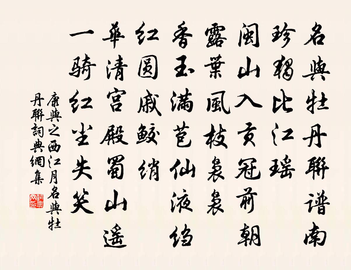 詩詞名句歷史字典書法欣賞書法字典國語詞典說文解字康熙字典古漢語字典標 題 作 者 詩 句 西江月·名與牡丹聯作者:康與之 朝代:宋代西江月·名與牡丹聯原文名與牡丹聯譜,南珍獨比江瑤。閩山入貢冠前朝。露葉風枝裊裊。香玉滿苞仙液,縐紅圓戚鮫綃。華清宮殿蜀山遙。一騎紅塵失笑。詩詞問答問:西江月·名與牡丹聯的作者是誰?答:康與之問:西江月·名與牡丹聯寫於哪個朝代?答:宋代問:西江月·名與牡丹聯是什麼體裁?答:詞康與之西江月·名與牡丹聯書法欣賞西江月·名與牡丹聯書法作品詩詞推薦遠浦歸潮舒岳祥〔宋代〕遠眺滄洲十里強,早潮舉網夜鳴榔。倦遊不作吳松客,白髮歸來樂故鄉。沁園春(壽朱漕·正月初八)佚名〔宋代〕斗柄御寅,序啟蒼塗,氣轉洪鈞。正乾坤交泰,聖賢相遇,風生虎嘯,霧滃龍興。華渚流虹,璇樞繞電,期邁三朝奉使契丹二十八首 惠州〈傳聞南朝逃叛者多蘇轍〔宋代〕孤城千室閉重闉,蒼莽平川絕四鄰。漢使塵來空極目,沙場雪重欲無春。羞歸應有李都尉,念舊可憐徐舍人。會逐歸入福建界作陳藻〔宋代〕行旅名雖惡,游山興亦深。酒無官榷價,松有道傍陰。鵝鴨豀浴,蜩蟬樹樹吟。逍遙儔侶怪,罵我失常心。西湖早春釋行海〔宋代〕多時不向柳邊來,每個幽亭坐一回。春哢未容鶯燕鬧,芳心猶待杏桃開。飄搖水面漁舟穩,宛轉風前玉笛哀。太乙與可大水頭閒望丘葵〔宋代〕暖入紗巾淡淡風,倚樓客思話無窮。前山倒影搖春水,野火飛煙入暮空。無數舟人相爾汝,一群沙鳥自西東。江流金溪道中楊萬里〔宋代〕野花垂路止人行,田水偏尋缺處鳴。近浦人家隨曲折,插秧天氣半陰晴。任以道總乾生日轆轤體項安世〔宋代〕身長如玉臉如童,抱朴存真道氣沖。隴上木牛新拄頰,篋中芸蠹舊蟠胸。周正已報初陽匝,商曆方開遠算洪。不競和宋文淵送仲明舉西歸三首郭印〔宋代〕朔風吹別袂,草色冷萋萋。憑高望佳人,天遠浮雲低。恍然從之游,神魂坐飛越。何當清夜語,分此半床月。奚山路蘇頌〔宋代〕行盡奚山路更賒,路旁時見百餘家。風煙不改盧龍俗,塵土猶兼瀚海沙。朱版刻旗村賜食,青氈通幰貴人車。皇恩送汪內相移鎮宣城黃公度〔宋代〕龍紀膺圖代,龜書出洛年。人文初炳煥,神化共迴旋。大雅藩籬缺,諸儒門戶專。天將扶古道,岳始降名賢。派別頌古二十首釋道顏〔宋代〕香嚴上樹口銜枝,手不攀枝腳累垂。才開口,咦不答也,又相違。未上樹時道將來,金剛寶劍頂門揮。題臨安僦樓何應龍〔宋代〕過了燒燈望燕歸,春寒劃地勒芳期。杏花深巷無人賣,細雨空簾盡日垂。自邊江赴守鄱陽黃原道中作李彌遜〔宋代〕海南三年一夢成,北來重聽偃溪聲。凝雲帶雨留愁住,茂樹隨山送客行。秔稻沿崖畦上下,茅茨枕谷路縱橫。莫從游虎丘郭麟孫〔元代〕海峰何從來?平地涌高嶺。去城不七里,幻此幽絕境。芳游坐遲暮,無物惜余景。樹暗雲岩深,花落春寺靜。野草自蕭關望臨洮朱慶餘〔唐代〕玉關西路出臨洮,風卷邊沙入馬毛。寺寺院中無竹樹,家家壁上有弓刀。惟憐戰士垂金甲,不尚遊人著白袍。日暮和王有道二首曹勛〔宋代〕客里羈情厭九遷,相逢賴有故人賢。見貽勞苦平生句,如誦中和樂職篇。江左風流從昔著,日邊事業向來傳。只應梅子張舜民〔宋代〕月破冥冥雨,枝搖閃閃黃。口中先水出,衣上帶花香。肺疾須拚醉,牙疏不耐嘗。調羹無復用,山谷日傾筐。安樂郡主花燭行張說〔唐代〕青宮朱邸翊皇闈,玉葉瓊蕤發紫微。姬姜本來舅甥國,卜筮俱道鳳凰飛。星昴殷冬獻吉日,夭桃穠李遙相匹。鸞車到梅山弟家見瑞香盛開醉書陳著〔宋代〕地因勝境閒中見,花為騷人分外香。數步出山何世界,一春無事是風光。名句推薦積雪覆平皋,飢鷹捉寒兔。孟浩然《南歸阻雪》 眼見的吹翻了這家,吹傷了那家,只吹的水盡鵝飛罷!王磐《朝天子·詠喇叭》 大丈夫處其厚,不居其薄;處其實,不居其華。老子《老子·德經·第三十八章》 命將征西極,橫行陰山側。李白《塞上曲》 念故人,千里至此共明月。寇準《踏莎行·寒草煙光闊》 安民可與為義,而危民易與為非賈誼《過秦論》 一言足以召大禍,故古人守口如瓶,惟恐其覆墜也王永彬《圍爐夜話·第四八則》 人生一世,草長一春。佚名《增廣賢文·上集》 城上風光鶯語亂,城下煙波春拍岸。錢惟演《木蘭花·城上風光鶯語亂》 日暮酒醒人已遠,滿天風雨下西樓。許渾《謝亭送別》