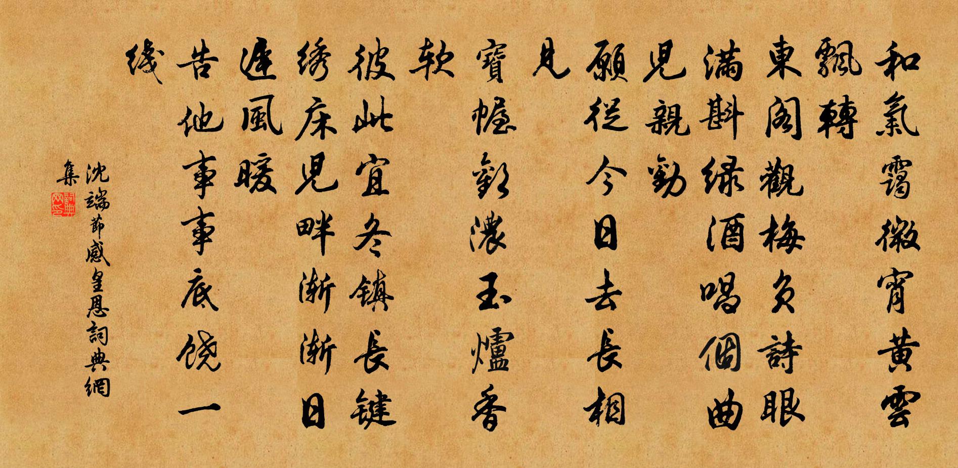 詩詞名句歷史字典書法欣賞書法字典國語詞典說文解字康熙字典古漢語字典標 題 作 者 詩 句 感皇恩作者:沈端節 朝代:宋代感皇恩原文和氣靄微宵,黃雲飄轉。東閣觀梅負詩眼。滿斟綠酒,唱個曲兒親勸。願從今日去,長相見。寶幄歡濃,玉爐香軟。彼此宜冬鎮長鍵。繡床兒畔,漸漸日遲風暖。告他事事底,饒一線。詩詞問答問:感皇恩的作者是誰?答:沈端節問:感皇恩寫於哪個朝代?答:宋代問:感皇恩是什麼體裁?答:詞沈端節感皇恩書法欣賞感皇恩書法作品詩詞推薦偈頌一百四十一首釋師範〔宋代〕鼻繩拽脫上梅溪,橫臥千峰適所宜。豈謂業級逃不得,依前拽耙與牽梨。辨淵明詩方回〔宋代〕微禽移木石,欲以塞東洋。賦壽何能遠,銜冤未始忘。起脾訛越婢,澎浪轉彭郎。輕改刑天字,於文恐未詳。訪恭率翁不值方岳〔宋代〕且容晴夢泊鷗沙,傳話茶頭莫點茶。山客不歸秋自老,滿城風雨又黃花。寄樊上友人張埴〔宋代〕鳳凰覽德輝,鷾鴯戀庭宇。吟詩已戴白,未能參此語。百川谷口翁,一笑輞川路。桃紅楊柳綠,鶯歌蝴蝶舞。春風寄張應和運副二首鄧肅〔宋代〕土屋茅茨山萬重,陰雲不解雨濛濛。桃源目斷知何處,身在杜陵詩句中。偈頌一百六十首釋宗杲〔宋代〕文殊三處安居,志公不是閒和尚。迦葉欲行正令,未免眼前見鬼。秋日憶次張弟郭知虔〔宋代〕秋風吹落葉,獨客異鄉心。生計憐吾拙,窮愁念汝深。面經三載隔,老惜二毛侵。飄泊南飛雁,何時返故林。雪賦謝惠連〔南北朝〕歲將暮,時既昏。寒風積,愁雲繁。梁王不悅,游於兔園。乃置旨酒,命賓友。召鄒生,延枚叟。相如末至,居客懷素上人草書歌朱逵〔唐代〕幾年出家通宿命,一朝卻憶臨池聖。轉腕摧鋒增崛崎,秋毫繭紙常相隨。衡陽客舍來相訪,連飲百杯神轉王。忽聞浣溪沙·肯把離情容易納蘭性德〔清代〕肯把離情容易看,要從容易見艱難。難拋往事一般般。今夜燈前形共影,枕函虛置翠衾單。更無人與共春寒。貽夸者司馬光〔宋代〕我樂非君樂,君憂非我憂。蓬蒿與溟渤,終老不同游。浣沙溪/浣溪沙方千里〔宋代〕清淚斑斑著意垂。消魂迢遞一天涯。誰能萬里布長梯。先自樓台飛粉絮,可堪簾幕卷金泥。相思心上乳鶯啼。盆池張蠙〔唐代〕圓內陶化功,外絕眾流通。選處離松影,穿時減藥叢。別疑天在地,長對月當空。每使登門客,煙波入夢中。秋夕湖上葛紹體〔宋代〕荻花風裡桂花浮,恨竹生雲翠欲流。誰拂半湖新鏡面,飛來煙雨暮天愁。觀石魚趙汝廩〔宋代〕預喜金穰驗石鱗,○能免俗且怡神。曉行鯨背占前夢,瑞絕龜陵知幾春。拂石已無題字處,觀魚皆是願豐人。片雲春暮高遁翁〔宋代〕石橋門外送斜暉,柳灑清風透客衣。老眼看花能有幾,如何啼鳥暮春歸。原頭送范侍御(得山字)岑參〔唐代〕百尺原頭酒色殷,路傍驄馬汗斑斑。別君只有相思夢,遮莫千山與萬山。白龍洞鄒浩〔宋代〕洞門寂寂晝常陰,誰識行天濟物心。金翅影沉超永劫,玉毫光現契圓音。滂沱普潤三千界,靉靆濃興一萬尋。天子南歌子呂渭老〔宋代〕策杖穿荒圃,登臨笑晚風。無窮秋色蔽晴空。遙見夕陽江上、卷飛蓬。雁過菰蒲遠,山遙夢寐通。一林楓葉墮愁紅和鍾西耘庶常德祥律門感懷詩黃遵憲〔清代〕電掣重輪走水車,風行千里獻比閭。移山未要嗤愚叟,捧土真能塞孟諸。黑齒雕題征鬼籙,赤文綠字詡天書。尋常名句推薦風乍暖,日初長,裊垂楊。陳子龍《訴衷情·春遊》 雨聲颼颼催早寒,胡雁翅濕高飛難。杜甫《秋雨嘆三首》 尊前故人如在,想念我、最關情。周邦彥《綺寮怨·上馬人扶殘醉》 脊令各有思歸恨,日月相催雪滿顛。黃庭堅《次元明韻寄子由》 一語不入意,從君萬曲梁塵飛。李白《夜坐吟》 春如舊。人空瘦。淚痕紅浥鮫綃透。陸游《釵頭鳳·紅酥手》 落日熔金,暮雲合璧,人在何處。李清照《永遇樂·落日熔金》 醲肥辛甘非真味,真味只是淡無味洪應明《菜根譚·概論》 徘徊將何見?憂思獨傷心。阮籍《詠懷八十二首·其一》 和大怨,必有餘怨;報怨以德,安可以為善?老子《老子·德經·第七十九章》