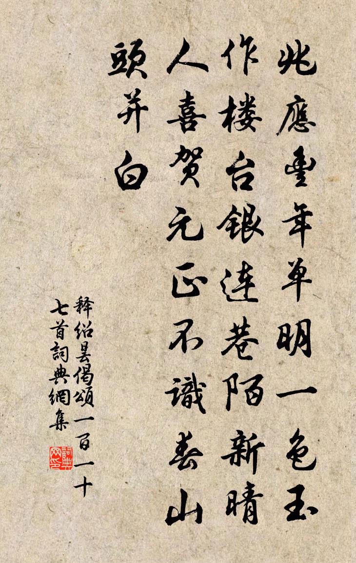 詩詞名句歷史字典書法欣賞書法字典國語詞典說文解字康熙字典古漢語字典標 題 作 者 詩 句 偈頌一百一十七首作者:釋紹曇 朝代:宋代偈頌一百一十七首原文兆應豐年,單明一色。玉作樓台,銀連巷陌。新晴人喜賀元正,不識春山頭並白。詩詞問答問:偈頌一百一十七首的作者是誰?答:釋紹曇問:偈頌一百一十七首寫於哪個朝代?答:宋代釋紹曇偈頌一百一十七首書法欣賞偈頌一百一十七首書法作品詩詞推薦句劉望之〔宋代〕地連巴楚峰嵐見,節近清明柳色知。句錢惟演〔宋代〕深沉蛛網通歸夢,紫翠春山接去舟。送左禹赴江夏尉賀鑄〔宋代〕泛泛青翰舟,亭亭黃鶴樓。江山信清灑,人物想風流。美酒遣歸思,新詩題舊遊。有魚知不食,端作置書郵。峽邊山寺汪元量〔宋代〕寺近陰崖多霧雨,峽邊靈竇忽風雷。松間白足攜詩板,石上蒼頭把酒杯。鷓鴣天佚名〔宋代〕香霧氤氳結彩山。蓬萊頂上駕頭還。繡韉狨坐三千騎,玉帶金魚四十班。風細細,佩珊珊。一天和氣轉春寒。千門寄懷西蟾師弟齊己〔唐代〕萬里 * 月,一身西北風。自從相示後,長記在吟中。見說南遊遠,堪懷我姓同。江邊忽得信,回到岳門東。休暇東齋韋應物〔唐代〕由來束帶士,請謁無朝暮。公暇及私身,何能獨閒步。摘葉愛芳在,捫竹憐粉污。岸幘偃東齋,夏天清曉露。懷仙降仙台洪适〔宋代〕漏殘柝靜雞聲遠,到高燎。入層霄。雲裘蟠瑞靄,天步下嘉壇,旗旆飄搖。黃麾列仗貔貅整,氣壓江潮。導前從後晚過鄰幾官舍三首韓維〔宋代〕炎日來休騎,紅塵喜放船。波平涼洗馬,樹淨晚吟蟬。風至披襟後,雲消倚拖前。潭心見華月,歸意一留連。句楊萬畢〔宋代〕千里暮雲山已黑,一燈孤館酒初醒。和潘倅新溪七首姜特立〔宋代〕山色湖光相接連,千章古木老雲煙。晚來曲港回舟處,如在孤山柳嶼邊。縣齋秋懷程公許〔宋代〕春渠鍼綠秧,秋畦壓黃雲。積憂稍緩帶,轉手俄空囷。況彼東人子,右田灼焚。算緡方趣辦,蒙袂須勸分。誰為本和青露石庵韻何夢桂〔宋代〕乾坤不固夜舟藏,去跨青鸞覓玉霜。東野詩隨山月墮,龍門灑落冢泥香。生傳嘉佑皇儲疏,死葬貞元綠綬章。九些重陽客中吳龍翰〔宋代〕愁里重陽近,他鄉酒易酤。秋風詩鬢短,寒夜客燈孤。筍笠月穿破,荷衣霜打枯。有懷吟未就,端不為催租。胡少明兩書索二程先生畫像寄小詩二首陳長方〔宋代〕牛首蒙倛兩誤傳,與人同處最難言。孟軻出語不驚坐,熟複方能知委源。游開元精舍韋應物〔唐代〕夏衣始輕體,游步愛僧居。果園新雨後,香台照日初。綠陰生晝靜,孤花表春餘。符竹方為累,形跡一來疏。治西湖詩范雲〔南北朝〕史氏導漳水。西門溉河潮。圖始未能悅。克終良可要。擁鍤勸年首。提爵勞春朝。平皋草色嫩。通林鳥聲嬌。已集雪竹魏野〔宋代〕溪南一向幾多垂,欲詠終難比並伊。應是彤庭將御試, * 群見折腰時。詠史詩函谷關胡曾〔唐代〕寂寂函關鎖未開,田文車馬出秦來。朱門不養三千客,誰為雞鳴得放回?別韓菊山葉茵〔宋代〕結廬甫里鄰,顧瞻誰與游。掩荊樂魚鳥,握管成樵謳。有客賞茲趣,柳下時停舟。自締十年契,投簪不願侯。一朝名句推薦宿醉離愁慢髻鬟,六銖衣薄惹輕寒,慵紅悶翠掩青鸞韓偓《浣溪沙·宿醉離愁慢髻鬟》 幾度思歸還把酒,拂雲堆上祝明妃。杜牧《題木蘭廟》 堂上遠於百里,堂下遠於千里,門庭遠於萬里。管仲《管子·法法》 香幃風動花入樓,高調鳴箏緩夜愁。王昌齡《青樓怨》 雪霏霏,風凜凜,玉郎何處狂飲?魏承班《滿宮花·雪霏霏》 千里搭長棚,沒有個不散的筵席曹雪芹《紅樓夢·第二十六回》 傷心千里江南,怨曲重招,斷魂在否?吳文英《鶯啼序·春晚感懷》 西登香爐峰,南見瀑布水。李白《望廬山瀑布水二首》 不似當時,小橋沖雨,幽恨兩人知。周邦彥《少年游·朝雲漠漠散輕絲》 雁足無書古塞幽。一程菸草一程愁。史達祖《鷓鴣天·衛縣道中有懷其人》