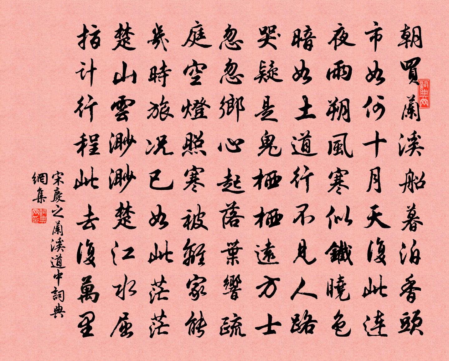 詩詞名句歷史字典書法欣賞書法字典國語詞典說文解字康熙字典古漢語字典標 題 作 者 詩 句 蘭溪道中作者:宋慶之 朝代:宋代蘭溪道中原文朝買蘭溪船,暮泊香頭市。如何十月天,復此連夜雨。朔風寒似鐵,曉色暗如土。道行不見人,路哭疑是鬼。棲棲遠方士,忽忽鄉心起。落葉響疏庭,空燈照寒被。離家能幾時,旅況已如此。茫茫楚山雲,渺渺楚江水。屈指計行程,此去復萬里。詩詞問答問:蘭溪道中的作者是誰?答:宋慶之問:蘭溪道中寫於哪個朝代?答:宋代宋慶之蘭溪道中書法欣賞蘭溪道中書法作品詩詞推薦次韻唐公三首其一——東陽道中王安石〔宋代〕山蔽吳天密,江蟠楚地深。浮雲堆白玉,落日瀉黃金。渺渺隨行旅,紛紛換歲陰。強將詩詠物,收拾濟時心。挽上官文季直二首李呂〔宋代〕蹤跡半天下,聲名落士林。縉紳爭汲引,歲月漫侵尋。後輩尊時尚,斯人竟陸沉。只言餘慶在,子舍日駸駸。郊廟歌辭。周郊祀樂章。武舞樂佚名〔唐代〕圭瓚方陳禮,乾旄乃象功。成文非羽籥,猛勢若羆熊。挽奉議劉公度四首陳棣〔宋代〕平生學術在斯民,蘊積淵源百未伸。邊障掾曹聊小試,一城惠愛已如春。送廣州劉待制金君卿〔宋代〕光搖劍外使星還,天閣平躋侍從班。暫命剖符開廣府,先聲指日定諸蠻。浮江大旆翩翻去,過嶺新恩次第頒。濟俗偈頌二十一首釋堅璧〔宋代〕漚澄巨浸無蹤跡,月轉層巒顯大功。剎海毫芒無欠剩,空山和月撼松風。答李伯魚桐竹張說〔唐代〕結廬桐竹下,室邇人相深。接垣分竹徑,隔戶共桐陰。落花朝滿岸,明月夜披林。竹有龍鳴管,桐留鳳舞琴。奇聲夜宴惜別白居易〔唐代〕笙歌旖旎曲終頭,轉作離聲滿座愁。箏怨朱弦從此斷,燭啼紅淚為誰流?夜長似歲嘆宜盡,醉未如泥飲莫休。何況過李季子丈方岳〔宋代〕易在床頭注未成,晦庵往矣與誰評。深衣靜對山逾好,語錄重抄眼尚明。春晚有詩供杖屨,日長無事樂鋤耕。家風小重山 秋思張玉娘〔元代〕秋入瑤台玉簟涼。藕花香暗度、紫荷鄉。軟□羅扇動清商。霜漸老,庭外菊初黃。眉月畫應慵瘦*□對鏡、怨容光送楊秀才貫休〔唐代〕北山玻璃峨峨香拂玻璃拂,翠漲青奔勢巉崒。赤松君宅在其中,紫金為牆珠作室。玻璃門外仙獓睡,幢節森森絳煙臨江仙晁補之〔宋代〕自古齊山重九勝,登臨夢想依依。偶來恰值菊花時。難逢開口笑,須插滿頭歸。昨夜一江風色好,平明秋浦帆飛。臨賀別駕李子西同年寄五字詩,以杜句君隨丞楊萬里〔宋代〕老拙誰肯伴,束書自相隨。此外無長物,猶有一鴟夷。小醉即孤詠,自遣不要奇。西湖妙天下,未羨習家池。斫膾懷永叔梅堯臣〔宋代〕高河古穴深,下有蒼鱗鯽。出水獰將飛,落刀細可織。香粳炊正滑,白酒美少力。但欠平生歡,共此中路食。春燕林泳〔宋代〕鵲結巢隨太歲移,蜂分房占吉時飛。好將說與青台史,社日只憑燕子歸。易水懷古馬戴〔唐代〕荊卿西去不復返,易水東流無盡期。落日蕭條薊城北,黃沙白草任風吹。春陰郭印〔宋代〕膏澤乘時要發生,雲師可是太無情。朝朝只解連空晦,好雨終慳造不成。久雨有感二首梁棟〔宋代〕冥雲先八荒,驟雨忽然至。中宵揭屋破,漏濕無處避。床床不得乾,僵立見惟悴。嬌兒莫啼哭,少須待晴霽。七十翁吟七言十絕方回〔宋代〕周家八百年天下,文武焉知有赧王。老壽彭公亦余骨,始知生死是興亡。送明守黃子由尚書赴召孫應時〔宋代〕燈火笙歌別海壖,詔書歸覲九重天。已將清淨安齊國,不使聲名減潁川。題品人才看贊贊,夫持皇極在平平。文星名句推薦楓林凋翠,寒雁聲悲。趙長卿《柳梢青·過何郎石見早梅》 君家何處住,妾住在橫塘。崔顥《長干行·君家何處住》 惜分長怕君先去,直待醉時休。賀鑄《眼兒媚·蕭蕭江上荻花秋》 素娥惟與月,青女不饒霜。李商隱《十一月中旬至扶風界見梅花》 興,百姓苦;亡,百姓苦!張養浩《山坡羊·潼關懷古》 階下青苔與紅樹,雨中寥落月中愁。李商隱《端居》 日射人間五色芝,鴛鴦宮瓦碧參差。元好問《浣溪沙·日射人間五色芝》 凡事謹守規模,必不大錯;一生但足衣食,便稱小康。王永彬《圍爐夜話·第五三則》 兒童強不睡,相守夜歡嘩。蘇軾《守歲》 雲淡風高葉亂飛,小庭寒雨綠苔微,深閨人靜掩屏帷。顧敻《浣溪沙·雲淡風高葉亂飛》