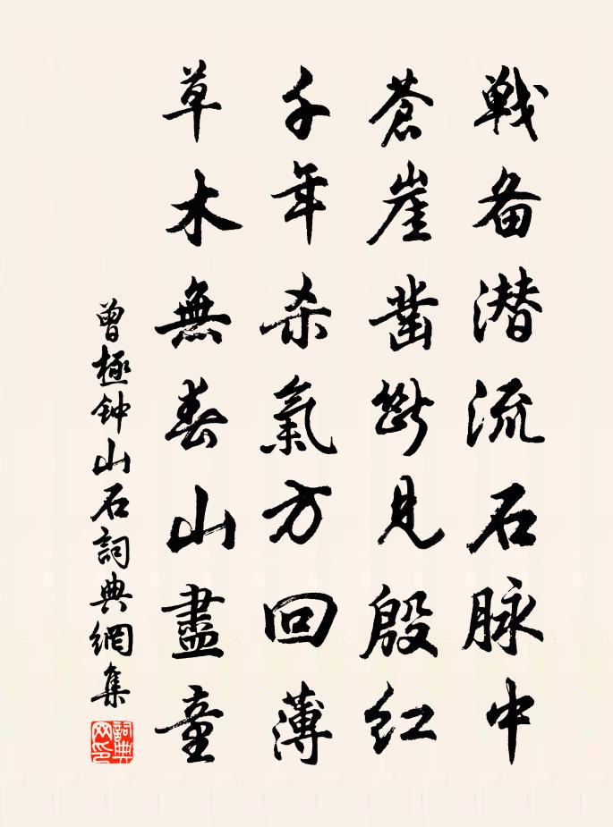 詩詞名句歷史字典書法欣賞書法字典國語詞典說文解字康熙字典古漢語字典標 題 作 者 詩 句 鐘山石作者:曾極 朝代:宋代鐘山石原文戰備潛流石脈中,蒼崖鑿斷見殷紅。千年殺氣方回薄,草木無春山盡童。詩詞問答問:鐘山石的作者是誰?答:曾極問:鐘山石寫於哪個朝代?答:宋代曾極鐘山石書法欣賞鐘山石書法作品詩詞推薦次韻劉貢父所和韓康公憶持國二首蘇軾〔宋代〕閉戶端居念獨深,小軒朱檻憶同臨。燎須誰識英公意,黃髮聊知子建心。已托西風傳絕唱,且邀明月伴孤斟。他時次韻秦觀秀才見贈秦與孫莘老李公擇甚熟將入蘇軾〔宋代〕夜光明月非所投,逢年遇合百無憂。將軍百戰竟不侯,伯郎一斗得涼州。翹關負重君無力,十年不入紛華域。故人早起觀雨余蛛網姚勉〔宋代〕嫩涼催讀矮窗書,曉色初分恰雨余。莫笑頹檐無活計,四邊寶網掛真珠。詠史下山中王袞陳普〔宋代〕老卒無多盡守藩,更無毫髮罪堪言。東堂斷手平生足,玉井蟾蜍任吐吞。秋聲曾鞏〔宋代〕喬柯與長谷,秀色故未浼。秋風來吹之,聲如振江海。怒號無晨夕,唱和若有待。翏翏遍坳窪窪,豈獨緣崔嵬。百和聖俞農具詩十五首其十五耘鼓王安石〔宋代〕逢逢戲場聲,壤壤戰時伍。日落未雲休,田家亦良苦。問兒今壟上,聽此何莽鹵。昨日應官繇,州前看歌舞。紀游十首劉克莊〔宋代〕篋有亡友詩,愈久愈鮮健。不歸芙蓉城,定返靈芝殿。萬年春 詠李公慵軒馬鈺〔元代〕物外慵軒,閒居放坦無為作。無為作。自然期約。心腎相交錯。二氣成形,結就靈丹藥。靈丹藥。銀霞覆卻。展起次韻泮宮直宿早秋四首傅察〔宋代〕一方明月落長空,萬里餘輝鎖玉櫳。蟬韻啾啾來遠木,槐雲裊裊弄清風。共邀載酒陶彭澤,走訪談經載侍中。景物賦介軒半村新居周耕雲〔宋代〕近謀吟屋傍潯溪,雁盪山深雲未歸。怕惱春光花種少,愛延月色竹栽稀。寶藏書冊教兒讀,土視功名與世違。不是茅山續志張頡〔宋代〕步虛聲起繞玄雲,石乳煙銷夜半分。怪得瑤笙吹鶴過,碧壇夜醮玉宸君。疏影·詠荷葉張炎〔宋代〕碧圓自潔。向淺洲遠渚,亭亭清絕。猶有遺簪,不展秋心,能卷幾多炎熱。鴛鴦密語同傾蓋,且莫與、浣紗人說。九鎖山十詠來賢岩鄧牧〔宋代〕石岩千尺高,曾見坡仙來。坡仙化黃土,岩石空蒼苔。縣知今人游,復令後人哀。示眾釋道顏〔宋代〕磐陀石上共安居,水遠山高一事無。唯有多情峰頂月,夜深移影到階除。天台曉望李白〔唐代〕天台鄰四明,華頂高百越。門標赤城霞,樓棲滄島月。憑高登遠覽,直下見溟渤。雲垂大鵬翻,波動巨鰲沒。風潮元日趙淦夫〔宋代〕鳳歷首春王,三元啟遠昌。衣冠充閭里,雲物動笙簧。共舞椒花醉,真成機械忙。人生當此日,何必古羲皇。觀中原指掌圖胡仲弓〔宋代〕月明空照八陵碑,玉館瓊樓失舊基。故國不堪回首處,西風滿地黍離離。謝師恩 贈福山縣仁壽保善眾王處一〔元代〕福山仁壽堪予羨。各各施方便。感得天公垂照管。遷恩布德,滅衍消過,福祿隨年轉。搜真去假心無變。漸漸通修鹿鳴宴致語口號陳造〔宋代〕黃堂賓宴霧香浮,峙玉時髦得意秋。莊海長風吹怒翼,禹門驚浪化吞舟。黃生眉宇看輝映,淥漲瑤杯剩獻酬。來歲憶薦福寺牡丹胡宿〔唐代〕十日春風隔翠岑,只應繁朵自成陰。樽前可要人頹玉,樹底遙知地側金。花界三千春渺渺,銅槃十二夜沈沈。雕槃名句推薦奇外無奇更出奇,一波才動萬波隨。元好問《論詩三十首·二十二》 采采黃金花,何由滿衣袖。杜甫《九日寄岑參》 旋開旋落旋成空,白髮多情人更惜。司空圖《酒泉子·買得杏花》 腸斷月明紅豆蔻,月似當時,人似當時否?納蘭性德《鬢雲松令·枕函香》 蠶無夏織桑充寨,田廢春耕犢勞軍。杜荀鶴《題所居村舍》 牽衣頓足攔道哭,哭聲直上乾雲霄。杜甫《兵車行》 鮑魚蘭芷,不同篋而藏劉向《說苑·指武》 終日兩相思。為君憔悴盡,百花時。溫庭筠《南歌子·倭墮低梳髻》 遠信入門先有淚,妻驚女哭問何如。元稹《得樂天書》 鄉書何處達?歸雁洛陽邊。王灣《次北固山下》