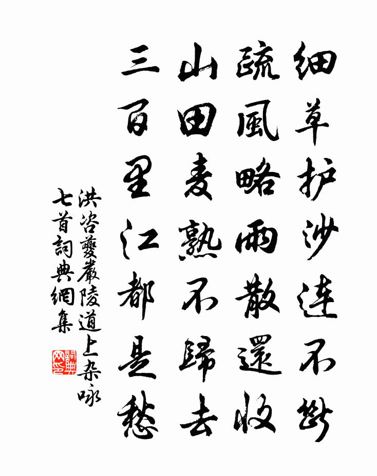 詩詞名句歷史字典書法欣賞書法字典國語詞典說文解字康熙字典古漢語字典標 題 作 者 詩 句 嚴陵道上雜詠七首作者:洪咨夔 朝代:宋代嚴陵道上雜詠七首原文細草護沙連不斷,疏風略雨散還收。山田麥熟不歸去,三百里江都是愁。詩詞問答問:嚴陵道上雜詠七首的作者是誰?答:洪咨夔問:嚴陵道上雜詠七首寫於哪個朝代?答:宋代洪咨夔嚴陵道上雜詠七首書法欣賞嚴陵道上雜詠七首書法作品詩詞推薦朝中措(崇福寺道中歸寄祐之弟)辛棄疾〔宋代〕籃輿裊裊破重網。玉笛兩紅妝。這裡都愁酒盡,那邊正和詩忙。為誰醉倒,為誰歸去,都莫思量。白水東邊籬落,依韻和孫之翰對雪范仲淹〔宋代〕江乾往往臘不雪,今喜紛紛才孟冬。乃知王澤寢及遠,益明天意先在農。有年預可慰四海,大瑞且當聞九重。況此雜詠一百首列子劉克莊〔宋代〕肉身無羽翼,那有許神通。會得泠然意,人人可御風。和楊遂賀雨王禹偁〔宋代〕我罷內庭職,出臨永陽民。永陽民雖庶,未免多飢貧。富之既無術,齪齪為謹身。可堪今夏旱,如燎復如焚。厥田讀詔書石介〔宋代〕關中有山生虎狼,虎狼性{左虎右武}不可當。去歲食人十有一,無辜被此惡物傷。守臣具事奏聖帝,聖帝讀之惻賀新郎 戲次仲舉韻張雨〔元代〕金屋書中有。為錢塘佳麗,待尋歡偶。記得朝雲前日夢,伏事東坡最久。且不是、郡無官守。日日湖中公事了,更黃石公祠劉先生〔宋代〕我昔讀漢史,心師張子房。從容輔漢室,功成復翱翔。皆由受師訓,知進退存亡。我本田舍兒,本志在退藏。因緣雲邊遣興劉宰〔宋代〕穴處堪忘世,松餐足永年。有時雲雨止,獨立看青天。送皇甫侍御曾還丹陽別業皎然〔唐代〕雲陽別夜憶春耕,花發菱湖問去程。積水悠揚何處夢,亂山稠疊此時情。將離有月教弦斷,贈遠無蘭覺意輕。朝右明月陳杰〔宋代〕悠悠明月,載盈載缺,我酒在室。南浦宗必經〔宋代〕江到南關古渡頭,旁分一曲入溪流。垂楊夾道三千戶,繞郭連檣數萬舟。春水綠波芳草渡,秋風明月白苹洲。滔滔題老融歸牛圖樓鑰〔宋代〕薄宦六年辭故山,故山只在夢魂間。簪紳何苦自纏縛,卻羨歸牛自在閒。滿庭芳 贛榆縣諸王廟黃醮罷,贈眾王處一〔元代〕海郡行緣,贛榆闡化,良因復顯諸王。謹修黃,特地召嘉祥。萬里雲收霧卷,微風息、燈燭熒煌。星壇上,步虛鄧表山鄭啟〔唐代〕白日三清此上時,觀開山下彩雲飛。仙壇丹灶靈猶在,鶴駕清朝去不歸。晉末幾遷陵谷改,塵中空換子孫非。松花太常引馬熙〔元代〕露桃雲杏不勝濃。合讓水花紅。別種出林東。為冰雪、相看改容。洹堂雙瓮,此時千葉,愁絕*珠宮。貯酒待吟翁滿庭芳(政和癸巳滁陽作,其年京師大雪)向子諲〔宋代〕天宇長閒,飛仙狂醉,挼雲碎玉沈空。謝家庭院,爭道絮因風。不怕寒生寶粟,深調護、犀幕重重。瑤林里,疏梅過邵堯夫先生富弼〔宋代〕先生自衛客西畿,樂道安間絕世機。再命初筵終不起,獨甘窮巷寂無依。貫穿百代嘗探古,吟詠千篇亦造微。珍重永遇樂(甲午走筆和岳大用梅詞韻)趙師俠〔宋代〕秋滿衡皋,淡雲籠月,晚來風勁。一抹殘霞,數聲過雁,遠是黃昏近。憑高臨遠,倚樓凝睇,多少斷愁幽興。聽漁門外意行有感畫示二孫徐瑞〔宋代〕門前老樹飽風霜,封植良勒不可忘。累世衣冠流澤遠,百年基緒慶源長。秘松怒長堪藏屋,新旬初抽已過牆。珍重近聞在舊京賣縵笠子馬廷鸞〔宋代〕蚤歲葫蘆依畫本,暮年台笠養閒身。如今半幅謄麻紙,羞寄鑾坡舊主人。名句推薦大雪北風催,家家貧白屋。環山樵《薛寶釵·雪竹》 願隨孤月影,流照伏波營。沈如筠《閨怨二首·其一》 一言既出,駟馬難追。佚名《增廣賢文·上集》 何日請纓提銳旅,一鞭直渡清河洛。岳飛《滿江紅·登黃鶴樓有感》 玉樓金闕慵歸去,且插梅花醉洛陽朱敦儒《鷓鴣天·西都作》 片帆西去,一聲誰噴霜竹。辛棄疾《念奴嬌·登建康賞心亭呈史致道留守》 柳花驚雪浦,麥雨漲溪田。李賀《南園十三首》 商女不知亡國恨,隔江猶唱後庭花。杜牧《泊秦淮》 高梧百尺夜蒼蒼,亂掃秋星落曉霜。鄭燮《詠梧桐》 觀人以言,美於黼黻、文章荀子《荀子·非相》