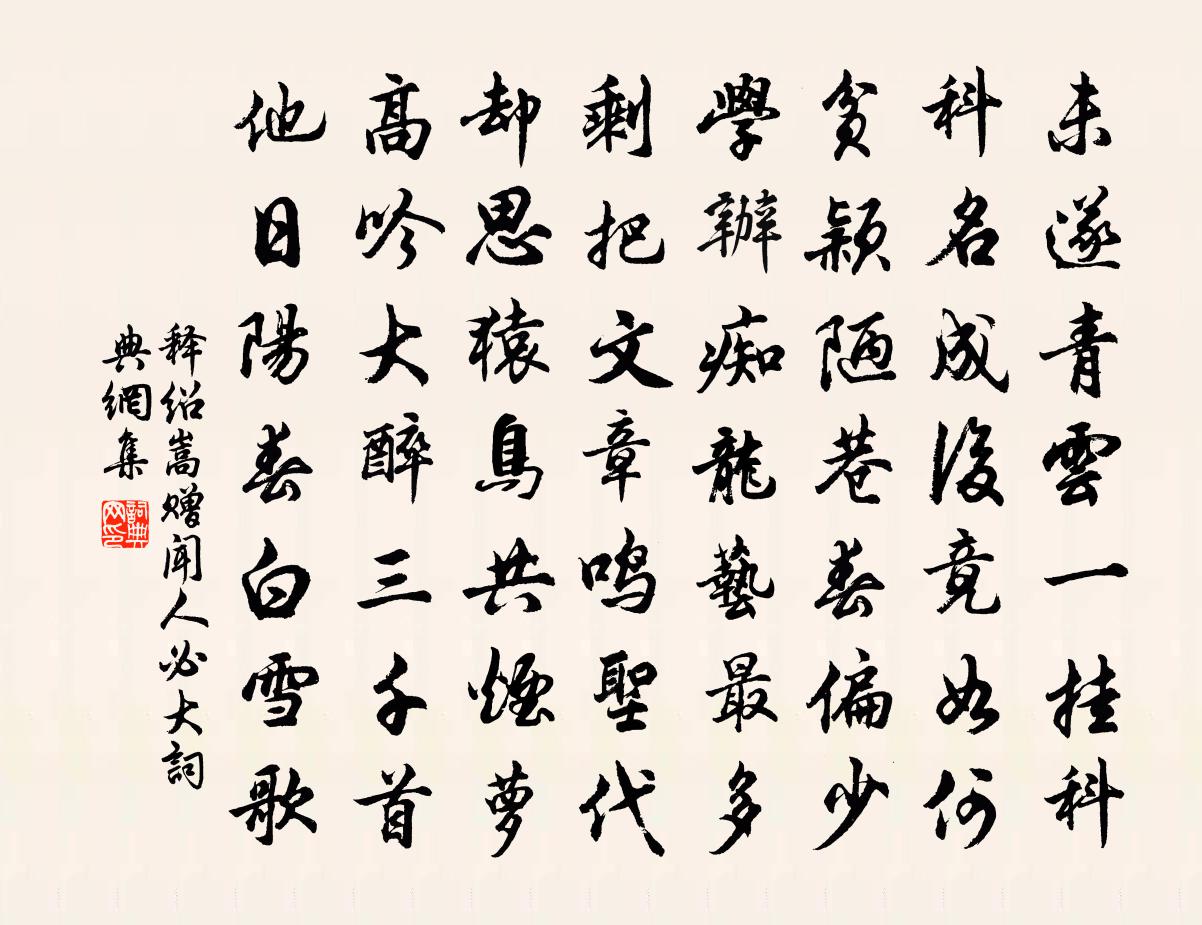 詩詞名句歷史字典書法欣賞書法字典國語詞典說文解字康熙字典古漢語字典標 題 作 者 詩 句 贈聞人必大作者:釋紹嵩 朝代:宋代贈聞人必大原文未遂青雲一掛科,科名成後竟如何。貧穎陋巷春偏少,學辦痴龍藝最多。剩把文章鳴新地,卻思猿鳥共煙蘿。高吟大醉三千首,他日陽春白雪歌。詩詞問答問:贈聞人必大的作者是誰?答:釋紹嵩問:贈聞人必大寫於哪個朝代?答:宋代釋紹嵩贈聞人必大書法欣賞贈聞人必大書法作品詩詞推薦詠懷白居易〔唐代〕盡日松下坐,有時池畔行。行立與坐臥,中懷澹無營。不覺流年過,亦任白髮生。不為世所薄,安得遂閒情。陸參議輓詞樓鑰〔宋代〕飾吏先儒雅,低徊五十霜。萑蒲掃韶石,桑柘滿黃岡。知己平津老,傳家刪定郎。八龍無半在,風雨夜侵床。走筆代顏西叔次途中即事之什釋紹嵩〔宋代〕邐迤前岡壓後岡,鳥鳴山館客思鄉。孤村樹色昏殘雨,滿耳蛙聲正夕陽。對酒已成千里客,懷人空結九迴腸。平生漢宮春(鄭賀守席上懷舊)佚名〔宋代〕日軟風柔,望暖江連島,晴綠平川。尋芳拾蕊,勝伴陌上鮮妍。玉驄歸路,記青門、曾墮吟鞭。人去後,庭花弄影大聖樂佚名〔宋代〕千朵奇峰,半軒微雨,曉來初過。漸燕子、引教雛飛,菡萏暗薰芳草,池面涼多。淺斟瓊卮浮綠蟻,展湘簟雙紋生宿董山寺陳峴〔宋代〕送客聯鑣歸,得得招提宿。晚渡滄江口,路入青山曲。突兀忽在眼,一洗賓士俗。然燈遽呼酒,僧留供野蔌。林高贄趙廣安陽枋〔宋代〕先生早矣袖薰弦,趁取南風入皛然。燕稱不妨辭閫幕,魚枯應喜活民編。萬家吟賞知微月,千里依棲刺史天。河漢次韻學士兄春日謾成李彌遜〔宋代〕飄泊悲生事,人情翻手雲,習閒真似懶,補拙謾知勤。老作漁樵計,夢觀鐘鼎動。成虧皆一戲,不復問斯文。頌古四首釋清旦〔宋代〕荊棘林中宣妙義,蒺藜園裡放毫光。千言萬語無人會,又靛流鶯過短牆。又漁父四首蒲壽宬〔宋代〕昨日賣魚到城郭,暑氣千門正炮烙。買酒歸來風露涼,始信人間漁父樂。和朱元晦九曲櫂歌歐陽光祖〔宋代〕五曲溪回屋數椽,上依翠壁下流泉。幽居不用立名字,大隱一峰高插天。洞前亭白玉蟾〔宋代〕洞前春水漾桃溪,洞後數聲青鳥啼。二十四岩風雨夜,神仙過此話刀圭。送龍學和寄王元之郎中張徽〔宋代〕未持雙節去朝元,玉陛猶虛待從班。龜洛舊遊天直上,雞林新句海中間。品流有日歸陶治,隱逸無時奉宴閒。鶴馭偈十二首釋文準〔宋代〕祖師闕棙子,幽隱罕人知。不是悟心者,如何舉向伊。南鄉子(今年重九,知命已向成都,感之,次韻)黃庭堅〔宋代〕招喚欲千回。暫得尊前笑口開。萬水千山還麽去,悠哉。酒面黃花欲醉誰。顧影又徘徊。立到斜風細雨吹。見我未水龍吟(和朱行父海棠)方岳〔宋代〕晝長庭院深深,春柔一枕流霞醉。蒙松欲醒,嬌羞還困,錦屏圍翠。豆寇初肥,櫻桃微綻,玉闌同倚。記華清浴起頌古一百二十一首釋宗杲〔宋代〕問佛如何是,宗師即便酬。稱鎚將鋸解,言外度迷流。次韻羹莧方岳〔宋代〕琉璃蒸乳壓{左犭右屯}膏,未抵齋廚格調高。脫粟飯香供野莧,荷鋤人飽捻霜毛。斷無文伯可相累,比似何曾無送從弟邕下第後尋會稽孟浩然〔唐代〕疾風吹征帆,倏爾向空沒。千里在俄頃,三江坐超忽。向來共歡娛,日夕成楚越。落羽更分飛,誰能不驚骨。伏暑鄧深〔宋代〕正覺纖絺便,未容團扇閒。兒童昧災變,赤體更觀顏。名句推薦用仁義以治天下,行禮樂以變海內,公賞罰以定干戈。施耐庵《水滸傳·第八十二回》 卻是有,年年塞雁,歸來曾見開時。晁沖之《漢宮春·梅》 若對黃花孤負酒,怕黃花、也笑人岑寂。劉克莊《賀新郎·九日》 人之足傳,在有德,不在有位王永彬《圍爐夜話·第九九則》 春水碧於天,畫船聽雨眠。韋莊《菩薩蠻·人人盡說江南好》 白兔搗藥秋復春,嫦娥孤棲與誰鄰?李白《把酒問月·故人賈淳令予問之》 晚來風起花如雪,飛入宮牆不見人。劉禹錫《楊柳枝詞九首》 舊時王謝堂前燕,飛入尋常百姓家。劉禹錫《烏衣巷》 君子矜而不爭,群而不黨。孔子弟子《論語·衛靈公篇》 煙霏霏。雪霏霏。雪向梅花枝上堆。吳淑姬《長相思令·煙霏霏》