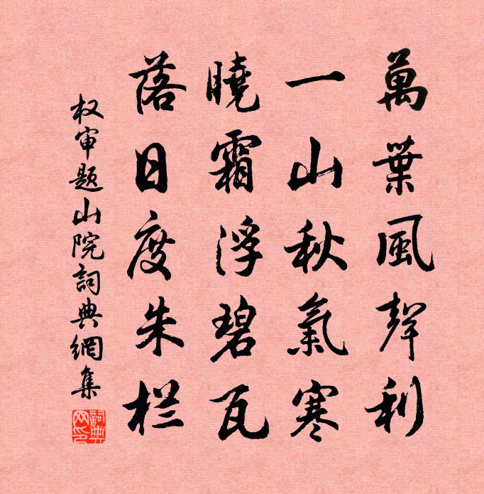 詩詞名句歷史字典書法欣賞書法字典國語詞典說文解字康熙字典古漢語字典標 題 作 者 詩 句 題山院作者:權審 朝代:唐代題山院原文萬葉風聲利,一山秋氣寒。曉霜浮碧瓦,落日度朱欄。詩詞問答問:題山院的作者是誰?答:權審問:題山院寫於哪個朝代?答:唐代問:題山院是什麼體裁?答:五絕權審題山院書法欣賞題山院書法作品注釋全唐詩:卷546-1詩詞推薦火蛾陳與義〔宋代〕陽光不照臨,積陰生此類。非無惜死心,素有賊明意。粉穿紅焰燋,翅撲蘭膏沸。為爾一傷嗟,自棄非天棄。因題象罔亭榜呈太素韓維〔宋代〕一顆圓明不欠虧,胡來胡現大鈞知。如今象罔渾無用,榜樣從教作世師。往時趙蕃〔宋代〕往時聽說嚴州水,試向經行覓舊痕。尚有浮槎棲古木,可憐萬壑勢併吞。野步趙汝鐩〔宋代〕雨收日薄春容嫩,步步東風桃李蹊。香遞深林疑麝過,聲傳幽谷認鶯啼。路摧迂步行荒草,橋斷褰裳涉淺溪。歸遇淳熙八年春帖子詞太上皇后合六首崔敦詩〔宋代〕春夕慈闈永,瑤池樂未央。管弦聲合奏,燈月影交光。句梁棟〔宋代〕千株守紅死,一點反魂歸。金字經·樂閒張可久〔元代〕百年渾似醉,滿懷都是春,高臥東山一片雲。嗔,是非拂面塵。消磨盡,古今無限人。五禽言五首蘇軾〔宋代〕使君向蘄州,更唱蘄州鬼。我不識使君,寧知使君死。人生作鬼會不免,使君已老知何晚。逍遙詠宋太宗〔宋代〕修煉求真一,沖和本自然。希夷光滿月,苦學周知易,難佃語默玄。成功兼積德,別有洞中天。一翁釋紹曇〔宋代〕獨立坤維老作家,心無二用裂千差。自從行道威音外,見著拈樁幾度花。文種墓石延年〔宋代〕至忠惜甘死,越塞一墳孤。句踐非王者,陶朱亦丈夫。碑經山燒斷,樹帶海潮枯。泉下伍員輩,相逢相吊無。無題二首劉筠〔宋代〕昱爚銀鞍狹路逢,長裙連帶任流風。身輕近識吳官燕,目斷還驚洛浦鴻。未許香囊安肘後,獨憐丹枕在房中。南國玉樓春·戲林推劉克莊〔宋代〕年年躍馬長安市。客舍似家家似寄。青錢換酒日無何,紅燭呼廬宵不寐。易挑錦婦機中字。難得玉人心下事。男兒貴游葉紹翁〔宋代〕五陵年少盡風流,十日安排一日游。林下幽人差省事,筆床茶灶便登舟。游靈岩寺張嵲〔宋代〕吳王避暑地,西施採香路。陵谷隅未移,山川尚如故。遺宮俱泯滅,輪奐乃僧戶。梵放想遺轉,考槃疑簨簴。繁華和惠思韻二首其二──蟬}王安石〔宋代〕白下長乾何可見,風塵愁殺庾蘭成。去年今日青松路,亦自聞蟬第一聲。枯菊陸游〔宋代〕積雪嚴霜轉眼空,春回無處不春風。欲知造物無窮妙,但看萱根與菊叢。贈神目相士文天祥〔宋代〕道茂數遁甲,長房得役鬼。風鑒 * 仙,地理青烏子。擇術患不精。精義本無二。奇哉夢筆生,熊魚掩前氏。掛金索佚名〔宋代〕 * 鼓。河車穩穩三十幅。搬日月、輥入金爐。玉鼎烹煎,九陽真火煮。萬道霞光,千重翠霧。後潭遊船見岸上看者有感歐陽修〔宋代〕喧喧誰暇聽歌謳,浪遶春潭逐彩舟。爭得心如汝無事,明年今日更來游。名句推薦又是重陽近也,幾處處,砧杵聲催。秦觀《滿庭芳·碧水驚秋》 刑天舞乾戚,猛志固常在。陶淵明《讀山海經·其十》 靜女其姝,俟我於城隅。佚名《靜女》 成事不說,遂事不諫,既往不咎。孔子弟子《論語·八佾篇》 世事洞明皆學問,人情練達即文章。曹雪芹《紅樓夢·第五回》 天涯海角悲涼地,記得當年全盛時。趙鼎《鷓鴣天·建康上元作》 曲岸持觴,垂楊系馬,此地曾經別。辛棄疾《念奴嬌·書東流村壁》 不知何歲月,得與爾同歸?韋承慶《南中詠雁詩》 親朋無一字,老病有孤舟。杜甫《登岳陽樓》 海燕未來人鬥草,江梅已過柳生綿。黃昏疏雨濕鞦韆。李清照《浣溪沙·淡盪春光寒食天》