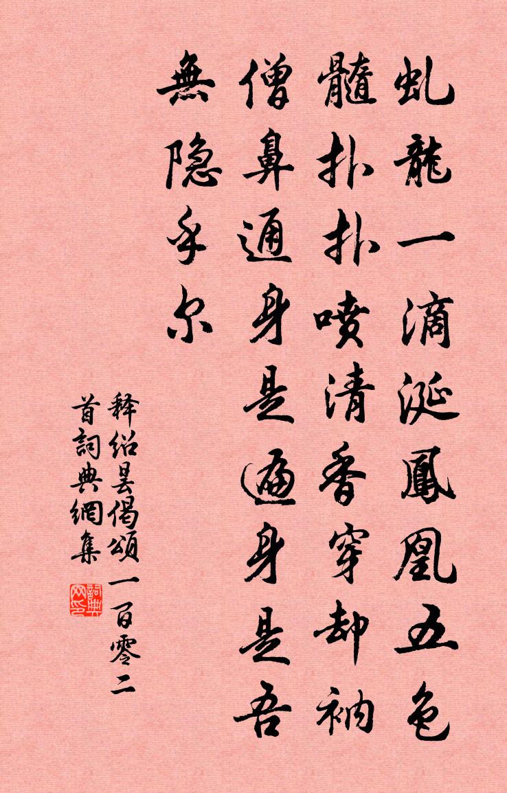 詩詞名句歷史字典書法欣賞書法字典國語詞典說文解字康熙字典古漢語字典標 題 作 者 詩 句 偈頌一百零二首作者:釋紹曇 朝代:宋代偈頌一百零二首原文虬龍一滴涎,鳳凰五色髓。撲撲噴清香,穿卻衲僧鼻。通身是,遍身是,吾無隱乎爾。詩詞問答問:偈頌一百零二首的作者是誰?答:釋紹曇問:偈頌一百零二首寫於哪個朝代?答:宋代釋紹曇偈頌一百零二首書法欣賞偈頌一百零二首書法作品詩詞推薦頌古一○一首釋子淳〔宋代〕這般訊息不尋常,蟾桂枝枝布遠香。昨夜姮娥呈巧妙,眼睛直上繡鴛鴦。松梅李龍高〔宋代〕梅夸清節忒高寒,松受微封合駿彈。畢竟兩君俱強項,大夫未必愛秦官。次韻李袁州絕句七首趙蕃〔宋代〕傳聞起柂只數日,引領白雲猶在天。試問今誰滿台閣,顧令是老落林泉。裴侍中晉公以集賢林亭即事詩三十六韻見贈,白居易〔唐代〕三江路千里,五湖天一涯。何如集賢第,中有平津池。池勝主見覺,景新人未知。竹森翠琅玕,水深洞琉璃。水竹送張無夢歸天台曹谷〔宋代〕幾載仙山下,無機世莫分。因為天市客,方識帝鄉雲。鍊氣壺中見,還元海內聞。名高赤城洞,歌賜紫皇君。步逐送徐員外赴河中從事姚合〔唐代〕赤府從軍美,儒衣結束輕。涼飆下山寺,曉浪滿關城。閒坐饒詩景,高眠長道情。將軍不戰術,計日立功名。西江月薛式〔宋代〕一氣初回遇朔,鼎中神水溫溫。剛柔相會氣均勻。妙在無過渾沌。八卦循回循繞,推排九竅追奔。東西沈靜合朝昏對食戲作陸游〔宋代〕黃昏來扣野人扉,笑語欣欣意不遲。葑火正紅煨芋美,不妨秉炬雪中歸。南溪會集二首傅察〔宋代〕傳聞公退集群英,共惜殘春到野亭。高柳半天成翠幄,遙峰插地作長屏。應憐曠寂囂塵絕,更覺蕭疏物象泠。顧我又次看字韻二首陳造〔宋代〕明年屈指春來早,定是元宵不苦寒。十里珠簾火城夜,客來應許醉中看。默誦宋庠〔宋代〕虛名三紀玷王朝,晚歲剛腸萬慮銷。篤學自依袁伯業,醒狂誰比蓋寬饒。將旄燭日逢兵偃,隱谷連雲負客招。白首讓糾曹上樂使君賈島〔唐代〕戰戰復兢兢,猶如履薄冰。雖然叨一掾,還似說三乘。瓶汲南溪水,書來北嶽僧。戇愚兼抱疾,權紀不相應。題徐五教池亭李中〔唐代〕多士池塘好,塵中景恐無。年來養鷗鷺,夢不去江湖。泉脈通深澗,風聲起短蘆。驚魚跳藻荇,戲蝶上菰蒲。泛泛祭觀文忠惠趙節齋釋善珍〔宋代〕公真天人,謫墮塵世。方朔歲星,傳說箕尾。又疑山林,一念差耳。樂全僧身,忠宣佛位。夙弘願力,出濟事會。鷓鴣天(壽逸老堂主人,年八十二)石麟〔宋代〕欲壽中山不老仙。壽詞更擬辦千篇。九蓂日秀堯階地,五色雲祥魯觀天。吟逸老,醉逃禪。香傳丹桂子孫賢。莫言九日逢虛中虛受齊己〔唐代〕楚後萍台下,相逢九日時。干戈人事地,荒廢菊花籬。我已多衰病,君猶盡黑髭。皇天安罪得,解語便吟詩。南歌子(次東坡端午韻)楊無咎〔宋代〕小雨疏疏過,長江滾滾流。落霞殘照晚明樓。又是一番重午,身寄南州。羅綺紛香陌,魚龍漾彩舟。不堪回首鳳池首夏二章呈諸鄰司馬光〔宋代〕燭燭久旱天,颯颯昨宵雨。塵頭清過轍,水脈生新渚。豈徒滋杞菊,亦可望禾黍。勿笑盤蔬陋,時來一觴舉。偈頌一百二十三首釋祖欽〔宋代〕春雨溟濛,春雲靉靆。忽然杲日當空,天不能遮,地不能載。八月十一日夜玉堂對月范祖禹〔宋代〕銀雲櫛櫛玉堂明,奩鏡初開六合驚。天卷織毫光不隔,風收萬籟夜無聲。蓬萊想像皆雲氣,宮殿虛無盡水精。一夕名句推薦嘆寄與路遙,夜雪初積。姜夔《暗香疏影》 柳葉隨歌皺,梨花與淚傾。黃庭堅《南歌子·槐綠低窗暗》 日中則昃,月盈則食佚名《易傳·彖傳下·豐》 利天下者,天下啟之;害天下者,天下閉之。姜子牙《六韜·武韜·發啟》 人而無信,不知其可也。孔子弟子《論語·為政篇》 秋風清,秋月明,落葉聚還散,寒鴉棲復驚。李白《三五七言 / 秋風詞》 暖雨晴風初破凍,柳眼梅腮,已覺春心動。李清照《蝶戀花·暖雨晴風初破凍》 試玉要燒三日滿,辨材須待七年期。白居易《放言五首·其三》 捐軀赴國難,視死忽如歸!曹植《白馬篇》 忽如一夜春風來,千樹萬樹梨花開。岑參《白雪歌送武判官歸京》