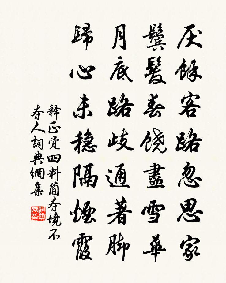 詩詞名句歷史字典書法欣賞書法字典國語詞典說文解字康熙字典古漢語字典標 題 作 者 詩 句 四料簡奪境不奪人作者:釋正覺 朝代:宋代四料簡奪境不奪人原文厭余客路忽思家,鬢髮春饒盡雪華。月底路歧通著腳,歸心未穩隔煙霞。詩詞問答問:四料簡奪境不奪人的作者是誰?答:釋正覺問:四料簡奪境不奪人寫於哪個朝代?答:宋代釋正覺四料簡奪境不奪人書法欣賞四料簡奪境不奪人書法作品詩詞推薦偈頌一百六十首釋宗杲〔宋代〕三十年來弄馬騎,今朝卻被驢兒攧。就地拾得麗水金,牛起卻是新羅鐵。報諸人,別不別,夜來雪壓雲門,凍得烏集句贈王秀才白玉蟾〔宋代〕富貴必從勤苦得,名位豈肯卑微休。勸君更盡一杯酒,與爾同銷萬古愁。又和董氏東園檜屏石床司馬光〔宋代〕密葉蕭森翠幕紆,暫來猶恨不長居。脫冠解帶坐終日,花落石床春自如。百寶裝/新燕過妝樓晁端禮〔宋代〕楓葉初丹,苹花漸老,蘅皋誰系扁舟。故人思我,征棹少淹留。一尊瀲灩西風裡,共醉倒、同銷萬古愁。況今宵自新晴曉步楊萬里〔宋代〕冬來暮暮雨絲絲,竹徑梅坡跡頓稀。作意新晴聊一出,行逢濕路卻成歸。凱歌十首呈賈樞使劉克莊〔宋代〕君親一念與天通,麾下人人可即戎。豈敢全軀顧妻子,相公將母在軍中。十二時頌釋文準〔宋代〕日昳未,法身清淨絕方比。乾坤遐邇盡東西,千山萬山翠相倚。木蘭花慢(吳尚書宴客漣滄觀,即席用韻)方岳〔宋代〕慨晴江渺渺,乘風下、倚滄浪。問許大乾坤,金焦兩點,曾幾興亡。平章古人安在,但青山、煙水共微茫。不道鷺旅吟釋文珦〔宋代〕逆旅新寒入,荒林敗葉飛。鄉心空自動,衰病不能歸。送勛侄之官嵢峽五言五首劉克莊〔宋代〕太守今元結,論交四十年。汝行勿前卻,如在父兄邊。送吳伯成歸建昌二首戴復古〔宋代〕老夫腳病瘡,閉門作僧夏。麥面不療飢,冬衣猶未卸。喜讀吳融詩,窮愁退三舍。無因暗投璧,有味倒餐蔗。冥搜會課乾明寺桑正國〔宋代〕悠悠意得自疏通,寂地因居樂性空。幽思曉風清迫枕,靜聽寒雨細沾桐。修莖竹韻澄玉簫,綠影松垂亂鬢蓬。儔侶劉園程公許〔宋代〕陰沍必陽和,快晴差愜意。怒飈妒心賞,清游殊鮮味。擊船枯葦叢,悶損兀坐睡。斷港麴塵波,見引著勝地。逕梅擢第南歸道中早發宋庠〔宋代〕紫漢回天斗柄橫,蕭蕭羸馬困遄征。南歸晝繡恩偏厚,應有鄉人笑夜行。三閭大夫劉威〔唐代〕三閭一去湘山老,煙水悠悠痛古今。青史已書殷鑑在,詞人勞詠楚江深。竹移低影潛貞節,月入中流洗恨心。再引王璠伯玉攜詩見過二首趙蕃〔宋代〕大熱有如此,涼風安在哉。書憑長日度,客欠好懷開。豹立妨看竹,蟾飛為掃槐。欣然王氏子,枉步袖詩來。答寇十一惠朱櫻陳師道〔宋代〕故人憐一老,輟食寄三山。厚味非貧具,先嘗愧客閒。甘酸俱可口,衰白不宜顏。句妙那能繼,情深未覺慳。行香子 李會首問道劉志淵〔元代〕大道無形。強立其名。判五氣融攝生成。貫通六合,總括群靈。本無情,亦無臭,又無聲。人悟勤行。造化無生。鄰圃求桂花並收墜英陳深〔宋代〕萬里西風桂樹秋,蟾宮雲箔夜香浮。何當淨洗紅塵夢,乞取一枝遮醉眸。偈頌一百三十六首釋惟一〔宋代〕夜夜明星現,有眼誰不見。此夜老瞿曇,卻被明星轉。直至而今雙眼花,無瑕白玉自生瑕。名句推薦金鞍玉勒尋芳客,未信我廬別有春。于謙《觀書》 梨花自寒食,進節只愁余。楊萬里《寒食上冢》 一觴雖獨盡,杯盡壺自傾。陶淵明《飲酒·其四》 無那塵緣容易絕,燕子依然,軟踏簾鉤說。納蘭性德《蝶戀花·辛苦最憐天上月》 愚者暗於成事,知者見於未萌。民不可與慮始,而可與樂成。商鞅《商君書·更法》 白毛浮綠水,紅掌撥清波駱賓王《詠鵝》 青梅如豆柳如眉,日長蝴蝶飛。歐陽修《阮郎歸·南園春半踏青時》 黃河捧土尚可塞,北風雨雪恨難裁。李白《北風行》 我報路長嗟日暮,學詩謾有驚人句。李清照《漁家傲·天接雲濤連曉霧》 遲日園林悲昔游,今春花鳥作邊愁。杜審言《渡湘江》
