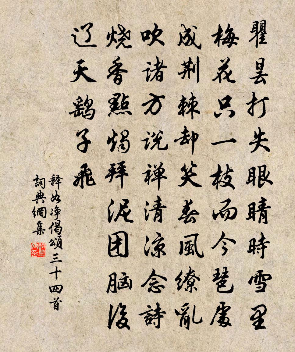 詩詞名句歷史字典書法欣賞書法字典國語詞典說文解字康熙字典古漢語字典標 題 作 者 詩 句 偈頌三十四首作者:釋如淨 朝代:宋代偈頌三十四首原文瞿曇打失眼睛時,雪裡梅花只一枝。而今琶處成荊棘,卻笑春風繚亂吹。諸方說禪,清涼念詩。燒香點燭拜泥團,腦後遼天鷂子飛。詩詞問答問:偈頌三十四首的作者是誰?答:釋如淨問:偈頌三十四首寫於哪個朝代?答:宋代釋如淨偈頌三十四首書法欣賞偈頌三十四首書法作品詩詞推薦小重山汪藻〔宋代〕月下潮生紅蓼汀。淺霞都斂盡,四山青。柳梢風急墜流螢。隨波處,點點亂寒星。別語寄丁寧。如今能間隔,幾長送何子應二首馮時行〔宋代〕功名本自屬諸生,誰向滄浪便濯纓。枕上日高惟我懶,船頭風飽看君行。眼前歷歷幾經手,意外悠悠久系情。待得老母適至時已見黜胡仲弓〔宋代〕千里迎阿{上彌下女},相見翻不樂。微祿期奉親,親至祿已奪。所悲乏故交,何以寓漂泊。向來耿介心,饋遺拒壽定叟弟張栻〔宋代〕聞說清朝對紫宸,君王側席屢諮詢。惟應民瘼開陳切,故遣分符驗撫循。河傳令王哲〔元代〕竹冠頂按。更竹作水瓶,至今常將手盥。竹杖竹藍,竹笠竹車竹鑽。竹林中,竹笛鳴,聲自喚。木鞋襯腳真熱暖。定風波孫光憲〔唐代〕簾拂疏香斷碧絲,淚衫還滴繡黃鸝。上國獻書人不在,凝黛,晚庭又是落紅時。春日自長心自促,翻覆,年來年去十五日雪三首梅堯臣〔宋代〕寒令奪春令,六花侵百花。塘冰膠燕觜,野水澀芹牙。擁柱輕於絮,吹墀淨若沙。乳禽飢啄木,誰悞撥琵琶。寄石湓清越上人方乾〔唐代〕寺處唯高僻,雲生石枕前。靜吟因得句,獨夜不妨禪。窗接停猿樹,岩飛浴鶴泉。相思有書札,俱倩獵人傳。十二峰起雲閻伯敏〔宋代〕釵頭嫋嫋山花枝,裙尾舊纈山 * 。朝隨雲起採薪去,莫趁女伴穿雲歸。同錢員外禁中夜直白居易〔唐代〕宮漏三聲知半夜,好風涼月滿松筠。此時閒坐寂無語,藥樹影中唯兩人。問田尉公俞丐菊栽李新〔宋代〕冷官廳外病陰陰,猶向西風擁鼻吟。梅福儘藏雲外宅,陶潛難老菊邊心。許因秋社前頭雨,分與東籬匝後金。待到東林社楊維楨〔元代〕陶公八十日,解組歸山阿。覺今若不早, * 十倍過。開塗劃荊棘,斧缺且無柯。賴爾東林社,招我南山歌。回視宛丘作宋祁〔宋代〕宛丘真善地,承詔幸班春。鈴下聽無訟,日邊來有人。吟餘多感客,睡足本慵身。蟣虱休相賀,吾今湯沐頻。寄竹隱先生孫應時劉過〔宋代〕蘇州酒滴如真珠,公能醉之酒百壺。得間政恐不來爾,來則倒屣相與俱。江山繞樓詩句好,奔走萬變同馳驅。大書春遊陸游〔宋代〕窮愁終日竟胡為?老健人間自一奇。每駕柴車游古寺,間騎竹馬伴群兒。登臨蘭渚流觴地,蕭散狐泉冷餅時。綀布採桑李石〔宋代〕籠鉤在手茜裙襦,蠶老風暄日欲晡。我是採桑菩薩女,不煩下擔捋髭鬚。蘇文忠二詩帖贊岳珂〔宋代〕物隨春而欣榮,詩之偶成,何間乎虎跑之與女城。縱筆而書,冰谷梅英。尺是歲月之與所因,予皆不必強評。惟當冶城劉克莊〔宋代〕斷鏃遺鑰不可求,西風古意滿原頭。孫劉數子如春夢,王謝千年有舊遊。高塔不知何代作,暮笳似說昔人愁。神州觀刈方岳〔宋代〕石田犖确底須嫌,苦說頻年不下鎌。煙雨一犁經老手,翻匙香雪十分甜。怪石曾幾〔宋代〕濟勝初無具,搜奇只此間。飛來太湖石,坐我洞庭山。面面成窗戶,峰峰出髻鬟。寓居端欠此,頗欲載之還。名句推薦把酒對斜日,無語問西風。楊炎正《水調歌頭·把酒對斜日》 秋侵人影瘦,霜染菊花肥。沈復《浮生六記·閨房記樂》 是無貓邪,是不會蓄貓也。樂鈞《世無良貓》 庭下如積水空明,水中藻、荇交橫,蓋竹柏影也。蘇軾《記承天寺夜遊 / 記承天夜遊》 槐葉初勻日氣涼,蔥蔥鼠耳翠成雙。范成大《夏日田園雜興》 思家步月清宵立,憶弟看雲白日眠。杜甫《恨別》 興盡晚回舟,誤入藕花深處。李清照《如夢令·常記溪亭日暮》 清水出芙蓉,天然去雕飾。李白《經亂離後天恩流夜郎憶舊遊書懷贈江夏韋太守良宰》 魏都接燕趙,美女夸芙蓉。李白《魏郡別蘇明府因北游》 惟將終夜常開眼,報答平生未展眉。元稹《遣悲懷三首·其三》