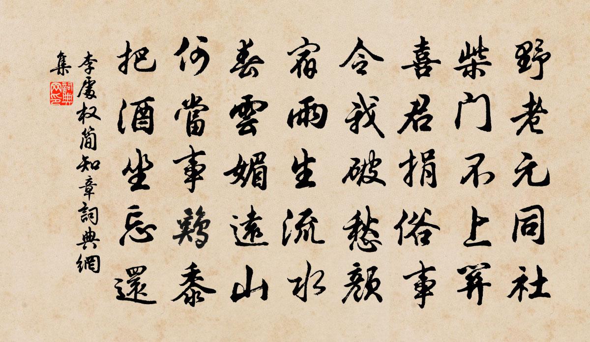 詩詞名句歷史字典書法欣賞書法字典國語詞典說文解字康熙字典古漢語字典標 題 作 者 詩 句 簡知章作者:李處權 朝代:宋代簡知章原文野老元同社,柴門不上關。喜君捐俗事,令我破愁顏。宿雨生流水,春雲媚遠山。何當事雞黍,把酒坐忘還。詩詞問答問:簡知章的作者是誰?答:李處權問:簡知章寫於哪個朝代?答:宋代李處權簡知章書法欣賞簡知章書法作品詩詞推薦題畫草蟲扇子蘇頌〔宋代〕蠉飛蠕動誠微物,尺素輕盈誰畫出。一朝君手將動搖,猶似吟風欲跳逸。竹梢草際弄輕翰,水墨淺深見纖質。昔人小重山(湯)王安中〔宋代〕重舉金猊多炷香。仙方調絳雪,坐初嘗。醉鬟嬌捧不成行。顏如玉,玉碗共爭光。飛蓋莫催忙。歌檀臨閱處,緩何滿庭芳 贈洞雲散人陳姑馬鈺〔元代〕清清淨淨,搜獲玄玄。觀天可認根源。敷布參羅萬象,日月相傳。做效女媧手段,撮虛無、五色新鮮。下火煉,大登總持寺閣耿湋〔唐代〕今日登高閣,三休忽自悲。因知筋力減,不及往年時。草樹還如舊,山河亦在茲。龍鍾兼老病,更有重來期。浪淘沙晏幾道〔宋代〕麗曲醉思仙。十二哀弦。穠蛾疊柳臉紅蓮。多少雨條菸葉恨,紅淚離筵。行子惜流年。鵜鴂枝邊。吳堤春水艤蘭船秋日遣興孫應時〔宋代〕今年炎毒異他年,及此秋風意洒然。身世還須幾寒暑,吾生何事不隨緣。琴台(司馬相如宅在州西笮橋,北有琴台)杜甫〔唐代〕茂陵多病後,尚愛卓文君。酒肆人間世,琴台日暮雲。野花留寶靨,蔓草見羅裙。歸鳳求皇意,寥寥不復聞。九日陪金市諸友登高陽山二首王阮〔宋代〕途窮已負菊花期,尚得諸公慰所思。不遣白衣持酒至,共將烏帽入風吹。紫萸秋淺浮觴少,黃葉山高策杖遲。卻恨華藏地雲海亭望具區姜夔〔宋代〕茫茫復茫茫,中有山蒼蒼。大哉夫差國,坐斷天一方。夫差醉蓮宮,大浪搖不醒。越師何從來,奪我玉萬頃。年年和王子安至日三首陳師道〔宋代〕晨起公私迫,昏歸鳥雀催。百年忙裡盡,萬事醉間來。竹雨深宜晚,江梅半欲開。風燈挑不焰,寒火撥成灰。偈頌六十七首釋原妙〔宋代〕咄哉老賊,偷心未息。石灰布袋,到處成跡。若謂子為父隱,畢竟曲不藏直。今日因齋慶贊,未免乘時拈出。雜賦陸游〔宋代〕體不佳時看周易,酒痛飲後讀離騷。騎驢太華三峰雪,鼓棹錢塘八月濤。送道士於千齡游南嶽崔塗〔唐代〕物外與誰期,人間又別離。四方多事日,高岳獨游時。猿狖瀟湘樹,煙波屈宋祠。無因陪此去,空惜鬢將衰。點絳唇佚名〔宋代〕破萼江梅,迥然標格冰肌瑩。暗香疏影。月張銀塘靜。折取一枝,與插多情鬢。臨鸞鏡。粉容相併。試問誰端正。立春內中帖子詞夫人閣王珪〔唐代〕翠縷爭垂柳,紅酥旋點花。林中都未有,疑是舊年華。記夢陸游〔宋代〕夢遊異境不可識,翠壁蒼崖立千尺。樓台縹緲出其上,揮手直登無羽翼。門楣扁牓作八分,奇勁非復人間跡。主人減字木蘭花陳三聘〔宋代〕東籬 * 。細拈香枝人事熟。少緩芳尊。且醉儂家麴米春。老人齋戒。底事新來移角帶。歸夢相關。明月松江萬頃摸魚兒(守歲)劉辰翁〔宋代〕是疑他、春來倏忽,是疑歲別人去。古今守歲無言說,長是酒闌情緒。堪恨處。曾親見都人,戶戶銀花樹。星河未田蛙歌羅椅〔宋代〕暇蟆,暇蟆,汝本吾田蛙。渴飲吾稻根水,飢食吾禾穟花。池塘雨初霽,籬落月半斜。啁啁又向他人叫,使我惆悵莘老葺天慶觀小園有亭北向道士山宗說乞名與蘇軾〔宋代〕春風欲動北風微,歸雁亭邊送雁歸。蜀客南遊家最遠,吳山寒盡雪先晞。扁舟去後花絮亂,五馬來時賓從非。惟有名句推薦長堤春水綠悠悠,畎入漳河一道流。王之渙《宴詞》 南去北來徒自老,故人稀。賀鑄《釣船歸·綠淨春深好染衣》 不凡之子,必異其生;大德之人,必得其壽。程登吉《幼學瓊林·卷二·老幼壽誕》 與君別,相思一夜梅花發房舜卿《有所思》 春雲不變陽關雪,桑葉先知胡地秋。李昂《從軍行》 新葉初冉冉,初蕊新霏霏。謝朓《詠落梅》 反古者未必可非,循禮者未足多是也。商鞅《商君書·更法》 雨里雞鳴一兩家,竹溪村路板橋斜。王建《雨過山村》 仁者之為天下度也,辟之無以異乎孝子之為親度也。墨子《墨子·22章 節用(下)》 窗間梅熟落蒂,牆下筍成出林。范成大《喜晴》