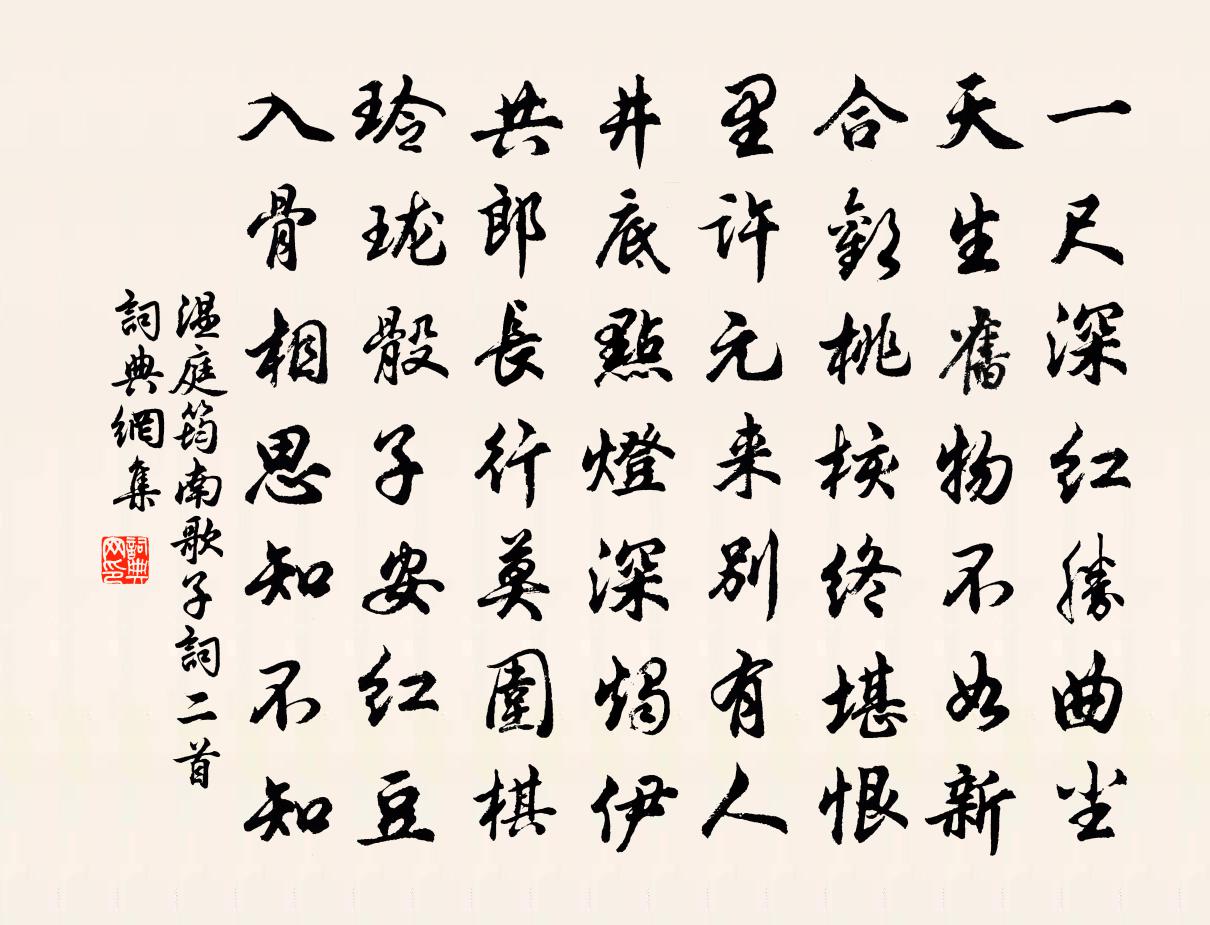 這首詞最精粹之筆,在於後二句以相思子(紅豆)為喻,寄託女子的摯愛深情。全詞採用諧音雙關的手法,雖有助於詞境的深婉含蓄;但由於刻意為之,便又流人“謎而不詩”(王夫之《古詩評選》)之地,缺乏“自然天成”之妙。
