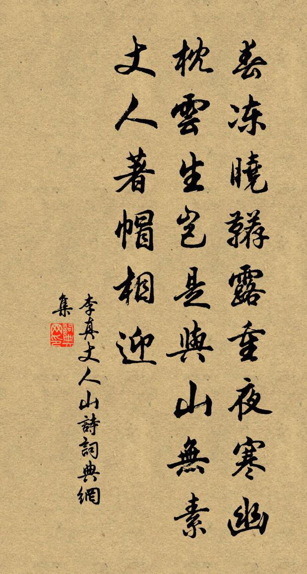 詩詞名句歷史字典書法欣賞書法字典國語詞典說文解字康熙字典古漢語字典標 題 作 者 詩 句 丈人山詩作者:李真 朝代:唐代丈人山詩原文春凍曉韉露重,夜寒幽枕雲生。豈是與山無素,丈人著帽相迎。詩詞問答問:丈人山詩的作者是誰?答:李真問:丈人山詩寫於哪個朝代?答:唐代問:丈人山詩是什麼體裁?答:六古李真丈人山詩書法欣賞丈人山詩書法作品注釋全唐詩:卷861-10詩詞推薦西際劉黻〔宋代〕一徑寒松老,因來采茯苓。水禽鳴杞澗,野鹿臥棕亭。瀑近雲根濕,仙遺石井靈。守廬青道者,不厭客頻經。酒病中寄李十二招飲五首張耒〔宋代〕酒病岑岑更怯寒,一窗疏雨擁衾眠。西風一入庭前樹,便有秋聲到枕邊。山中夜聞風雨王銍〔宋代〕空山清夜寒無寐,松檜搖聲風雨高。行盡江湖忘岩壑,猶疑繞屋盡波濤。五位釋慧溫〔宋代〕兼中到,天寒大雪長安道。五陵才子錦袍新,馬蹄亂踏瓊瑤草。詠日董思恭〔唐代〕滄海十枝暉,懸圃重輪慶。蕣華發晨楹,菱彩翻朝鏡。忽遇驚風飄,自有浮雲映。更也人皆仰,無待揮戈正。送張無夢歸天台山馬知節〔宋代〕暫至朝真主,卻思歸舊峰。只依三事布,唯有一枝筇。月上當孤室,風生自古松。陰功從此滿,何處覓遺蹤。陪李梁溪游泛碧鄧肅〔宋代〕涼天夜無雲,寒江秋更碧。冷照月華中,水天同一色。畫船渺中流,三更群動寂。清風遠相隨,蘆花秋瑟瑟。近山送趙殿孫歸成都司馬光〔宋代〕蜀棧錦衣來,高堂綬笥開。恩輝同日至,喜色共春回。駟馬過鄰社,朝裾捧壽杯。吾生無此樂,空使寸心摧。明暗劉克莊〔宋代〕大士千眼而明,老子一隻而盲。或不夜能久照,誰籲天鳴不平。挽徐季節先生孫應時〔宋代〕語言平談骨清癯,誰似黃山一老徐。眼底不知人富貴,腹中惟有古詩書。平生義薄雲天上,日暮家無儋石儲。試問聽蜀道士琴歌李宣古〔唐代〕至道不可見,正聲難得聞。忽逢羽客抱綠綺,西別峨嵋峰頂雲。初排□面躡輕響,似擲細珠鳴玉上。忽揮素爪畫七贈歐陽明府杜荀鶴〔唐代〕賢宰宰斯邑,政聞閭裡間。都緣民訟少,長覺吏徒閒。帆落樽前浦,鐘鳴枕上山。回舟卻惆悵,數宿釣魚灣。扈從景靈宮(一作:奉和穎叔萬壽觀)蘇軾〔宋代〕道人幽夢曉初還,已覺笙蕭下月壇。風伯前驅清宿霧,祝融驂乘破朝寒。英姿連璧從多士,妙句鏘金和八鑾。已向春社陸游〔宋代〕柴門西畔枕陂塘,社雨新添一尺強。台省諸公方袞袞,故應分喜到耕桑。頌古二十五首釋崇岳〔宋代〕夫子不識字,達磨不會禪。大唐天子國,依舊化三千。中秋待月用弟察推元彪韻柴望〔宋代〕待月南樓月不明,百年虛負此宵情。浮陰亂向空中起,圓影偏從塞外清。江國瀟瀟淒露氣,山城處處動笳聲。何人方響歌李沇〔唐代〕敲金扣石聲相凌,遙空冷靜天正澄。寶瓶下井轆轤急,小娃弄索傷清冰。穿絲透管音未歇,迴風繞指驚泉咽。季倫夏晚望嵩亭有懷羅鄴〔唐代〕正憐雲水與心違,湖上亭高對翠微。盡日不妨憑檻望,終年未必有家歸。青蟬漸傍幽叢噪,白鳥時穿返照飛。此地題畫四首唐寅〔明代〕雪滿梁園飛鳥稀,暖煨榾柮閉柴扉。瓦盆熟得松花酒,剛是溪丁拾蟹歸。漫題楊冠卿〔宋代〕著雨林花暗,敲風檻竹幽。翠屏疏得夢,紅葉忽驚秋。名句推薦亂世用能,平則去患。來俊臣《羅織經·控權卷第四》 西湖到日,重見梅鈿皺。吳文英《瑞龍吟·送梅津》 秋色漸將晚,霜信報黃花。葉夢得《水調歌頭·秋色漸將晚》 無田似我猶欣舞,何況田間望歲心。曾幾《蘇秀道中》 一身猶在,亂山深處,寂寞溪橋畔。黃公紹《青玉案·年年社日停針線》 孤舟向廣武,一鳥歸成皋。岑參《鞏北秋興寄崔明允》 明眸皓齒誰復見,只有丹青余淚痕。蘇軾《虢國夫人夜遊圖》 於事事物物上求至善,卻是義外也。王陽明《傳習錄·卷上·徐愛錄》 尺蠖之屈,以求信也;龍蛇之蟄,以存身也。佚名《易傳·繫辭傳下·第五章》 一切都是命,半點不由人。佚名《增廣賢文·上集》