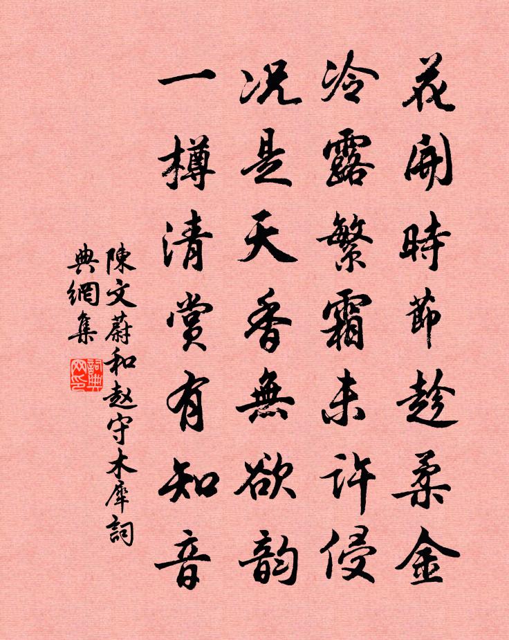 詩詞名句歷史字典書法欣賞書法字典國語詞典說文解字康熙字典古漢語字典標 題 作 者 詩 句 和趙守木犀作者:陳文蔚 朝代:宋代和趙守木犀原文花開時節趁柔金,冷露繁霜未許侵。況是天香無欲韻,一樽清賞有知音。詩詞問答問:和趙守木犀的作者是誰?答:陳文蔚問:和趙守木犀寫於哪個朝代?答:宋代陳文蔚和趙守木犀書法欣賞和趙守木犀書法作品詩詞推薦再次韻二首陳造〔宋代〕吹花舞絮才俄頃,可待區區刻楮成。催動江梅傲春意,喜聽冰籌滴階聲。剡溪載酒人乘興,縣圃明空月碾晴。更想破山光明庵釋仲殊〔宋代〕身是光明幢,語是光明經。光明聚不散,妙是成真形。示現三界前,何勞問丹青。坐斷龍斗山,寶月孤亭亭。酬淨慈綱上人三首劉克莊〔宋代〕參寥燈一點,不審是誰傳。晚識綱書記,元來在汝邊。五言詩三首 其三嵇康〔兩漢〕俗人不可親。松喬是可鄰。何為穢濁間。動搖增垢塵。慷慨之遠遊。整駕俟良辰。輕舉翔區外。濯翼扶桑津。徘徊灩澦堆范成大〔宋代〕灩澦之石誰劖鐫?惡駭天下形眇然。客行五月潦始漲,但見匹馬浮黃湍。時時吐沫作濆淖,灂灂有聲如粥煎。蜀江和江橋晚望釋重顯〔宋代〕公餘縱目望江山,萬化窮來岡象間。聞說聖君將下詔,未容清澹與僧閒。句方乾〔唐代〕弟子已攀桂,先生猶臥雲。(寄李頻及第,見《鑑戒錄》)把得新詩草里論。(乾師徐凝,常刺凝云云,反語為村避地越中作韋莊〔唐代〕避世移家遠,天涯歲已周。豈知今夜月,還是去年愁。露果珠瀋水,風螢燭上樓。傷心潘騎省,華發不禁秋。和謝仲弓廷評栽竹梅堯臣〔宋代〕移得溪邊翠,來為庭下陰。惜根存舊土,帶筍助新林。暗換蕭蕭葉,知虛寸寸心。東風莫搖撼,培壅未應深。依韻和南子強李復〔宋代〕雲路天門白日開,豈無松桂出蒿萊。於斯未信誠可矣,如或知爾何以哉。鏗然舍瑟有異撰,豈必讀書無取裁。業廣答寄芙蓉冠子王建〔唐代〕一學芙蓉葉,初開映水幽。雖經小兒手,不稱老夫頭。枕上眠常戴,風前醉恐柔。明年有閨閣,此樣必難求。句王安石〔宋代〕昔時江令宅,今日段侯家。訪石門洞劉黻〔宋代〕洞中誰是主,一樹野桃開。仙駕青牛去,瀑疑碧漢來。門閒雲闔闢,山好客徘徊。已擬歸休日,臨溪築釣台。陳琳墓吳融〔唐代〕冀州飛檄傲英雄,卻把文辭事鄴宮。縱道筆端由我得,九泉何面見袁公。損戒二首洪咨夔〔宋代〕河魨行水底,志在全其生。縋綆激使怒,拍浮拾彭亨。觸來不自製,天君失和平。懲忿當如山,一靜弭百爭。蘇幕遮宋先生〔宋代〕氣隨神,神隨氣。神氣相隨,透入泥丸里。長把金關牢鎖閉。捉得金晶,暗地添歡喜。下辛勤,鬚髮志。十二時中緣識宋太宗〔宋代〕高下不相及,非今自古來。十洲花滿樹,豈用俗情咍。春晚二首葉茵〔宋代〕胡蝶夢中意,杜鵑聲外愁。問春春不語,柳絮暗汀洲。贈護國寺山上宏道者顧逢〔宋代〕三十年趺坐,何曾下此山。忘形超物外,無夢到人間。窗暗月來照,門開風自關。虎狼情亦狎,夜夜廟前還。永和鎮曾峑季高明秀樓周必大〔宋代〕心得高明趣,樓開井邑間。巡檐風與月,隱几水兼山。景物因天巧,軒窗占地慳。寒暄俱可至,徒倚不知還。名句推薦白髮戴花君莫笑,六么催拍盞頻傳。歐陽修《浣溪沙·堤上遊人逐畫船》 酒後競風采,三杯弄寶刀。李白《白馬篇》 人之情多矯,世之俗多偽,豈可信乎?來俊臣《羅織經·閱人卷第一》 白雲初下天山外,浮雲直向五原間。盧思道《從軍行》 水至清則無魚,人至察則無徒。班固《漢書·傳·東方朔傳》 世間珍果更無加,玉雪肌膚罩絳紗。丘浚《詠荔枝》 江上幾人在,天涯孤棹還。溫庭筠《送人東遊》 漸秋闌、雪清玉瘦,向人無限依依。李清照《多麗·詠白菊》 富貴非榮,富貴而利濟於世者為榮。王永彬《圍爐夜話·第三一則》 美人自古如名將,不許人間見白頭。袁枚《隨園詩話·卷四》