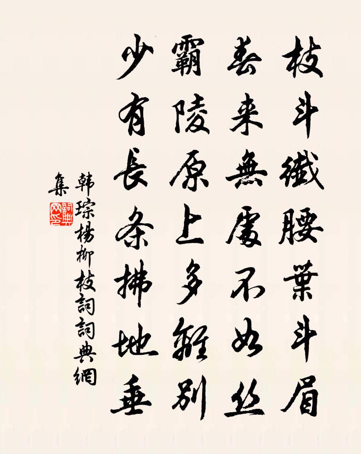 詩詞名句歷史字典書法欣賞書法字典國語詞典說文解字康熙字典古漢語字典標 題 作 者 詩 句 楊柳枝詞作者:韓琮 朝代:唐代楊柳枝詞原文枝斗纖腰葉斗眉,春來無處不如絲。霸陵原上多離別,少有長條拂地垂。詩詞問答問:楊柳枝詞的作者是誰?答:韓琮問:楊柳枝詞寫於哪個朝代?答:唐代問:楊柳枝詞是什麼體裁?答:樂府韓琮楊柳枝詞書法欣賞楊柳枝詞書法作品注釋全唐詩:卷565-24詩詞推薦偈頌一百零二首釋慧遠〔宋代〕梅陽老囑付此衣,遮護得山僧一半。借問搭來何所宜,恰似當年賣柴漢。醬裹墮,雪中炭,留與叢林斫額看。君不和郡守彭吏部按視湖亭凡二首周鍔〔宋代〕使群風味壓荊州,每為吾民樂更憂。錦里篇章推唱首,浣溪光景促遨頭。行春預約花欹帽,把酒方欣雪點裘。岳史望江南吳潛〔宋代〕家山好,好處是秋來。綠橘黃橙隨市有,岩花籬菊逐時開。管領付尊罍。新築就,別館共閒台。搖手出離名利窟,次韻斯遠三十日見寄趙蕃〔宋代〕窗明內晴景,書味真雋永。長年悔遠遊,紛蠹幾莫整。子猷調固疏,竹可一日無。看渠姿爾瘦,瘦而何用腴。因茲安國晚酌葵軒分韻得成字張栻〔宋代〕桐花三月寒,風雨滿江城。使君晚被酒,千騎過友生。名談宿霧卷,逸氣孤雲橫。揮斥看墨妙,笑語皆詩成。人物偶成姜特立〔宋代〕蜨因變化多膠網,魚為飛升卻曝鱗。唯有冥鴻無羨慕,世間矰弋莫相親。夢亡友劉太白同游彰敬寺白居易〔唐代〕三千里外臥江州,十五年前哭老劉。昨夜夢中彰敬寺,死生魂魄暫同游。如歸亭章傪〔宋代〕吳上江上客亭幽,地占姑蘇最上游。萬頃重湖朝夕浪,幾聲殘櫓往來舟。涼生領袖苹風晚。冷射杯盤桂魄秋。東道依韻和鎮戎倅龔章屯田邵雍〔宋代〕十五年前初見君,見君情意便如親。雖然林下無他事,不那心間思故人。萬物比之論至底,丹誠到了總輸真。過從同李漢老登高齋劉子翬〔宋代〕飛梯百級轉層巒,政喜登臨著眼寬。海上波濤連閬苑,日邊塵土暗長安。亂來世事終無定,春盡羈愁豈一端。賴有次韻李參政湖上雜詠錄寄龍鶴墳廬魏了翁〔宋代〕南園鼎盛時,紛紛車馬跡。須臾風景異,樹老春寂歷。盛衰那可常,此理最明白。漁梁劉克莊〔宋代〕淺溪忽漲尋常水,朽樹猶開千百花。有酒可沽魚可買,造門莫問是誰家。頌古五首釋如琰〔宋代〕蹉過跨門一機,昧卻見成公案。子湖指處太親,直須急著眼看。初夏登北山衛宗武〔宋代〕春山如佳人,形色麗而秀。茲來悵非時,已入朱明候。片紅飛不留,萬綠新改舊。接茵芳草蔓,偃蓋古木茂。黛鬟除夜徐鉉〔唐代〕寒燈耿耿漏遲遲,送故迎新了不欺。往事並隨殘曆日,春風寧識舊容儀。預慚歲酒難先飲,更對鄉儺羨小兒。吟罷南嶺路朱慶餘〔唐代〕越嶺向南風景異,人人傳說到京城。經冬來往不踏雪,盡在刺桐花下行。喜義卿得子端倅攝新守胡寅〔宋代〕喜樂民宜甚,平反笑屢春。故慶熊夢協,還見鳳毛新。桂籍他年繼,桑弧舊俗因。豈無湯餅會,也合到窮賓。呈晏制乾二首度正〔宋代〕憶昔歸來自建溪,徘徊擬峴訪前題。江山秀偉鍾靈傑,文物光輝煥斗奎。歷數儒紳真冀北,推源宗派孕江西。鳳雛向運使挽章呂祖謙〔宋代〕戟衣翻戶映庭槐,使節州符未展才。文獻定知丞相似,淵源還自洛陽來。異端惑世濃於酒,古學違時冷若灰。從此江神子·恨別蘇軾〔宋代〕天涯流落思無窮。既相逢。卻匆匆。攜手佳人,和淚折殘紅。為問東風餘幾許,春縱在,與誰同。隋堤三月水溶溶名句推薦焉有君子而可以貨取乎?孟子《孟子·公孫丑章句下·第三節》 別來半歲音書絕,一寸離腸千萬結。韋莊《應天長·別來半歲音書絕》 亂山殘雪夜,孤燭異鄉人。崔塗《除夜 / 巴山道中除夜書懷 / 除夜有懷》 挽弓當挽強,用箭當用長。杜甫《前出塞九首》 聖人不貴尺之壁,而重寸之陰劉安及其門客《淮南子·原道訓》 綠葉素榮,紛其可喜兮。屈原《九章》 亦知合被才名折,二十三年折太多。白居易《醉贈劉二十八使君》 師也者,教之以事而喻諸德者也戴聖《禮記·文王世子》 桃未芳菲杏未紅,沖寒先喜笑東風。曹雪芹《詠紅梅花得“紅”字》 今年對花最匆匆,相逢似有恨,依依愁悴。周邦彥《花犯·小石梅花》