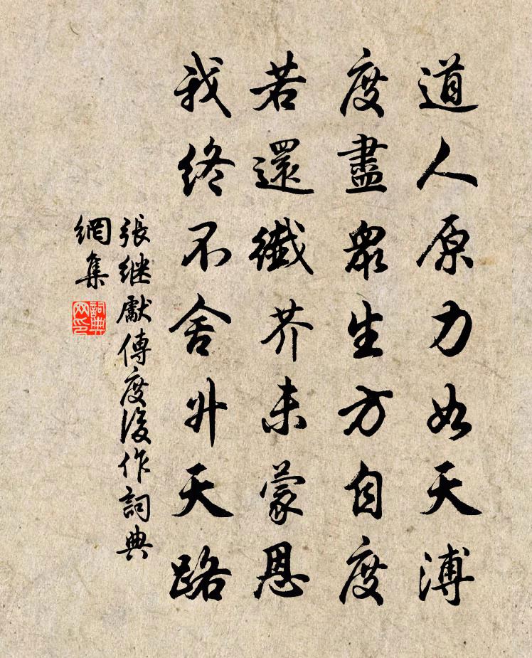 詩詞名句歷史字典書法欣賞書法字典國語詞典說文解字康熙字典古漢語字典標 題 作 者 詩 句 傳度後作作者:張繼先 朝代:宋代傳度後作原文道人原力如天溥,度盡眾生方自度。若還纖芥未蒙恩,我終不捨升天路。詩詞問答問:傳度後作的作者是誰?答:張繼先問:傳度後作寫於哪個朝代?答:宋代張繼先傳度後作書法欣賞傳度後作書法作品詩詞推薦【雙調】湘妃怨_楚天空闊楚阿魯威〔元代〕楚天空闊楚天長,一度懷人一斷腸。此心只在肩輿上,倩東風過武昌,助離愁煙水茫茫。竹上雨湘妃淚,樹中禽蜀晚歸嚴明府題門錢起〔唐代〕降士林沾蕙草寒,弦驚翰苑失鴛鸞。秋中回首君門阻,馬上應歌行路難。螢葉茵〔宋代〕自明自滅度方池,熠熠飛來去覺遲。入坐點衣情分熟,納交元在讀書時。和丘宗卿贈長句之韻楊萬里〔宋代〕君入修門才一見,我出修門風颳面。皈來急問有新詩,勺勺舉似君不疑。殿門握手冠纓絕,煙如雲破瞻秋月。老懷置酒與五客餞行因成一絕吳芾〔宋代〕送盡行人我獨留,老夫無計解離憂。勸君今夜休辭醉,明日江山總是愁。歲晚書懷陸游〔宋代〕殘歲堂堂去,新春鼎鼎來。夢移鄉國近,酒挽壯心回。暖律初催柳,晴光並上梅。東湖有歸日,衰抱得頻開。太常引佚名〔宋代〕百年勳業鏡中看。嘆行路古來難。風雨換朱顏。更誰管、安仁鬢斑。掀天聲價,凌雲氣勢,短夢破槐安。回首問青過孟浩然舊居朱慶餘〔唐代〕命合終山水,才非不稱時。冢邊空有樹,身後獨無兒。散盡詩篇本,長存道德碑。平生誰見重,應只是王維。次韻滕元發許仲途秦少游蘇軾〔宋代〕二公詩格老彌新,醉後狂吟許野人。坐看青丘吞澤芥,自慚黃潦薦溪蘋。兩邦旌纛光相照,十畝鋤犁手自親。何似登封道中三絕 轘轅道蘇轍〔宋代〕青山欲上疑無路,澗道相縈九十盤。東望嵩高分草木,回瞻原隰涌波瀾。煙雨奇觀樓吳機〔宋代〕此景儀真亦有年,何人管領向樓前。江淮自昔雖南北,煙雨從來肯變遷。萬里孤帆遺根在,半空佳句至今傳。諸公和和之南齋畫壁歌梅堯臣〔宋代〕終南下臨長安城,峻欄高檻黃金嬴。嵩山亦近洛陽陌,鮮車怒馬一日程。大梁平廣匝千里,不見雲峰來眼底。其間次潘德久韻陳造〔宋代〕沉沉王侯居,列屋皆妖妍。性斧糜春蔥,日詫歌舞筵。孰知山澤儒,超然廣文氈。野花供嫵媚,山月獻連娟。潘郎雙雁兒王哲〔元代〕奉勸伊家去西州。放散誕、做雲遊。恁時教你永無憂。這愁煩、漸漸休。款款牽回六隻牛。認水草、便風流。渾身挽王興之提刑陳傅良〔宋代〕四海王詹事,傳家有象賢。宦情塵滓外,風誼典刑邊。遺愛依前鄭,群居得少連。生平才樂此,一夢涕潸然。和任宰元紹見寄十首以歸來問信湖山撫摩松菊吳芾〔宋代〕新詩遠寄將,字字脫塵俗。時節近重陽,何由同把菊。頌古五十五首釋紹曇〔宋代〕八面玲瓏逗月寒,要尋形影十分難。無端平地生層級,湘北潭南作樣看。交代屯田惠書問紙尾批示若就江州至軍兼可腹祖無擇〔宋代〕廬山在境好行春,猶恨奇峰半屬鄰。腹背遍游煩示諭,即當先謁樂天真。袖刺劉子翬〔宋代〕袖刺謁諸鄰,徘徊寄心賞。潭潭廣廈深,咳唾生餘響。茲邦懷地寶,比屋夸雄敞。如何蓬廬士,貧賤安所養。題金碧山水卷錢選〔宋代〕煙雲出沒有無間,半在空虛半在山。我亦閒中消日月,幽林深處聽潺湲。名句推薦二人同心,其利斷金。同心之言,其臭如蘭。佚名《易傳·繫辭傳上·第八章》 巧偽不如拙誠顏之推《顏氏家訓·名實篇》 商女不知亡國恨,隔江猶唱後庭花。杜牧《泊秦淮》 焦首朝朝還暮暮,煎心日日復年年。曹雪芹《紅樓夢·第二十二回》 山有木兮木有枝,心悅君兮君不知。佚名《越人歌》 守身不敢妄為,恐貽羞於父母王永彬《圍爐夜話·第三四則》 粉墮百花洲,香殘燕子樓。曹雪芹《唐多令·柳絮》 畫船撐入花深處,香泛金卮。歐陽修《採桑子·荷花開後西湖好》 強整繡衾,獨掩朱扉,枕簟為誰鋪設。阮逸女《花心動·春詞》 日入群動息,歸鳥趨林鳴陶淵明《飲酒·七》