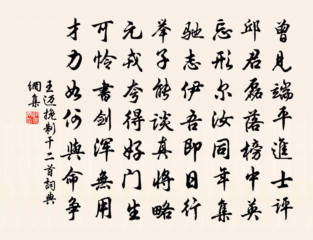 詩詞名句歷史字典書法欣賞書法字典國語詞典說文解字康熙字典古漢語字典標 題 作 者 詩 句 挽制乾二首作者:王邁 朝代:宋代挽制乾二首原文曾見端平進士評,邱君磊落榜中英。忘形爾汝同年集,馳志伊吾即日行。舉子能談真將略,元戎誇得好門生。可憐書劍渾無用,才力如何與命爭。詩詞問答問:挽制乾二首的作者是誰?答:王邁問:挽制乾二首寫於哪個朝代?答:宋代王邁挽制乾二首書法欣賞挽制乾二首書法作品詩詞推薦有懷白玉蟾〔宋代〕紫綺輕裘穩,青綾廣被長。明珠懷夜月,孤劍匣秋霜。氣魄今諸葛,襟期舊子房。西風一長嘯,草木正淒涼。浪淘沙·曹溪驛折桃花一枝數日零落裹花片投之涪江歌此左輔〔清代〕水軟櫓聲柔,草綠芳洲,碧桃幾樹隱紅樓。者是春山魂一片,招入孤舟。鄉愁不曾休,惹甚閒愁,忠州過了又涪州老嫌王安石〔宋代〕老嫌智巧累形軀,欲就田翁學破除。百歲用痴能幾許,救吾黥劓可無餘。僮方搗茶知予書初輟搗以待呼而戒之鄭剛中〔宋代〕頑童來聽老夫言,困至如今我欲眠。汝但閉門推客去,破茶不礙夢魂圓。愛詔修書述懷感事三十韻楊億〔宋代〕太極垂裳日,中原偃革初。樓船秋發詠,衡石夜程書。好問虛前席,徵賢走傳車。蓬萊侔漢製,煨燼訪秦餘。紬繹建隆郊祀八首竇儼〔宋代〕潔茲五齊,酌彼六尊。致誠斯至,率禮彌孰。以介景福,永隆後昆。重熙累治,帝道攸尊。頌古二十一首釋鼎需〔宋代〕一不問兮二不休,直須識取那鉤頭。再三回首來相見,急水波心輥繡毬。和蛾眉亭趙希逢〔宋代〕兩山相挾作眉彎,不似橫雲照眼寒。料想當年余半額,至今留得與人看。書江亭壁陳郁〔宋代〕人間風浪最傾危,君自深藏了不知。只恐隨流禹門去,又翻頭角露天池。探春令王哲〔元代〕兀然真性,杳杳默默,無微無大。一團瑩寶,光明圍繞,五彩同隨那。逍遙自在堪經過。有玉童相賀。滿空馥郁,浩西堂見和因再用韻釋紹嵩〔宋代〕沙邊鷗鷺日相親,老去光陰非我春。百巧從來知是妄,獨援詩筆得天真。增上神宗徽號一首真宗〔宋代〕於惟爾廟,乃聖乃神。秉文之士,作起惟新。建宮稽古,一視同仁。庶幾備號,以享天人。行香子明本〔元代〕無物思量。萬慮皆忘。坐兩班、大眾禪床。粗衣遮體,糲飯充腸。有一函經,一佛像,一爐香。功課尋常。道行非仲春初五日報謁曹勛〔宋代〕玉磬 * 出定音,謁酬與世費浮沉。徑松參漢周官肅,塢竹藏雲商易深。莫色溪山皆有道,春風花草本無心。年來過松江范成大〔宋代〕長虹鬥起蛟龍穴,朱碧欄乾夜明滅。太湖三萬六千頃,多少清風與明月?青鷁驚飛白鷺閒,丹楓未老黃蘆折。誰將賦何明府愛山堂劉黻〔宋代〕終日看山終日好,山不悅人人不老。愛山誰識愛山心,瘦竹長松兼碧草。立春內中帖子詞皇后閣王珪〔唐代〕正道儀中閫,柔風表六宮。一傾春日酒,萬壽與君同。偶成艾性夫〔宋代〕似是輪囷老蠹魚,尚饒蘭露入銅蜍。詩亡正恐魯無史,士賤豈容秦有書。世味幾時回橄欖,秋山隨地著蘧廬。多情頌古一百首釋智愚〔宋代〕昨日過竹院西字,鄰家稚子隔溪啼。山寒水肅半黃落,無數歸鴉卜樹棲。好事近(石亭探梅)陳克〔宋代〕尋遍石亭春,黯黯暮山明滅。竹外小溪深處,倚一枝寒月。淡雲疏雨苦無情,得折便須折。醉帽鳳鬟歸去,有餘香名句推薦時靸雙鴛響,廊葉秋聲。吳文英《八聲甘州·靈岩陪庾幕諸公游》 東君也不愛惜,雪壓霜欺。晁沖之《漢宮春·梅》 相思不管年華,喚酒吳娃市。吳文英《荔枝香近·送人游南徐》 夢裡分明見關塞,不知何路向金微。張仲素《秋閨思二首》 食之以時,用之以禮。孟子《孟子·盡心章句上·第二十三節》 登泰山而小天下。孟子《孟子·盡心章句上·第二十四節》 樹曲木者,惡得直景劉向《說苑·君道》 禍與福同門,利與害同城。佚名《增廣賢文·下集》 誰謂含愁獨不見,更教明月照流黃。沈佺期《古意呈補闕喬知之 / 古意 / 獨不見》 停車坐愛楓林晚,霜葉紅於二月花。杜牧《山行》