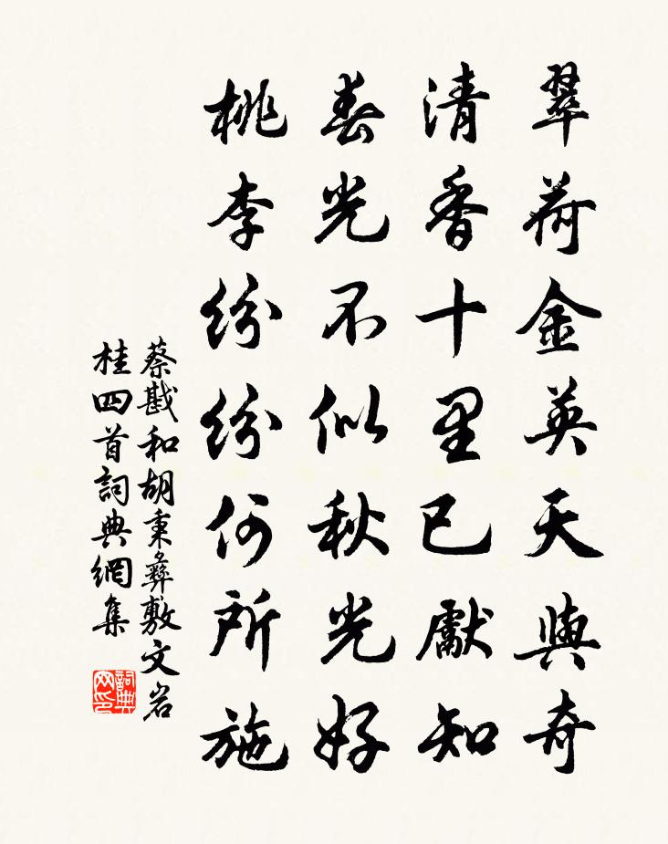 詩詞名句歷史字典書法欣賞書法字典國語詞典說文解字康熙字典古漢語字典標 題 作 者 詩 句 和胡秉彝敷文岩桂四首作者:蔡戡 朝代:宋代和胡秉彝敷文岩桂四首原文翠荷金英天與奇,清香十里已先知。春光不似秋光好,桃李紛紛何所施。詩詞問答問:和胡秉彝敷文岩桂四首的作者是誰?答:蔡戡問:和胡秉彝敷文岩桂四首寫於哪個朝代?答:宋代問:和胡秉彝敷文岩桂四首是什麼體裁?答:七絕蔡戡和胡秉彝敷文岩桂四首書法欣賞和胡秉彝敷文岩桂四首書法作品詩詞推薦和隱老詠梅韻吳芾〔宋代〕不憚行行雪滿巔,要看與雪鬭清妍。開花雖在三冬杪,結子還居萬木先。水淺橫斜聊自見,夜寒幽獨有誰憐。君詩和皇太子瑞雪二首楊萬里〔宋代〕揉雲按霧碎成塵,落不曾休酉達辰。鶴禁鏤水成七字,野人拜賜敢辭頻。夢真三首黎廷瑞〔宋代〕昔夢過宛洛,遊戲芙蓉城。道逢王子晉,邀我升天行。翩翩控鶴駕,依依吹鳳笙。銀河未西流,翩然倏遐征。碧桃南屏山董嗣杲〔宋代〕南有屏山掩翠扉,齊雲亭子漫尋基。雨淋米老琴台字,火烈溫公易卦碑。回首金魚誰撫檻,銷魂白骨自污池。春風早玩雪梅有懷親屬韓偓〔唐代〕北陸候才變,南枝花已開。無人同悵望,把酒獨裴回。凍白雪為伴,寒香風是媒。何因逢越使,腸斷謫仙才。頌古釋道顏〔宋代〕面門出入見還難,無位真人只尺間。去路一身輕似葉,高名千古重如山。游元象泊釋泚〔唐代〕空水潮色淨,澹然湖上心。舳艫輕且進,汀洲如可尋。秋風洄溯險,落日波濤深。寂寞武陵去,中流方至今。泛渦水二首宋祁〔宋代〕漠漠新茸上渚蒲,日痕波態共涵虛。無人解作江南曲,荷底田田自戲魚。蟹包高似孫〔宋代〕妙手能夸薄樣梢,桂香分人蟹為包。也在不枉持螯手,便是持螯亦草茅。古風二首寄汪明道洪邁〔宋代〕紫蘭初茁芽,深壑終自秀。骯髒蕭艾中,不採則誰咎。兒曹逐紛華,壯士保初陋。應知此詞同,萬世無先後。郭君建輓詩李彌遜〔宋代〕藹藹聲華萬耳聞,可憑詩禮大於門。浮雲終負三餘學,流水難追九逝魂。朝有青衿懷舊德,室惟黃卷富諸昆。生平魚石二首孔武仲〔宋代〕鬐鬣真可辨,精研真入神。得非造化境,亦有雕鎪人。頗疑著妄想,歲久積成真。茲理不足怪,方屏藏月輪。【越調】小桃紅楊果〔元代〕碧湖湖上采芙蓉,人影隨波動。涼露沾衣翠綃重,月明中,畫船不載凌波夢。都來一段,紅幢翠蓋,香盡滿城風。濟川阻雪九月二十七日客況 其二王冕〔元代〕濟州城南寒雪飛,濟州城北凍成圍。客情自古不稱意,世事於今轉覺非。白馬少年頻喚酒,黑紗老婦泣無衣。逢郵聞官軍收復新息曹彥約〔宋代〕降敵知無日,和戎事已休。百年艱國步,九世憶家讎。獲蔡馳新捷,收京有定謀。可無蜂蠆慮,馬健更防秋。袁興國輓詞二首方回〔宋代〕所化神如在,名高志未伸。文章坡老筆,豐度華陽巾。愷悌州符屢,旬宣閫畫頻。鼎台袖吾手,覆餗彼何人。題荊溪圖張監〔宋代〕斬蛟橋北玉樞府,高樹連雲第一家。欲向新圖問何處,客窗風雨對梨花。錢府舊園黃庚〔宋代〕十二峰前富貴家,亂離不復舊繁華。亭台寂寂無不到,流泉東風自落花。偈頌一百零二首釋慧遠〔宋代〕紅霞穿碧落,白鷺點蒼苔。不得顏良首,誰能嘆善哉。根向梢頭出,子從花裹開。只遮是,不須猜,青山綠水鬢邊行香子 贈不語王哥王處一〔元代〕真樂閒閒。口過刪刪。養沖和、屏盪愚頑。圓融法性,復變童顏。便出三乘,超十地,不為難。五彩迴環。烹鍊金名句推薦惟將終夜常開眼,報答平生未展眉。元稹《遣悲懷三首·其三》 半壁橫江矗起,一舟載雨孤行。歸莊《錦堂春·半壁橫江矗起》 力田已告成,計日宜收藏。黃燮清《秋日田家雜詠》 山氣日夕佳,飛鳥相與還。陶淵明《飲酒·其五》 不用憑欄苦回首,故鄉七十五長亭。杜牧《題齊安城樓》 去其智,絕其能,下不能意。韓非及後人《韓非子·主道》 在善用,不在眾。宋祁、歐陽修、范鎮、呂夏卿等《新唐書·列傳·卷三十六》 易挑錦婦機中字。難得玉人心下事。劉克莊《玉樓春·戲林推》 隔水氈鄉,落日牛羊下,區脫縱橫。張孝祥《六州歌頭·長淮望斷》 時雨降矣,而猶浸灌,其於澤也,不亦勞乎!莊子《莊子·內篇·逍遙遊》