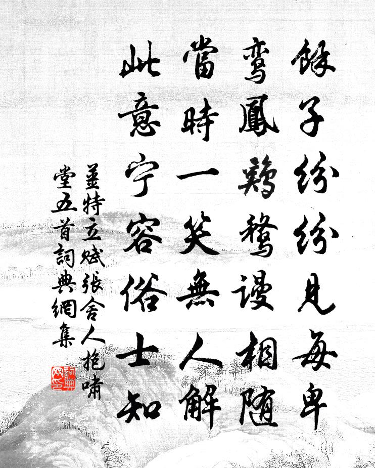詩詞名句歷史字典書法欣賞書法字典國語詞典說文解字康熙字典古漢語字典標 題 作 者 詩 句 賦張舍人抱嘯堂五首作者:姜特立 朝代:宋代賦張舍人抱嘯堂五首原文餘子紛紛見每卑,鸞鳳雞鶩謾相隨。當時一笑無人解,此意寧容俗士知。詩詞問答問:賦張舍人抱嘯堂五首的作者是誰?答:姜特立問:賦張舍人抱嘯堂五首寫於哪個朝代?答:宋代姜特立賦張舍人抱嘯堂五首書法欣賞賦張舍人抱嘯堂五首書法作品詩詞推薦雜感十首以野曠沙岸淨天高秋月明為韻陸游〔宋代〕斗杓運四序,寒暑忽已換。人生知幾何,去日難把玩。憑高望煙海,青山忽中斷。秋風肺病蘇,為子巾一岸。座間分韻得道字王義山〔宋代〕一年景物秋最好,秋到重陽秋更老。留取黃花待再來,殷勤寄與西風道。菊花了後到梅花,梅花開時雪交加。何當謹次十七叔去鄭詩韻二章以寄家叔一章以自詠陳與義〔宋代〕鏡中無復故人憐,卻愧謀生後計然。叔夜本非堪作吏,元龍今悔不求田。懷親更值薪如桂,作客重看栗過拳。萬事感興寄蓮岳一二詩禪友寇準〔宋代〕西風傷遠別,前計競成非。芳草此時暮,故山何日歸。禪應同雅道,貧合長天機。翻憶雲溪伴,無憀對落暉。黑白何咎釋智愚〔宋代〕世事亂如麻,情人未到家。連延深院雨,滴碎後庭花。舊話幾時別,音書未有涯。暝煙將四合,何處起胡笳。品梅李龍高〔宋代〕疏花鼎立睨霜風,二季居然侍一翁。生願素絲無點汙,黑衣人自作三公。依韻和丁學士陪諸公城東飲梅堯臣〔宋代〕黃花秋草滿荒台,聯馬鳴珂未欲回。上苑自將馳道隔,高林空望白雲開。薦餚已去紗籠冪,賜醞新從蟻瓮來。天氣送沈信臣赴試南宮五首韓元吉〔宋代〕吾謀不用可無人,小技文章亦有神。一第區區兒戲耳,請君折取桂為薪。游禁苑陪幸臨渭亭遇雪應制李嶠〔唐代〕同雲接野煙,飛雪暗長天。拂樹添梅色,過樓助粉妍。光含班女扇,韻入楚王弦。六出迎仙藻,千箱答瑞年。折楊柳三首(一作段成式詩)王貞白〔唐代〕枝枝交影鎖長門,嫩色曾沾雨露恩。鳳輦不來春欲盡,空留鶯語到黃昏。水殿年年占早芳,柔條風裡御爐香。如今題海首座俠客像陸游〔宋代〕趙魏胡塵千丈黃,遺民膏血飽豺狼。功名不遣斯人了,無奈和戎白面郎!吳中友人惠蟹宋祁〔宋代〕秋水江南紫蟹生,寄來千里佐吳羹。楚人慾使衷留甲,齊客何妨死願烹。下筯未休資快嚼,持螫有味散朝酲。定知詠梅雜詩張道洽〔宋代〕小小茅茨野老家,不隨桃李競春華。欲知格韻真孤絕,禿盡千林始一花。次韻明法游法相院二首郭印〔宋代〕市近清江隔,林深古寺幽。竹光濃欲滴,山色翠交浮。咫尺人稀到,尋常客共游。機心吾已息,來往不驚鷗。題江夏修靜寺(此寺是李北海舊宅)李白〔唐代〕我家北海宅,作寺南江濱。空庭無玉樹,高殿坐幽人。書帶留青草,琴堂冪素塵。平生種桃李,寂滅不成春。浣溪沙(竹洲七夕)吳儆〔宋代〕秋到郊原日夜涼。黍禾高下已垂黃。荷花猶有晚來香。天上佳期稱七夕,人間好景是秋光。竹洲有月可徜徉。已亥雜詩 298龔自珍〔清代〕九邊爛熟等雕蟲,遠志真看小草同。枉說健兒身手在,青燈夜雪阻山東。偈頌二十九首釋雲〔宋代〕雲門普,風穴瞎。三門外金剛,冷地里笑殺。惠文伯居士請贊釋崇岳〔宋代〕助下三拳,攔顋一掌。據令而行,誰知痕癢。轉身一拶驗來端,楊岐種草鐵心肝。蚤蒲壽宬〔宋代〕疾眺若幻術,常笑虱縫拘。動致磨齒牙,害止搔皮膚。纖芥何足雲,有人飼於菟。名句推薦巫峽啼猿數行淚,衡陽歸雁幾封書。高適《送李少府貶峽中王少府貶長沙》 十分不耐煩,乃為人大病王永彬《圍爐夜話·第五四則》 君若清路塵,妾若濁水泥;曹植《明月上高樓》 嗚呼!楚雖三戶能亡秦,豈有堂堂中國空無人!陸游《金錯刀行》 三冬暫就儒生學,千耦還從父老耕。陸游《觀村童戲溪上》 其出不出,間不容髮。班固《漢書·傳·賈鄒枚路傳》 傷心枕上三更雨,點滴霖霪。李清照《添字醜奴兒·窗前誰種芭蕉樹》 雁過也,正傷心,卻是舊時相識。李清照《聲聲慢·尋尋覓覓》 為上者疑,為下者懼。上下背德,禍必興焉。來俊臣《羅織經·事上卷第二》 驅馬天雨雪,軍行入高山。杜甫《前出塞九首》