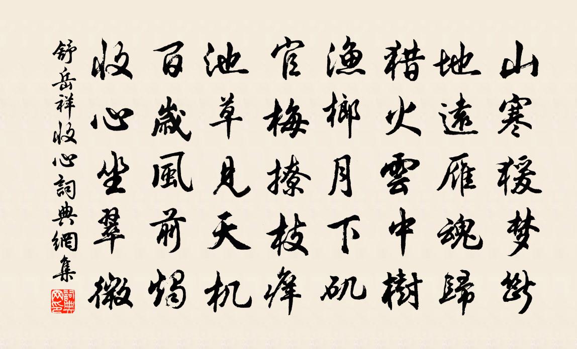 詩詞名句歷史字典書法欣賞書法字典國語詞典說文解字康熙字典古漢語字典標 題 作 者 詩 句 收心作者:舒岳祥 朝代:宋代收心原文山寒猨夢斷,地遠雁魂歸。獵火雲中樹,漁榔月下磯。官梅撩枝癢,池草見天機。百歲風前燭,收心坐翠微。詩詞問答問:收心的作者是誰?答:舒岳祥問:收心寫於哪個朝代?答:宋代舒岳祥收心書法欣賞收心書法作品詩詞推薦靖州歌佚名〔宋代〕小娘子,葉底花,無事出來吃盞。紀夢高似孫〔宋代〕翠峰嵯峨三十六,寒泉落空響哀玉。岩花石路勢縈紆,玉蘭乾護修筠綠。雪髯老人負紫瓢,金絲塵尾遙相招。紅螺和題毗陵薦福寺紅梅賀鑄〔宋代〕一種梅生禪老家,屋檐古乾恣鼓斜。詩人莫訝深紅色,可勝尋常桃杏花。攤破江城子/江城梅花引程垓〔宋代〕娟娟霜月又侵門。對黃昏。怯黃昏。愁把梅花,獨自泛清尊。酒又難禁花又惱,漏聲遠,一更更,總斷魂。斷魂。題濟勝七物二扇陳造〔宋代〕何人月樣剪霜綈,改就新詩卻自題。為惜持杯折花手,免教遮日步蘇堤。送李惟肖尉尤溪陳襄〔宋代〕朝廷厭煩苛,往還按察詔。四方小大官,政惡日無譙。悲哉窮遠民,天耳不可嘂。訟爭細毛髮,吏議舉烽爝。追胥九仙山徐師仁〔宋代〕晨逾九仙山,暮訪九鯉湖。何氏兄弟跨鯉魚,同時輕舉排天衢。山頭雲氣故恍惚,三十六鱗今有無。瓊漿白日醉天句王洙〔宋代〕槐杪青蟲縋夕陽。再入台作馬遵〔宋代〕連蹇多年心欲灰,厭為欲吏走塵埃。豈知黃紙新書下,還送青氊舊物來。武騎強為終不意,河南難問愧無才。一麾贈鄉人周從龍談命劉過〔宋代〕廬陵儒萬人,頗亦出青紫。老子三不歸,未省鄉里士。暮年罕交遊,僅識子周子。風流屬當行,豈止談天爾。夜從送津赴紹興倅八首吳芾〔宋代〕讀書已負少年時,老大空疏愧我知。汝肯為余償此志,雖窮亦是起家兒。酬凌秀才惠枕張祜〔唐代〕八寸黃楊惠不輕,虎頭光照簟文清。空心想此緣成夢,拔劍燈前一夜行。陳公藻覓筍仍許作包子陳棣〔宋代〕玉版禪師來應供,錦繃稚子敢分珍。並包更藉桄榔屑,風味懸知定可人。寄贈高知縣宋祁〔宋代〕綠髮如雲艾綬青,弦歌百里久沈英。琴台滯訟投刀釋,月觀雕章夢草成。紫芋蹲鴟編富籍,飛觴浮蟻析朝酲。何當感舊韓偓〔唐代〕省趨弘閣侍貂璫,指座深恩刻寸腸。秦苑已荒空逝水,楚天無限更斜陽。時昏卻笑朱弦直,事過方聞鎖骨香。入室偈頌二十九首釋雲〔宋代〕佛是塵,法是塵,區區馳覓謾勞謾。向道莫行山下路,果然猿叫斷腸聲。記病蘇轍〔宋代〕我病在脾胃,一病四十年。微傷輒暴下,傾注如流泉。去年醫告我,此病猶可痊。試取姜豆附,三物相和丸。服之題落星寺一首王阮〔宋代〕島石是處有,星辰曾霣無。莊嚴成淨土,怪誕出浮屠。蜃氣樓穿海,龍堆沙擁湖。盡除金碧像,吾欲舍吾徒。喜雨三首吳潛〔宋代〕西抹東塗老不禁,芙蓉洲畔更浮沈。數莖半黑半絲髮,一寸憂晴憂雨心。烏糤且欣將淅玉,紅蓮何翅已抽簪。小臣郊廟歌辭。周宗廟樂舞辭。忠順佚名〔唐代〕稱文既表溫柔德,示武須成蹈厲容。綴兆疾舒皆應節,明明我祖樂無窮。名句推薦娉娉裊裊十三餘,豆蔻梢頭二月初。杜牧《贈別二首》 京口瓜洲一水間,鐘山只隔數重山王安石《泊船瓜洲》 吹到一片秋香,清輝了如雪。納蘭性德《琵琶仙·中秋》 相顧無言,惟有淚千行。蘇軾《江城子·乙卯正月二十日夜記夢》 還怕兩人俱薄命,再緣慳、剩月零風裡。納蘭性德《金縷曲·亡婦忌日有感》 人歸山郭暗,雁下蘆洲白。韋應物《夕次盱眙縣》 今朝有酒今朝醉,莫管門前是與非。吳承恩《西遊記·第五回》 試問梅花何處好,與君藉草攜壺。張孝祥《臨江仙·試問梅花何處好》 滿目飛花萬點,回首故人千里,把酒沃愁腸。葛長庚《水調歌頭·江上春山遠》 君不見管鮑貧時交,此道今人棄如土。杜甫《貧交行》