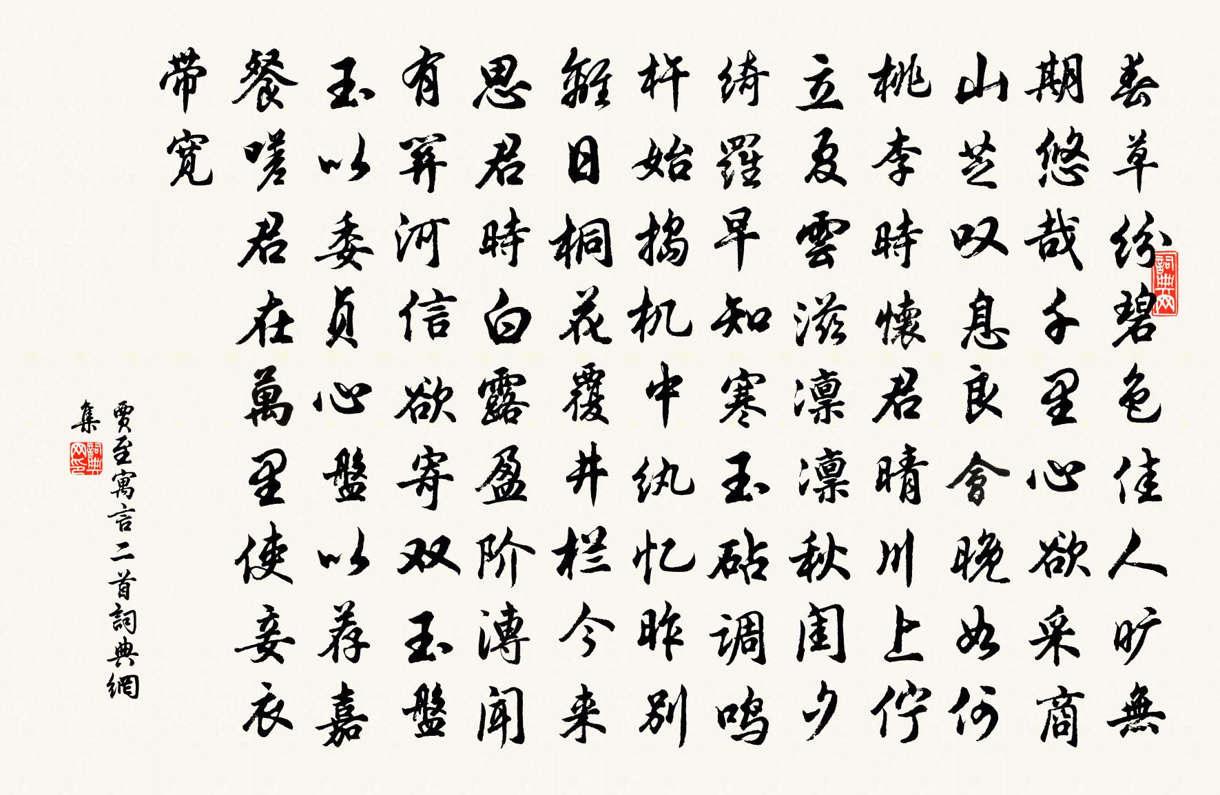 詩詞名句歷史字典書法欣賞書法字典國語詞典說文解字康熙字典古漢語字典標 題 作 者 詩 句 寓言二首作者:賈至 朝代:唐代寓言二首原文春草紛碧色,佳人曠無期。悠哉千里心,欲采商山芝。嘆息良會晚,如何桃李時。懷君晴川上,佇立夏雲滋。凜凜秋閨夕,綺羅早知寒。玉砧調鳴杵,始搗機中紈。憶昨別離日,桐花覆井欄。今來思君時,白露盈階漙。聞有關河信,欲寄雙玉盤。玉以委貞心,盤以薦嘉餐。嗟君在萬里,使妾衣頻寬。詩詞問答問:寓言二首的作者是誰?答:賈至問:寓言二首寫於哪個朝代?答:唐代問:寓言二首是什麼體裁?答:五古賈至寓言二首書法欣賞寓言二首書法作品注釋全唐詩:卷235_9詩詞推薦滿庭芳(九日用淵明二詩作)趙鼎〔宋代〕靡靡流光,淒淒風露,小園草木初凋。杳然塵影,爽氣界天高。愛此佳名重九,隨宜對、秋菊持醪。登臨處,哀蟬夜與鄰幾持國歸梅堯臣〔宋代〕紅塵夜不息,橫衢若煙霧。朝見車馬來,暮見車馬去。車中目炯炯,馬上情遽遽。交相知是誰,飛先無覓處。竹岩道間趙蕃〔宋代〕前山後山異夷險,昨日今日分炎涼。人間萬事只如此,那似一杯真意長。命里文天祥〔宋代〕熊羆十萬建行台,單騎誰教免胄來。一日捉將沙漠去,遭逢碧眼老回回。錦堂春/錦堂春慢司馬光〔宋代〕紅日遲遲,虛廊轉影,槐陰迤邐西斜。彩筆工夫,難狀晚景煙霞。蝶尚不知春去,漫繞幽砌尋花。奈猛風過後,縱次韻周守二首張嵲〔宋代〕秋色際遙海,乘高傷遠眸。風塵方未艾,身世豈勝愁。 * 已過晚,濁醪徒滿甌。何時奉松□,一醉碧溪頭。次韻文潛同游王舍人園黃庭堅〔宋代〕移竹淇園下,買花洛水陽。風煙二十年,花竹可迷藏。九衢流車馬,相值各匆忙。豈有道邊宅,靜居如寶坊。幅巾荔枝劉望之〔宋代〕滬戎瘴癘窟,閩粵山水鄉。如何產此物,爛然照炎荒。再賦喜雪二首吳潛〔宋代〕夜深如水潑衣衾,曉看皚皚冒碧岑。以潔藏污窺物理,由仁行義見天心。但教南畝多呈瑞,何必東夷屢獻琛。麥熟梅花二首趙蕃〔宋代〕折來才見開三四,但覺槎牙亂經笥。遲明已復吐六七,頗怪鮮明侵竹隔。多花璀璨固可人,疏花的皪意逾真。固知宿西山精舍釋文兆〔宋代〕西山乘興宿,靜稱寂寥心。一徑杉松老,三更雨雪深。草堂僧語息,雲閣磬聲沈。未遂長棲此,雙峰曉街尋。玉汝弟創治新居作詩見詒次韻為答韓維〔宋代〕止足嘉言每念茲,不應華發嘆歸遲。非關啟第夸三戰,直為營巢欠一枝。盛放清風來北戶,細分鳴溜入西池。十年危語權德輿〔唐代〕被病獨行逢乳虎,狂風駭浪失棹櫓。舉人看榜聞曉鼓,孱夫孽子遇妒母。如夢令劉辰翁〔宋代〕寂歷柳風斜倚。錯莫夢雲難記。花影為誰重,一握鮫人絲淚。何事。何事。歷歷臉潮羞起。贈清逸魏閒處士宋祁〔宋代〕奕世依岩石,褒恩下帝庭。姓名高士傳,父子少微星。池溜遙通澗,家林近帶坰。分明詔書意,天極賜鴻冥。光武帝臨淄勞耿弇劉秀〔兩漢〕車駕至臨溜自勞軍,群臣大會。帝謂弇曰:“昔韓信破歷下以開基,今將軍攻祝阿以發跡,此皆齊之西界,功足相雨中邀李范庵過天竺寺作蘇軾〔宋代〕步來禪榻畔,涼氣逼團蒲。花雨檐前亂,茶煙竹下孤。乘閒攜畫卷,習靜對香罏。到此忽終日,浮生一事無。夏夜聞雨方回〔宋代〕可以逃袢暑,征徒盍少休。病多全為老,醉極暫無愁。雨氣昏燈夜,蛬聲古屋秋。錢塘湖上路,到日與誰游。依韻和永叔秋日東城郊行梅堯臣〔宋代〕郊原物老莽然中,寓興驅車向國東。夾道名園迷屈曲,壓枝秋實亂青紅。寒畦覆綠將收菜,野蝶雙飛尚繞叢。田父水牡丹洪咨夔〔宋代〕魏紫潛緋真正紅,天公不管老東風。紫袍玉帶雙魚掛,猶把闌珊造化功。名句推薦曲則全,枉則直,窪則盈,敝則新,少則得,多則惑。老子《老子·道經·第二十二章》 非淡泊無以明志,非寧靜無以致遠。諸葛亮《誡子書》 木落雁南度,北風江上寒。孟浩然《早寒江上有懷 / 早寒有懷 / 江上思歸》 蓬門未識綺羅香,擬托良媒益自傷。秦韜玉《貧女》 龍魚失水難為用,龜玉蒙塵未見珍牟融《春日山亭》 十年種木,一年種穀,都付兒童。元好問《人月圓·重岡已隔紅塵斷》 空勞縴手,解佩贈情人。牛希濟《臨江仙·柳帶搖風漢水濱》 遠牧牛,繞村四面禾黍稠。李涉《牧童詞》 燕歌未斷塞鴻飛,牧馬群嘶邊草綠。李益《塞下曲·其一》 凡所有相。皆是虛妄。若見諸相非相。則見如來。鳩摩羅什譯《金剛經·如理實見》