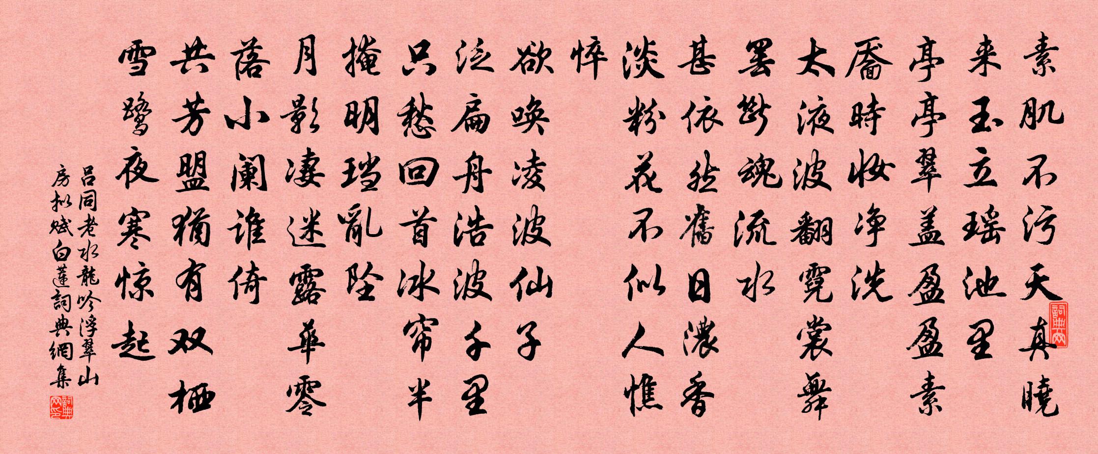 詩詞名句歷史字典書法欣賞書法字典國語詞典說文解字康熙字典古漢語字典標 題 作 者 詩 句 水龍吟(浮翠山房擬賦白蓮)作者:呂同老 朝代:宋代原文素肌不污天真,曉來玉立瑤池裡。亭亭翠蓋,盈盈素靨,時妝淨洗。太液波翻,霓裳舞罷,斷魂流水。甚依然、舊日濃香淡粉,花不似,人憔悴。欲喚凌波仙子。泛扁舟、浩波千里。只愁回首,冰簾半掩,明璫亂墜。月影淒迷,露華零落,小闌誰倚。共芳盟,猶有雙棲雪鷺,夜寒驚起。詩詞問答問:《水龍吟(浮翠山房擬賦白蓮)》的作者是誰?答:呂同老問:該詩寫於哪個朝代?答:宋代問:該詩是什麼體裁?答:詞書法欣賞水龍吟(浮翠山房擬賦白蓮)書法作品詩詞推薦寄信守徐穉山侍郎曾幾〔宋代〕歸去來兮莫問津,有船即買擊江濱。自應一學陶元亮,不用更呼祁孔賓。已卜春前春後日,重尋水北水南人。使君句佚名〔唐代〕萬般思後行,一失廢前功。(《觀棋》)黃河王安石〔宋代〕派出崑崙五色流,一支黃濁貫中州。吹沙走浪幾千里,轉側屋閭無處求。宛陵東峰亭與友人話別李頻〔唐代〕坐舉天涯目,停杯語日晡。修篁齊迥檻,列岫限平蕪。亂水通三楚,歸帆掛五湖。不知從此去,何處是前途。回先生過湖州東林沈氏,飲醉,以石榴皮書其蘇軾〔宋代〕世俗何知貧是病,神仙可學道之餘。但知白酒留佳客,不問黃公覓素書。鷓鴣天陸游〔宋代〕家住蒼煙落照間。絲毫塵事不相關。斟殘玉瀣行穿竹,卷罷黃庭臥看山。貪嘯傲,任衰殘。不妨隨處一開顏。元知郡務稍簡因得整比舊詩並連綴焚削封章繁委篋笥…樂天元稹〔唐代〕近來章奏小年詩,一種成空盡可悲。書得眼昏朱似碧,用來心破發如絲。催身易老緣多事,報主深恩在幾時。天遣紹興淳熙分命館職定撰十七首佚名〔宋代〕帝在合宮,鑒觀盛禮。黍稷惟聲,神心則喜。禮務光成,亦既歸止。億萬斯年,以貺多祉。奉贈蘧庵先生陳維崧〔清代〕識得詞仙否?起從前、歐蘇辛陸,為先生壽。不是花顛和酒惱,豪氣軒然獨有。要老筆、萬花齊繡。擲碎琵琶今破陰寒終日兀坐范成大〔宋代〕東風微解綴檐冰,仍喜朝來井水清。臘淺得春全未暖,雪慳和雨最難晴。小窗日暖猶棋局,窮巷更深尚屐聲。莫把題慈照坦上人房應山閣釋文珦〔宋代〕禪心直以山為體,不與終南捷徑同。吟久白雲生曲檻,定回明月在前峰。子牙釣石臨溪古,博望槎源與漢通。自有善卷先生壇蔡崑〔宋代〕幾到壇邊登閣望,因思遺蹟詠今朝。當時若為重華出,不是先生傲帝堯。玉照堂觀梅二十首張鎡〔宋代〕山際樓台水際村,見梅常是動吟魂。全身此日清芬里,籬落疎斜水喜論。樂天狂歌詞滕岑〔宋代〕憶昔少狂逸,舞酒即典衣。痛飲至爛醉,危坐讀楚詞。今我已衰老,不復如前痴。尚要飲酒醪,聊用度歲時。為儒郊廟歌辭祀圜丘樂章凱安褚亮〔唐代〕昔在炎運終,中華亂無象。酆郊赤烏見,邙山黑雲上。大資下周車,禁暴開殷網。幽明同葉贊,鼎祚齊天壤。存方寸地葉茵〔宋代〕客問燕山地,燕山地不多。祗因解培植,桂子綠婆娑。交傍晚凝子華見寄陳著〔宋代〕老矣息林邱,平生不徑由。知心時一見,安分別無求。寒臥死中活,榮華樂處憂。世閒何限事,曾看過雲不。寄彰明任光祿遵聖文同〔宋代〕軒軒任公子,本是釣鰲人。手把虹蜺竿,一舉百萬鈞。得鰲謂無用,坐卷千丈綸。卻自絓蚯蚓,淺瀨收纖鱗。悠悠答外郭暉妻〔宋代〕碧紗窗下訓緘封,盡紙從頭入尾空。應是仙郎懷別恨,憶人全在不言中。送辛幼安殿撰造朝陸游〔宋代〕稼軒落筆凌鮑謝,退避聲名稱學稼。十年高臥不出門,參透南宗牧牛話。功名固是券內事,且葺園廬了婚嫁。千篇名句推薦禍與福同門,利與害同城。佚名《增廣賢文·下集》 疾雷不及塞耳,疾霆不暇掩目。劉安及其門客《淮南子·兵略訓》 思則有備,有備無患左丘明《左傳·襄公·襄公十一年》 新秋逢閏,鵲橋重駕,兩度人間乞巧。顧太清《鵲橋仙·雲林矚題閏七夕聯吟圖》 黃霧漲天雪晦冥,黑雲拂地風膻腥沈約《昭君辭》 客有哀時失職而聽者,淚淋浪以沾襟。李白《幽澗泉》 東風不為吹愁去,春日偏能惹恨長。賈至《春思二首·其一》 紛紛紅紫已成塵,布穀聲中夏令新。陸游《初夏絕句》 有約不來過夜半,閒敲棋子落燈花。趙師秀《約客》 白頭太守真愚甚,滿插茱萸望辟邪。宋祁《九日置酒》