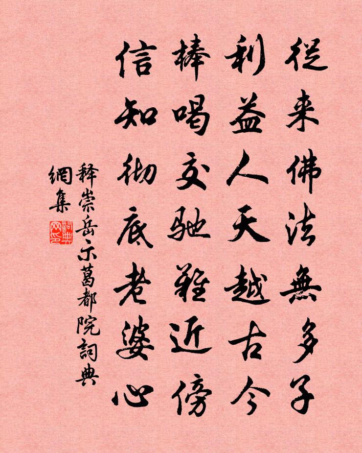 詩詞名句歷史字典書法欣賞書法字典國語詞典說文解字康熙字典古漢語字典標 題 作 者 詩 句 示葛都院作者:釋崇岳 朝代:宋代示葛都院原文從來佛法無多子,利益人天越古今。棒喝交馳難近傍,信知徹底老婆心。詩詞問答問:示葛都院的作者是誰?答:釋崇岳問:示葛都院寫於哪個朝代?答:宋代釋崇岳示葛都院書法欣賞示葛都院書法作品詩詞推薦酹江月譚處端〔元代〕玉花漸吐,被清風。催結金蓮光聚。歷劫昏迷齊照破,直透無為門戶。七返回光,三空覺照,間隔金花處。殷勤鍛用梅山醉中韻三首陳著〔宋代〕一窗桃李夾垂陽,一卷離騷一炷香。閉眼坐來開眼笑,到笑言處是春光。侍宴詠反舌詩沈約〔南北朝〕假容不足觀。遺音猶可薦。幸蒙喬樹恩。得以聞高殿。和子瞻和陶淵明雜詩十一首蘇轍〔宋代〕我來適惡歲,斗米如珠量。何時舉頭看,歲月守心房。念我東坡翁,忍飢海中央。願翁勿言飢,稷調陰陽。玉池有書意陸游〔宋代〕養生慕黃老,為治法唐虞。耆壽緣憂懼,危亡坐燕娛。大川宜利涉,蔓草戒難圖。退士惟身慮,銘膺豈敢無!休屏怪松釋智愚〔宋代〕蛟乾虬枝巧作蟠,鱗鱗鬣鬣自生寒。臥間不致為妖去,只就濤聲起處看。秋夜與劉碭山泛宴喜亭池李白〔唐代〕明宰試舟楫,張燈宴華池。文招梁苑客,歌動郢中兒。月色望不盡,空天交相宜。令人慾泛海,只待長風吹。雜曲歌辭。濮陽女佚名〔唐代〕雁來書不至,月照獨眠房。賤妾多愁思,不堪秋夜長。鷓鴣天(送陳倅正字攝峽州)張孝祥〔宋代〕人物風流冊府仙。誰教落魄到窮邊。獨班未引甘泉伏,三峽先尋上水船。斟楚酒,扣湘弦。竹枝歌里意悽然。明時舒州下寒驛題壁佚名〔宋代〕北堂無老信來稀,十載秋風雁自飛。今日滿頭生白髮,千山鄉路為誰歸。古意袁枚〔清代〕妾自夢香閨, 忘郎在遠道。不慣別離情, 回身向空抱。偶題朱熹〔宋代〕步隨流水覓溪源,行到源頭卻惘然。始信真源行不到,倚筇隨處弄潺湲。白髮吳則禮〔宋代〕白髮不奈短,青春何太奇。酒西花雨後,茶鼎柳綿時。瘦莧枯腸慣,清香老鼻知。胡床元自穩,羽扇未應遲。情話和張君春曉園黎廷瑞〔宋代〕知道芳菲只恁休,也應秉燭及春遊。來牛去馬乾坤老,舊燕新鴻歲月流。千里空勞芳草夢,一樽聊慰落花愁。桃源夜坐吳可〔宋代〕索索風搖幕,亭亭月過牆。晴雷推粉磨,夜雨壓槽床。和韋開州盛山十二首。胡蘆沼張籍〔唐代〕曲沼春流滿,新蒲映野鵝。閒齋朝飯後,拄杖繞行多。仙姑對奕圖黃庚〔宋代〕碧玉花冠素錦裳,對拈棋子費思量。終年不下神仙著,想是蓬萊日月長。寄懷趙南紀二首趙蕃〔宋代〕自別匡廬去,名山不再逢。圖看白鹿洞,詩詠紫霄峰。泉石難名狀,煙雲幾許重。巾車君儻命,襆被我斯從。和楚屯田同曾子固陸子履觀予堂前石榴花梅堯臣〔宋代〕堂下一匹鄭虔馬,欄邊兩株安石榴。但能有酒邀佳客,亦任狂花落素甌。侍女紅裙無好色,主人白髮自侵頭。欲歌送浮屠曇遠歸無為持缽王之道〔宋代〕一筇春色滿郊畿,彈指淮南迅若飛。丈室正須香積供,孤雲聊作故山歸。長安城裡風煙好,錦繡溪頭筍蕨肥。我有名句推薦酌酒會臨泉水,抱琴好倚長松。王維《田園樂七首·其七》 夫謀必素見成事焉,而後履之左丘明《國語·吳語·越王勾踐命諸稽郢行成於吳》 積土成山,風雨興焉;荀子《勸學》 大獵而後見善射,集議而後知能言宋濂、王褘《元史·列傳·卷五十》 漢家君臣歡宴終,高議雲台論戰功。王維《少年行四首》 時不可留,眾不可逆。范曄《後漢書·本紀·光武帝紀上》 水墨畫疏窗,孤影淡瀟湘。納蘭性德《木蘭花慢·立秋夜雨送梁汾南行》 池台竹樹三畝餘,至今人道江家宅。劉禹錫《金陵五題·並序》 海風吹不斷,江月照還空。李白《望廬山瀑布水二首》 廉者常樂無求,貪者常憂不足。王通《中說·卷一·王道篇》