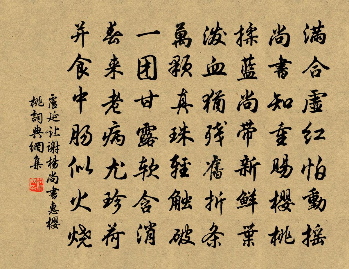 詩詞名句歷史字典書法欣賞書法字典國語詞典說文解字康熙字典古漢語字典標 題 作 者 詩 句 謝楊尚書惠櫻桃作者:盧延讓 朝代:唐代謝楊尚書惠櫻桃原文滿合虛紅怕動搖,尚書知重賜櫻桃。揉藍尚帶新鮮葉,潑血猶殘舊折條。萬顆真珠輕觸破,一團甘露軟含消。春來老病尤珍荷,並食中腸似火燒。詩詞問答問:謝楊尚書惠櫻桃的作者是誰?答:盧延讓問:謝楊尚書惠櫻桃寫於哪個朝代?答:唐代問:謝楊尚書惠櫻桃是什麼體裁?答:七律盧延讓謝楊尚書惠櫻桃書法欣賞謝楊尚書惠櫻桃書法作品注釋全唐詩:卷715-7詩詞推薦送鈐轄館使王公程戡〔宋代〕歸騎翩翩去路賒,郁蔥佳氣望天涯。艱危劍閣三千里,惠愛刀州十萬家。龍尾道邊瞻日彩,鹿頭關外別春華。金明薊北寒月作貫休〔唐代〕薊門寒到骨,戰磧雁相悲。古屋不勝雪,嚴風欲斷髭。清吟得冷句,遠念失佳期。寂寞誰相問,迢迢天一涯。臨安泛舟虞儔〔宋代〕雨送行人上短篷,東君更借一帆風。桃源春水半稿穩,錦谷清溪幾曲通。遠岫天邊凝晚碧,夕陽波面泛微紅。舟行三月三日上忠襄墳,因之行散,得十絕句楊萬里〔宋代〕草藉輪蹄翠織成,花圍巷陌錦韙屏。早來指點遊人處,今在遊人行處行。溫泉易士達〔宋代〕當日溫泉浴太真,豈知繡襪解塵生。更於洗滑凝脂處,尚憶胡兒在錦繃。翠微亭連久道〔宋代〕行跡年來酬□希,獨□岩壑有深期。□□道士能相屬,請和空山木落詩。鶴鳴亭絕句四首辛棄疾〔宋代〕飽飯閒遊繞小溪,卻將往事細尋思。有時思到難思處,拍碎闌乾人不知。送程子方歸蜀仇遠〔宋代〕薄葺田園溧澤邊,鄉心常夢蜀山川。梨花知幾逢寒食,麥飯誰能灑墓田。矍鑠老翁輕客路,扶攜稚子上江船。東還大扶范成大〔宋代〕身如魚躍上長竿,路似鏡中相對看。珍重山丁扶我過,人間踽踽獨行難。杜工部有同谷七歌其辭高古難及而音節悲壯可王炎〔宋代〕有弟有弟手足親,與我鼎立成三人。叔氏鰥居苦多病,季了宦遊依舊貧。吾兄既終弟亦逝,歲晚惸惸惟一身。嗚呼淨因院建炎兵火獨存紀事聞人偲〔宋代〕湖海浮學二十年,重來春色尚依然。杏花籬落噴紅霧,楊柳林塘護綠煙。草暖村人出遊地,鳩鳴刺史勸農天。覺場自負韓偓〔唐代〕人許風流自負才,偷桃三度到瑤台。至今衣領胭脂在,曾被謫仙痛咬來。心月照雲溪 俗名驀山溪王哲〔元代〕一身之內,二物成真寶。著意辯三才,列四象、五行化造。六賊門外,七魄莫狂游,八卦定,九宮通,功行十分到贈匡山道者章孝標〔唐代〕嘗聞一粒功,足以反衰容。方寸如不達,此生安可逢。寄書時態盡,憶語道情濃。爭得攜巾屨,同歸鳥外峰。七夕二首·其二德容〔唐代〕織女牽牛送夕陽,臨看不覺鵲橋長。最傷今夜離愁曲,遙對天涯愈斷腸。賦石昌言家五題其二白石寒樹屏梅堯臣〔宋代〕名畫不復生,古魂埋地底。技能無所發,騁巧嶄岩里。纖纖掃蒼林,坡岸分迤邐。近可筆發窺,遠若風霾起。遂令銅官懸望五松山黃庭堅〔宋代〕北風無時休,崩浪聒天響。蛟鼉好為祟,此物俱神王。我來五松下,白髮三千丈。松門閉青苔,惜哉不得往。今日句陽枋〔宋代〕五載彈冠尚覺忙。送進士韋序赴舉鄭谷〔唐代〕丹霞照上三清路,瑞錦裁成五色毫。波浪不能隨世態,鸞凰應得入吾曹。秋山晚水吟情遠,雪竹風松醉格高。預想摸魚兒張繼先〔宋代〕甚山靈、鬥奇夸巧,懸峰遙獻形似。倉船爐灶無封閉,零下車羅機履。山臨水。任瓮杵、轆轤廄架俱閒毀。床棺塵名句推薦吳洲春草蘭杜芳,感物思歸懷故鄉。宋之問《寒食江州滿塘驛》 天下有道,卻走馬以糞。天下無道,戎馬生於郊。老子《老子·德經·第四十六章》 不種閒花,池亭畔、幾竿修竹。陸容《滿江紅·詠竹》 不違農時,谷不可勝食也孟子《孟子·梁惠王章句上·第三節》 它山之石,可以攻玉。佚名《鶴鳴》 近者說,遠者來。孔子弟子《論語·子路篇》 林斷山明竹隱牆。亂蟬衰草小池塘。蘇軾《鷓鴣天·林斷山明竹隱牆》 貴名不可以比周爭也,不可以誇誕有也,不可以勢重脅也荀子《荀子·儒效》 江晚正愁予,山深聞鷓鴣。辛棄疾《菩薩蠻·書江西造口壁》 袨服華妝著處逢,六街燈火鬧兒童。元好問《京都元夕》