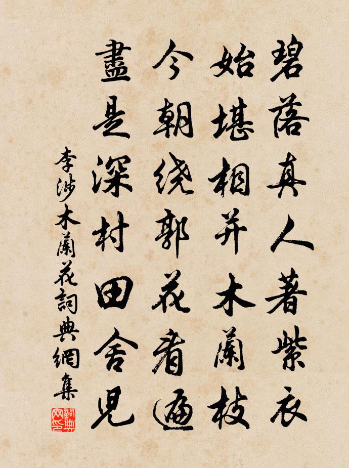 詩詞名句歷史字典書法欣賞書法字典國語詞典說文解字康熙字典古漢語字典標 題 作 者 詩 句 木蘭花作者:李涉 朝代:唐代木蘭花原文碧落真人著紫衣,始堪相併木蘭枝。今朝繞郭花看遍,儘是深村田舍兒。詩詞問答問:木蘭花的作者是誰?答:李涉問:木蘭花寫於哪個朝代?答:唐代問:木蘭花是什麼體裁?答:七絕李涉木蘭花書法欣賞木蘭花書法作品注釋全唐詩:卷477-25詩詞推薦九月十一日杓孫得男樓鑰〔宋代〕郡齋弧矢記垂門,今日衰翁更覺尊。生晚不能瞻大父,年高卻幸見曾孫。從今鏡鑷知無用,但喜芝蘭近愈繁。題汝夏日與綦毋居士、昱上人納涼皎然〔唐代〕為依爐峰住,境勝增道情。涼日暑不變,空門風自清。坐援香實近,轉愛綠蕪生。宗炳青霞士,如何知我名。登天宮閣白居易〔唐代〕午時乘興出,薄暮未能還。高上煙中閣,平看雪後山。委形群動里,任性一生間。洛下多閒客,其中我最閒。元質苦留過重陽且約泛舟觀泉二首李流謙〔宋代〕舟行十里遠,山出一泉清。為景尋幾遍,將詩賭欲贏。江清渾玩著,酒好易支撐。半世無功業,狂歌任性情。七里灘張伯玉〔宋代〕漱玉鳴珠七里灘,到今猶照客星寒。盧奴有水徒千頃。未得高賢一瞬看。李文饒一首劉克莊〔宋代〕畫取維州如槁葉,策禽潞將似嬰兒。九原精爽人猶畏,想見中書秉筆時。石溪和尚頂相柏堂請贊釋可湘〔宋代〕咄者老和尚,可煞慈悲相。清影落人間,香名透天上。彈瑕纇於八方,迪精明於萬象。石骨崚嶒,溪光蕩漾。一筆法界頌張嵲〔宋代〕自從仞得無邊界,宇宙方知狹陋生。時節短於羊胛熟,廣輪才似一牛鳴。滿宮花·雪霏霏魏承班〔五代〕雪霏霏,風凜凜,玉郎何處狂飲?醉時想得縱風流,羅帳香帷鴛寢。春朝秋夜思君甚,愁見繡屏孤枕。少年何事負滿江紅佚名〔宋代〕今古高情,都緣在林泉江曲。知此身如幻,寧羨錦衣華屋。雅志偏憐雕浦月,達人豈羨金山玉。喜滿庭、花影日篩楚天遙過清江引·有意送春歸佚名〔宋代〕有意送春歸,無計留春住。畢竟年年用著來,何似休歸去。目斷楚天遙,不見春歸路。風急桃花也似愁,點點飛紅再游殖軒小酌陳造〔宋代〕生世書岐喧靜,書平章有不書如。宦塗吾畫虎,濠上子知魚。去索長安米,歸紬笠澤書。茲軒住蒼莽,勝日復躊躇送蔣穎叔帥熙河二首秦觀〔宋代〕天馬蒲萄隔玉門,漢廷誰更勇如尊。行台曉日屯千騎,祖道春風屬一樽。莫許留犁輕結好,便令甌脫復遊魂。要須挽朱持郎程珌〔宋代〕卜宅從先壟,駕言練日良。飛蓋鶩玄駟,古柳被龍{巾荒}。按轡且徐驅,聽歌薤露章。憶昔未峰仙,浩劫思陶唐題彭紹墨唐士恥〔宋代〕彭紹之墨玄又玄,問誰得法托之仙。凌煙膠漆有三昧,魯直之什曹洞禪。我欲大振獅子吼,直恐驚翻龍象筵。紛紛紹興享先農十一首佚名〔宋代〕柔毛剛髦,或剝或烹。為俎孔碩,登薦厥誠。去夏邦衡胡侍郎生日嘗因茶詩致善頌其語果驗周必大〔宋代〕壽杯又是酌流霞,醉眼還醒講殿茶。舉世甿謠思舊德,隔年詩讖托新芽。漢帷果慶登三傑,胡幕何愁不一家。賜也贈米都知梁補闕〔唐代〕供奉三朝四十年,聖時流落髮衰殘。貪將樂府歌明代,不把清吟換好官。秦樓月/憶秦娥梁意娘〔宋代〕春宵短。香閨寂寞愁無限。愁無限。一聲窗外,曉鶯新囀。起來無語成嬌懶。柔腸易斷人難見。人難見。這些心緒南園觀梅陸游〔宋代〕幽徑疏籬洗世塵,眼明見此數枝新。橫斜恰受三更月,璀璨先回萬物春。洛浦淩波矜絕態,緱山騎鶴想前身。放翁名句推薦有才必韜藏,如渾金璞玉,暗然而日章也王永彬《圍爐夜話·第十四則》 強國戰兵,霸國戰智,王國戰義,帝國戰德,皇國戰無為。王通《中說·卷五·問易篇》 樓台處處迷芳草,風雨年年怨落花。曾棨《維揚懷古》 戎馬關山北,憑軒涕泗流。杜甫《登岳陽樓》 算翠屏應是,兩眉餘恨倚黃昏。孔夷《南浦·旅懷》 此夜曲中聞折柳,何人不起故園情。李白《春夜洛城聞笛 / 春夜洛陽城聞笛》 形在江海之上,心存魏闕之下劉勰《文心雕龍·神思》 天下有道則見,無道則隱。孔子弟子《論語·泰伯篇》 相顧無言,惟有淚千行。蘇軾《江城子·乙卯正月二十日夜記夢》 又疑瑤台鏡,飛在青雲端。李白《古朗月行》