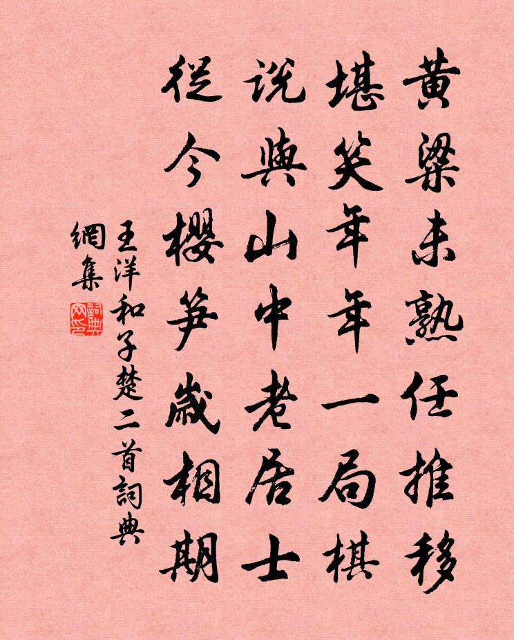 詩詞名句歷史字典書法欣賞書法字典國語詞典說文解字康熙字典古漢語字典標 題 作 者 詩 句 和子楚二首作者:王洋 朝代:宋代和子楚二首原文黃粱未熟任推移,堪笑年年一局棋。說與山中老居士,從今櫻筍歲相期。詩詞問答問:和子楚二首的作者是誰?答:王洋問:和子楚二首寫於哪個朝代?答:宋代王洋和子楚二首書法欣賞和子楚二首書法作品詩詞推薦即事趙蕃〔宋代〕秋日勝春句匪夸,信春無賴覺秋佳。睡余對客霏談屑,茶罷卷書揩眼花。寂歷斜陽檐影斷,蕭疏黃葉雀聲嘩。家貧寄小弟許渾〔唐代〕江城紅葉盡,旅思復淒傷。孤夢家山遠,獨眠秋夜長。道存空倚命,身賤未歸鄉。南望空垂淚,天邊雁一行。道服王禹偁〔宋代〕楮冠布褐皂紗巾,曾忝西垣寓直人。此際暫披因假日,如今長著見閒身。濯纓未識三湘水,漉酒空經六里春。不為答張學士西湖即席宋祁〔宋代〕勝地紆佳客,高秋會賞心。返霞延落照,餘岫補疏林。捉麈談方熟,持螯酒屢斟。無煩命絲竹,擿句是清音。朝中措(艮翁生日)劉克莊〔宋代〕仙風道骨北山翁。萬卷著胸中。渙若宦情冰釋,作□醉面桃紅。千林凍槁,一枝雪艷,訊息先通。顏色□青精飯,七月六日二首張耒〔宋代〕雨洗秋城碧玉天,暮雲吹盡月娟娟。寂寥誰是清宵伴,只有姮娥最可憐。句高似孫〔宋代〕豆蔻雨分霽,翠蟳雪炊香。西軒李新〔宋代〕夢中得鹿本無心,覺後人亡只見金。水出吐蕃分黑白,地窮全蜀隔幽陰。枯腸正伴空城雀,白首更為梁甫吟。急求菩薩蠻呂勝己〔宋代〕遙山幾疊天邊碧。故教遮斷天涯客。樓倚暮雲端。春風羅袖寒。與君千里別。共此關山月。皓月一般明。君心怎敢燕子徐集孫〔宋代〕呢喃不聽一年余,又見雙飛向竹廬。翻笑人間湖海客,重來仍占故巢居。暖谷詩蔣祺〔宋代〕縣南山水秀且清,天地坯冶陶精英。有唐刺史昔行縣,訪尋洞穴為寒亭。屈指於今幾百祀,磨崖字字何縱橫。相隨遣懷齊己〔唐代〕詩病相兼老病深,世醫徒更費千金。餘生豈必虛拋擲,未死何妨樂詠吟。流水不回休嘆息,白雲無跡莫追尋。閒身扇子詩李石〔宋代〕愛他國色艷傾城,老衲心城百萬兵。便使有情何足動,幻花況是本無情。鴛鴦祖無擇〔宋代〕水宿雲飛無定期,雄雌兩兩鎮相隨。到頭不會天何意,卻使人生有別離。夜寒覺有霜鄭剛中〔宋代〕不勝孤潔寒窗月,分外清圓遠守鍾。後圃便當收橘柚,無疑侵曉一相濃。題苑林北樓鄭隼〔宋代〕雨來風靜綠蕪鮮,憑看朱欄思浩然。人語獨耕燒後嶺,鳥飛斜沒望中煙。松梢半露藏雲寺,灘勢橫流出浦船。若遣游漢州西湖陸游〔宋代〕房公一跌叢眾毀,八年漢州為剌史。遶城鑿湖一百頃,島嶼曲折三四里。小庵靜院穿竹入,危榭飛樓壓城起。空濛寄茅山何道士陸龜蒙〔唐代〕終身持玉舄,丹訣未應傳。況是曾同宿,相違便隔年。問顏知更少,聽話想逾玄。古籙文垂露,新金汞絕煙。蜂供送呂昌朝知嘉州蘇軾〔宋代〕不羨三刀夢蜀都,聊將八詠繼東吳。臥看古佛凌雲閣,敕賜詩人明月湖。得句會應緣竹鶴,思歸寧復為蓴鱸。橫空寄江朝宗吳芾〔宋代〕相聚才經歲,分攜又許時。遣懷還有酒,排悶豈無詩。飲罷憑誰語,吟成只自知。願君憐此意,命駕莫遲遲。名句推薦歸來報名主,恢復舊神州。岳飛《送紫岩張先生北伐》 攀出牆朵朵花,折臨路枝枝柳。關漢卿《一枝花·不伏老》 大道廢,有仁義;智慧出,有大偽;六親不和,有孝慈;國家昏亂,有忠臣。老子《老子·道經·第十八章》 且樂生前一杯酒,何須身後千載名?李白《行路難三首》 十年一覺揚州夢,贏得青樓薄倖名。杜牧《遣懷》 海上千烽火,沙中百戰場。李頎《古塞下曲》 暗暗淡淡紫,融融冶冶黃。李商隱《菊花》 當軒對尊酒,四面芙蓉開。王維《臨湖亭》 女也不爽,士貳其行。士也罔極,二三其德。佚名《氓》 忽然一夜清香發,散作乾坤萬里春。王冕《白梅》
