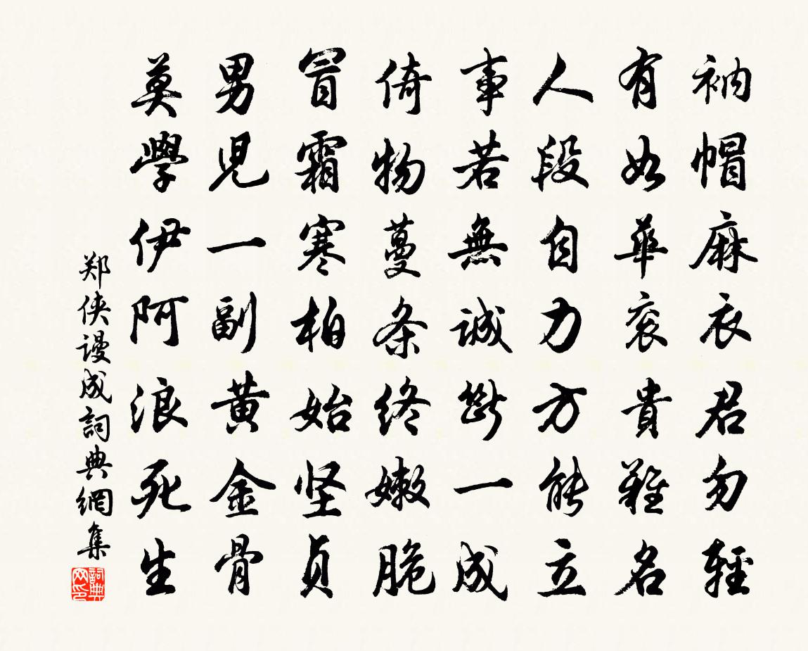 詩詞名句歷史字典書法欣賞書法字典國語詞典說文解字康熙字典古漢語字典標 題 作 者 詩 句 謾成作者:鄭俠 朝代:宋代謾成原文衲帽麻1/1衣君勿輕,有如華袞貴難名。人段自力方能立,事若無誠斷一成。倚物蔓條終嫩脆,冒霜寒柏始堅貞。男兒一副黃金骨,莫學伊阿浪死生。詩詞問答問:謾成的作者是誰?答:鄭俠問:謾成寫於哪個朝代?答:宋代鄭俠謾成書法欣賞謾成書法作品詩詞推薦水龍吟朱敦儒〔宋代〕曉來極目同雲,曖空降雪花零亂。平生塵想,老來俗狀,都齊驚散。玉鳳凌霄,素虬橫海,一杯相勸。任霓裳學舞送崔黃臣寺丞宰臨海梅堯臣〔宋代〕補官桐廬時,已飽嚴陵釣。進吏六百石,又得臨海嶠。因之論出處,足以見風調。洪潮可登觀,萬里漲川竅。收縮雁塔(開元八年,清河傅岩題此詩於雁塔)解彥融〔唐代〕崢嶸徹倒景,刻峭俯無地。勇進攀有緣,即嶮恐迷墜。窅然喪五蘊,蠢爾懷萬類。實際罔他尋,波羅必可致。南山洞仙歌·冰肌玉骨蘇軾〔宋代〕冰肌玉骨,自清涼無汗。水殿風來暗香滿。繡簾開,一點明月窺人,人未寢,倚枕釵橫鬢亂。起來攜素手,庭戶無二雙蓮錢聞詩〔宋代〕薰風吹蓮塘,灼灼萬朵芳。中有並蒂出,翠幄眠鴛鴦。二橋鬌雲鬟,新浴香汗涼。老夫奚致哉,乃郡豐年祥。放舟通津門外作賀鑄〔宋代〕國門欲去尚遲遲,況復淒風落照時。猶有京塵坌舟尾,惱人無幾庾元規。醉蓬萊(慶壽)趙鼎〔宋代〕破新正春到,五葉堯蓂,弄芳初秀。翦彩然膏,燦華筵如晝。家慶圖中,老萊堂上,竟祝翁遐壽。喜氣歡容,光生劉後溪和雁湖即事詩十絕見示次韻洪咨夔〔宋代〕去年灶婦飽而腴,今歲啼飢眼欲枯。麥飯熟時猶遠在,不多元氣急須扶。寄題太和胡氏福榮堂周必大〔宋代〕福備天教百順並,應須富貴又長生。九霄慶澤沾身潤,五色綸章照眼明。翁媼歲時稱壽禮,兒孫晝夜讀書聲。來春縣齋十詠惟勤閣寧參〔宋代〕自責思前古,徒名是永懷。善聲慚偃室,幽興類蕭齋。未報投虛刃,空防肆毒材。恪居知有地,{繩糹換亻}俛競少年游(玉臘梅枝)韓淲〔宋代〕閒尋杯酒,清翻曲語,相與送殘冬。天地推移,古今興替,斯道豈雷同。明窗玉蠟梅枝好,人情淡、物華濃。個樣送林上舍劉克莊〔宋代〕□傳紙貴洛陽城,疇昔推高月旦評。下筆□□□□□,舉幡亦足唱諸生。詩如東野無高論,策到□□□直聲。病叟歲暮寄蘭窗兄在郴陽鄧深〔宋代〕每日登樓望欲迷,家書寫罷復題詩。對床夜雨還非昨,啜茗春風未可期。歲月催人驚合沓,夢魂覓路古參差。也應人月圓·一枝仙桂香趙孟頫〔元代〕一枝仙桂香生玉,消得喚卿卿。緩歌金縷,輕敲象板,傾國傾城。幾時不見,紅裙翠袖,多少閒情。想應如舊,春因事示眾釋重顯〔宋代〕石本落落,玉自碌碌。古之今之,一何{上斯下言}速。師子不咬麒麟,猛虎不食伏肉。君不見洞庭孤島煙浪深,金谷園花發懷古佚名〔宋代〕春風生梓澤,遲景映花林。欲問當時事,因傷此日心。繁華人已歿,桃李意何深。澗咽歌聲在,雲歸蓋影沈。地形山院觀花施肩吾〔唐代〕初來唯見空樹枝,今朝滿院花如雪。門前為報諸少年,明日來遲不堪折。水調歌頭何大圭〔宋代〕今夕出佳月,銀漢瀉高寒。風纏雲卷,轉覺天陛玉樓寬。疑是金華仙子,又喜經年藥就,傾出玉團團。收拾江河影西江月吳儆〔宋代〕竹里全無暑氣,溪邊長有清風。荷花落日照酣紅。雨過遙山翠重。老作宮祠散漢,本來田舍村翁。腰纏三萬祿千鍾翔實顧渭濱歸里潘璵〔宋代〕十年學道客長安,鏈得丹成返故山。剩帶錦囊詩料去,肯嫌黃葉路程寒。梅邊月照人千里,竹下雲封屋兩間。此後名句推薦送子軍中飲,家書醉里題。岑參《磧西頭送李判官入京》 君子莫大乎與人為善。孟子《孟子·公孫丑章句上·第八節》 智足以拒諫,言足以飾非司馬遷《史記·汲鄭列傳》 江天一色無纖塵,皎皎空中孤月輪。張若虛《春江花月夜》 鄉村四月閒人少,才了蠶桑又插田。翁卷《鄉村四月》 花滿河陽,為君羞褪晨妝茜。吳文英《燭影搖紅·賦德清縣圃古紅梅》 爾來從軍天漢濱,南山曉雪玉嶙峋。陸游《金錯刀行》 春草細還生,春雛養漸成。揭傒斯《畫鴨》 幽蘭旋老,杜若還生,水鄉尚寄旅。吳文英《鶯啼序·春晚感懷》 是故去智而有明,去賢而有功。韓非及後人《韓非子·主道》
