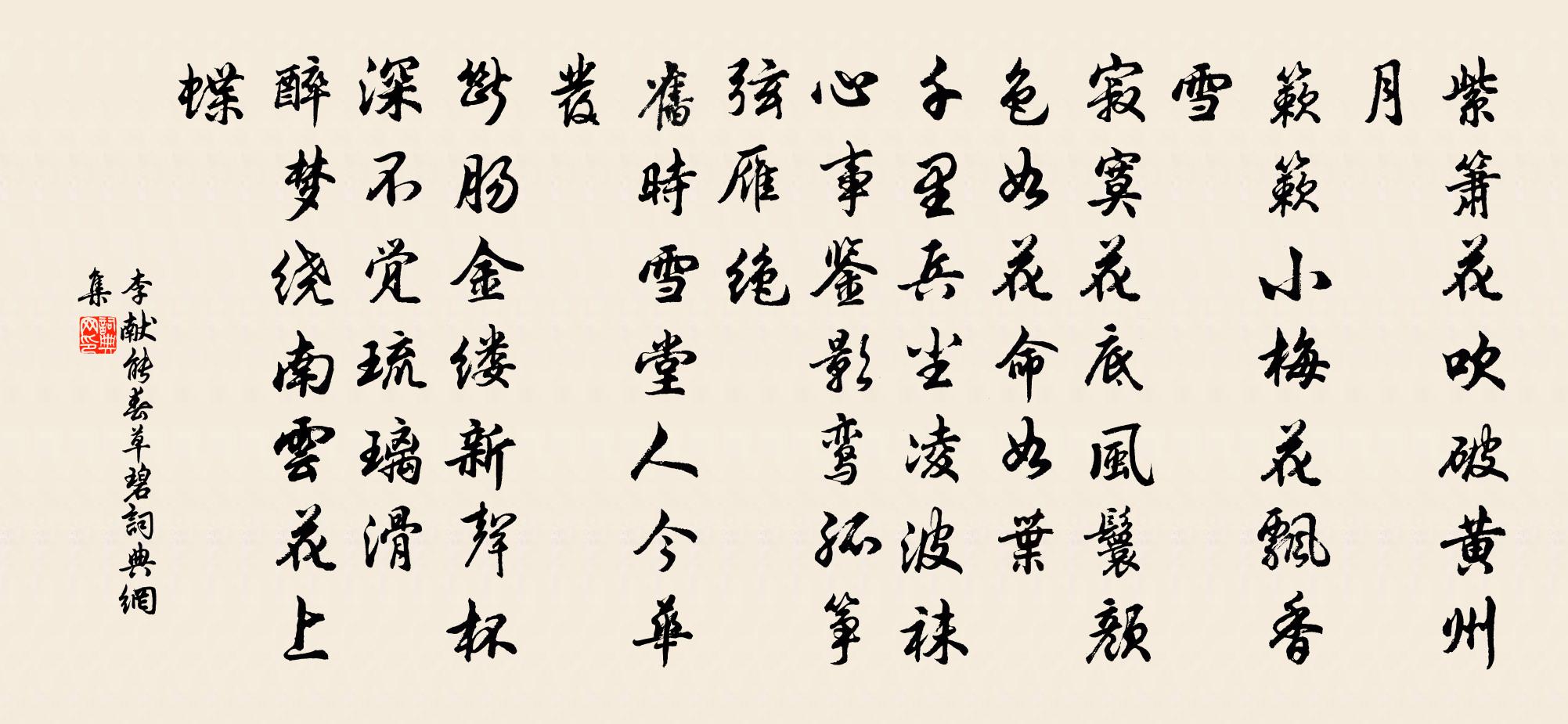 詩詞名句歷史字典書法欣賞書法字典國語詞典說文解字康熙字典古漢語字典標 題 作 者 詩 句 春草碧作者:李獻能 朝代:元代春草碧原文紫簫花吹破黃州月。簌簌小梅花,飄香雪。寂寞花底風鬟,顏色如花、命如葉。千里В兵塵、凌波襪。心事鑒影鸞孤,箏弦雁絕。舊時雪堂人,今華發。斷腸金縷新聲,杯深不覺琉璃滑。醉夢繞南雲,花上蝶。詩詞問答問:春草碧的作者是誰?答:李獻能問:春草碧寫於哪個朝代?答:元代問:春草碧是什麼體裁?答:詞李獻能春草碧書法欣賞春草碧書法作品詩詞推薦《綺疏遺恨》之燈擎唐寅〔明代〕三尺銀擎隔帳燃,歡愉未了散姻緣;願教化作光明藏,照徹黃泉不曉天。 郊廟歌辭。享太廟樂章。永和三章張說〔唐代〕肅九室,諧八音。歌皇慕,動神心。禮宿設,樂妙尋。聲明備,祼奠臨。律迓氣,音入玄。依玉幾,御黼筵。聆愾漁家傲(丁卯生日自作)郭應祥〔宋代〕去歲簿書叢里過。生朝也有人來賀。隨分侑尊呼幾個。胡廝和。愁顏鎮日何曾破。素髮如今添老大。歸來方是閒當鹽城阻冰雪贈陳德美三首陳造〔宋代〕斷港冰初合,窮塗歲欲除。臨年仍此悔,議道得無疎。撫事空搔首,何人為寄書。海風吹浩蕩,側望正愁予。寄題丹丘梵才上人山居釋遵式〔宋代〕禪家真隱處,翠谷倚城隍。海近雲歸早,山孤鳥雲長。石當泉脈潤,風度柏枝香。此地容吾否,中霄去意狂。春日二首曾幾〔宋代〕期頤三萬日,政爾亦無多。佳節已如許,衰年將若何。雨風增落寞,戚友斷經過。問訊庖廚內,猶堪一洗磨。晚步西園孔武仲〔宋代〕今日曷不樂,吾園來頗疏。向晚門庭空,杖策到城隅。林噪其飛禽,池躍其游魚。似怪我來遲,晨朝何往乎。寂默喜劉伯宣尚書至五首方回〔宋代〕聞說尚書至,歡聲沸道傍。饑民應復飽,暑氣頓成涼。此老今能幾,吾徒尚有望。略容對談麈,小緩理歸航。書齋俞桂〔宋代〕野草沿庭砌,清閒日掩扉。晚涼疎雨過,落葉覺蟬稀。天籟自鳴竹,砧聲誰搗衣。僧寮不過此,何必扣玄機。薄游仇遠〔宋代〕未草閒居賦,聊從薄宦遊。江湖明老眼,風雨暗孤舟。客況何曾好,吾生本自浮。終然愧農圃,將有事西疇。句釋曉瑩〔宋代〕江上閒吟立又行。憑李忠州寄書樂天元稹〔唐代〕萬里寄書將出峽,卻憑巫峽寄江州。傷心最是江頭月,莫把書將上庾樓。安平樂慢劉弇〔宋代〕細想勞生,等閒聚散,冉冉輕似秋煙。蓮心暗苦,月意難圓。神京去路三千。當日風流,有妖饒枕上,軟媚尊前。閒書二首方回〔宋代〕年年心事樂陶陶,氣不低垂亦不豪。酒飲八分何必滿,棋贏一子便為高。修行到此元非易,把捉從今更要牢。縉笏早春田行梅堯臣〔宋代〕風雪雙羊路,梅花溪上村。鳥呼知木暖,雲濕覺山昏。婦子來陂下,囊壺置樹根。予非陶靖節,老去愛田園。憶故園顧況〔唐代〕惆悵多山人復稀,杜鵑啼處淚沾衣。故園此去千餘里,春夢猶能夜夜歸。題蜀江觀姚勉〔宋代〕孝祖淳熙極盛時,此泉曾發蜀江湄。繡衣酷吏雖湮塞,難掩公朝賜石碑。自詠絕句陸游〔宋代〕逆旅門前撥不開,先生醉策蹇驢來。未言乞得囊中藥,一見童顏且壓災。偈頌一百四十一首釋師範〔宋代〕千討萬討討不見,都不要討卻成現。十字街頭逢阿爺,眉毛蓋眼鬍鬚面。悼內十一首于謙〔明代〕垂老光陰兩鬢皤,細君棄我竟如何!夫妻一旦世緣盡,兒女百年恩愛多。小閣空懸台上鏡,春衣誰試篋中羅。客邊名句推薦君子之德風,小人之德草,草上之風必偃。孔子弟子《論語·顏淵篇》 舍心腹而順手足羅貫中《三國演義·第二十三回》 耐寒唯有東籬菊,金粟初開曉更清。白居易《詠菊》 歲暮百草零,疾風高岡裂。杜甫《自京赴奉先縣詠懷五百字 / 自京赴奉先詠懷五百字》 草螢有耀終非火,荷露雖團豈是珠。白居易《放言五首·其一》 新樣靚妝,艷溢香融,羞殺蕊珠宮女。趙佶《燕山亭·北行見杏花》 起望衣冠神州路,白日銷殘戰骨。辛棄疾《賀新郎·用前韻送杜叔高》 楊柳乍如絲,故園春盡時。納蘭性德《菩薩蠻·問君何事輕離別》 吏呼一何怒,婦啼一何苦。杜甫《石壕吏》 無邊落木蕭蕭下,不盡長江滾滾來。杜甫《登高》