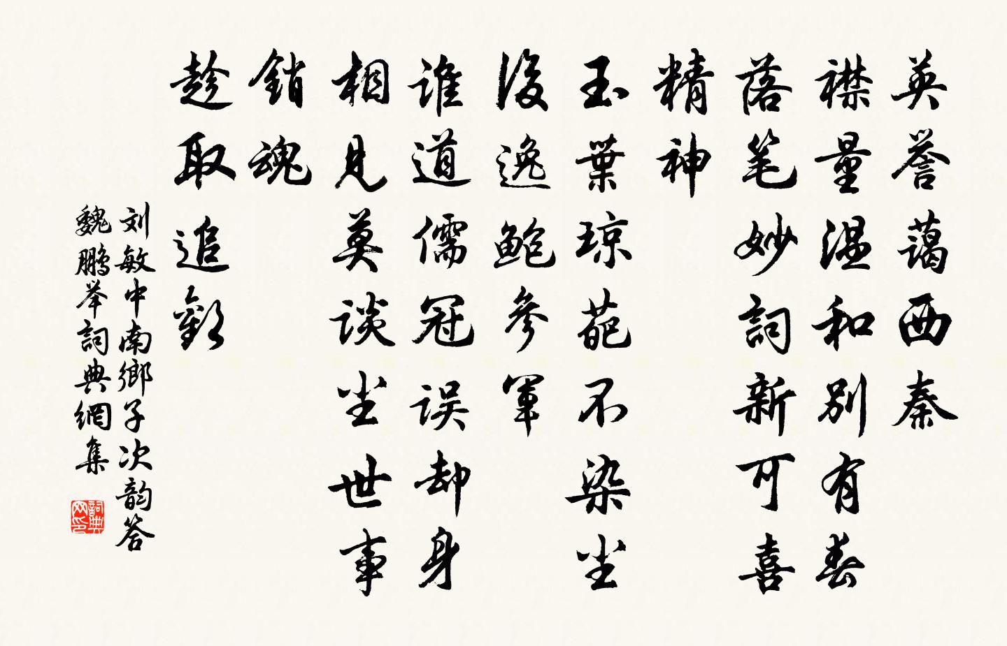 詩詞名句歷史字典書法欣賞書法字典國語詞典說文解字康熙字典古漢語字典標 題 作 者 詩 句 南鄉子 次韻答魏鵬舉作者:劉敏中 朝代:元代南鄉子 次韻答魏鵬舉原文英譽藹西秦。襟量溫和別有春。落筆妙詞新可喜,精神。玉葉瓊葩不染塵。後逸鮑參軍。誰道儒冠誤卻身。相見莫談塵世事,銷魂。趁取追歡詩詞問答問:南鄉子 次韻答魏鵬舉的作者是誰?答:劉敏中問:南鄉子 次韻答魏鵬舉寫於哪個朝代?答:元代問:南鄉子 次韻答魏鵬舉是什麼體裁?答:詞劉敏中南鄉子 次韻答魏鵬舉書法欣賞南鄉子 次韻答魏鵬舉書法作品詩詞推薦黃筌畫金盆鴿孟蜀屏風者也一首蘇籀〔宋代〕孟氏觀闕嘗鮮新,虯虯栱桷翔青冥。可憐當年百事足,鬼眼未遽窺高明。鋪首倉琅百樓聳,寶簾珠帶關銀屏。風台過徐城王安石〔宋代〕七年五過徐城縣,自笑皇皇此世間。安得身如倉庾氏,一 * 到子孫閒。倉部弟和前韻再得五首劉克莊〔宋代〕秧馬催予出,銅魚羨子分。無蓮照學士,有竹比封君。望蓬萊 詠餺飥王哲〔元代〕食店好,餺飥最奇瑰。玉屑無窮摶作塊,瓊瑤一片細勻開。須使寶刀裁。呈妙手,用意穩安排。碗內梨花新貼樣,醜奴兒/採桑子王灼〔宋代〕東風已有歸來信,先返梅魂。雪斗紛紛。更引蟾光過璧門。綠衣小鳳枝頭語,我有嘉賓。急泛清尊。莫待江南爛漫和孟東野韻范偃〔宋代〕散策欲薄暮,疏鍾猶殷床。風煙函古趣,岩壑生幽香。仰首逼象緯,俯視渺川光。向來非突兀,幾成虎豹場。簡許遠元寮林表民〔宋代〕問雲從何來,明月翳光景。須臾忽破散,依舊寒炯炯。問月何能照,月亦不自領。雲來非我過,雲去非我幸。無心踏莎行佚名〔宋代〕一領布袍,一床紙被。葫蘆拄杖為行李。三杯兩盞樂天真,誰能與你爭閒氣。滿眼蒼生,爭名奪利。朝朝只要巴家郴江百詠並序宣風道上阮閱〔宋代〕馬蹄西去夕陽催,濃淡寒山翠作堆。北雁無情怕秋熱,帶將寒信過江來。西江月(十二之十一)張伯端〔宋代〕德行修逾八百,陰功積滿三千。均齊物我與親冤。始合神仙本願。虎兕刀兵不害,無常火宅難牽。寶符降後去朝天梧葉兒佚名〔元代〕青銅鏡,不敢磨,磨著後照人多。一尺水,一尺波,信人唆,那一個心腸似我。和岩壑兄九日蘇泂〔宋代〕華顛可笑插茱萸,兒女歡然競挽須。故國黃花元自好,荒台青草孰為娛。舉觴感慨悲歌有,落帽風流蘊藉無。粘起度秋李世民〔唐代〕夏律昨留灰,秋箭今移晷。峨嵋岫初出,洞庭波漸起。桂白髮幽岩,菊黃開灞涘。運流方可嘆,含毫屬微理。挽陳漢英杜范〔宋代〕庠塾崇師道,鄉閭重典刑。麟經開晚學,鶚表動天庭。頭未終朝黑,補能幾日青。文章難得力,愁絕峴山塋。次韻陶監丞茂安見贈王之道〔宋代〕三年重見須川湄,舍舟東去何驅馳。王事靡鹽莫遑息,人生所貴心相知。經從往返兩過我,一言意厚何多為。向來護國寺次韻婺州韻韓元吉〔宋代〕雙蛾渺雲端,流水但空谷。尚喜雲外山,娟娟作眉綠。佳人不可見,夜半風滿竹。竹聲入清夢,夜客慰孤宿。山中朝歸生日女洸有詩因次韻陳著〔宋代〕老爺不記汝生辰,一見杯盤便是春。兄姊味言兒記取,同胞皆是讀書身。雨夜許氏第會宿各賦四韻寇準〔宋代〕雨夜銷煩暑,林塘向夕幽。庭虛惟久月,樹冷欲生秋。河北嗟新別,樽前念舊遊。若非逢勝會,何以解離憂。簡徐季益趙蕃〔宋代〕不到西湖又五年,況當風雪探梅天。出門有愧登山屨,尋友空回訪戴船。翠樓范成大〔宋代〕在秦樓之北,樓上下皆飲酒者。連衽成帷迓漢官,翠樓沽酒滿城歡。白頭翁媼相扶拜,垂老從今幾度看。名句推薦洛陽城裡見秋風,欲作家書意萬重。張籍《秋思》 無論作何等人,總不可有勢利氣王永彬《圍爐夜話·第三五則》 清夜何湛湛,孤燭映蘭幕。江淹《銅爵妓》 山桃紅花滿上頭,蜀江春水拍山流。劉禹錫《竹枝詞·山桃紅花滿上頭》 明足以察秋毫之末,而不見輿薪,則王許之乎?孟子《孟子·梁惠王章句上·第八節》 去年米貴闕軍食,今年米賤大傷農。杜甫《歲晏行》 來相召、香車寶馬,謝他酒朋詩侶。李清照《永遇樂·落日熔金》 鄉心新歲切,天畔獨潸然。劉長卿《新年作》 月去疏簾才數尺,烏鵲驚飛,一片傷心白。宋琬《蝶戀花·旅月懷人》 最是多情汴堤柳,春來依舊帶棲鴉!曾棨《維揚懷古》