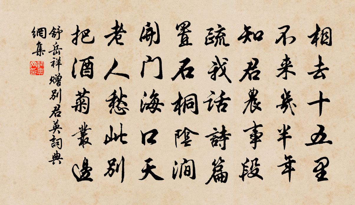 詩詞名句歷史字典書法欣賞書法字典國語詞典說文解字康熙字典古漢語字典標 題 作 者 詩 句 贈別君英作者:舒岳祥 朝代:宋代贈別君英原文相去十五里,不來幾半年。知君農事段,疏我話詩篇。置石桐陰澗,開門海口天。老人愁此別,把酒菊叢邊。詩詞問答問:贈別君英的作者是誰?答:舒岳祥問:贈別君英寫於哪個朝代?答:宋代舒岳祥贈別君英書法欣賞贈別君英書法作品詩詞推薦行路難馮著〔唐代〕男兒坎軻徒搔首,入市脫衣且沽酒。行路難,權門慎勿乾,平人爭路相摧殘。春秋四氣更回換,人事何須再三嘆。新堂夜坐月色皎然由連理亭信步庭中徘徊久之鮮于侁〔宋代〕秋風動微涼,天雨新霽後。閒齋獨隱几,明日在高柳。振衣步庭下,顥氣入襟袖。天空雲漢明,隱約辨列宿。蒼蒼玉樓春劉辰翁〔宋代〕霜風不動晴明好。探梅有約城東道。橋邊失卻老仙期,城門落日人歸早。野田一望迷芳草。除是騰空君後到。立馬秋懷二首汪炎昶〔宋代〕劇暑逢添閨,微涼忽值秋。年爭飛鳥疾,雲共此生浮。多難仍懷古,他鄉獨倚樓。可能天下廩,政有一身尤。思故人邵雍〔宋代〕芳酒一樽雖甚滿,故人千里奈思何。柳挼池閣條偏細,花近檐楹香更多。和江民表韻陳瓘〔宋代〕傳老東山水上浮,辮沙六月雪重裘。舊業訊息今何在,千里桐江月滿樓。李參政生日魏了翁〔宋代〕八十蹁躚老阿兄,一窗風雨伴雙清。武昌近日音書少,時聽湖邊過雁聲。神龍後烏鵲窠謠佚名〔唐代〕山南烏鵲窠,山北金駱駝。鐮柯不鑿孔,斧子不施柯。句劉若沖〔宋代〕閩川景物清宜畫,蕭寺樓台麗欲浮。次韻集津兄會群從王敦素宿王立之園明日西征晃沖之〔宋代〕秋高訪幽居,風急桑未落。天寒雞犬靜,地僻門巷闊。主人避世賢,自說久棲泊。呼兒出樽罍,梨栗亦不惡。賓客送韋岫郎中典泗州(一作癸丑歲毗陵會中貽同老)章碣〔唐代〕玉皇恩詔別星班,去壓徐方分野間。有鳥盡巢垂汴柳,無樓不到隔淮山。旌旗漸向行時擁,案牘應從到日閒。想憶閨怨曹勛〔宋代〕頭上百寶釵,終身不相失。唯有鴛鴦席,承歡難可畢。蓮花石延年〔宋代〕含情默默向層漪,語語幽懷定未知。洛浦微波長映步,漢宮香水不濡肌。心通幾點韜光藕,腸結千古托亂絲。暮春寄李審言龍圖邵雍〔宋代〕年年長是怕春深,每到春深病不任。傷酒情懷因小會,養花天氣為輕陰。歲華易革向來事,節物難回老去心。唯有送王紫微北使梅堯臣〔宋代〕天子命儒臣,遐方重專對。持書下西閣,擁節來窮塞。貂服紫蒙茸,虎旗光彩綷。將迎走氈騎,衛從羅金鎧。當宣拜敕口號陸游〔宋代〕黃紙如鴉字,今朝下九天。身居鏡湖曲,銜帶武夷仙。日絕絲毫事,年請百萬錢。恭惟優老政,千古照青編。次韻元日黃庭堅〔宋代〕會朝四海登圖籍,絳闕清都想盛容。春色已知回寸草,霜威從此霽寒松。飲如嚼蠟初忘味,事與浮雲去絕蹤。四十白雲王安石〔宋代〕英英白雲浮在天,下無根蒂旁無連。西風來吹欲消散,落日起望心悠然。願回羲和借光景,常使秀色當檐邊。時來江城子(春恨)魏夫人〔宋代〕別郎容易見郎難。幾何般。懶臨鸞。憔悴容儀,陡覺縷衣寬。門外紅梅將謝也,誰信道、不曾看。曉妝樓上望長安盧姬篇崔顥〔唐代〕盧姬少小魏王家,綠鬢紅唇桃李花。魏王綺樓十二重,水晶簾箔繡芙蓉。白玉欄桿金作柱,樓上朝朝學歌舞。前堂名句推薦時來天地皆同力,運去英雄不自由。羅隱《籌筆驛》 先生醉也,童子扶者。曹德《三棒鼓聲頻·題淵明醉歸圖》 還與去年人,共藉西湖草。蘇軾《卜運算元·感舊》 鐵衣霜露重,戰馬歲年深。戎昱《塞下曲·其六》 山頭堆白雪,風裡卷黃沙。楊守禮《三月巡邊曉發夏城》 貧賤非辱,貧賤而諂求於人者為辱;富貴非榮,富貴而利濟於世者為榮。王永彬《圍爐夜話·第三一則》 庭中有奇樹,綠葉發華滋。佚名《庭中有奇樹》 有過則改之,未萌則戒之馮夢龍《警世通言·卷三十八》 大樹無枝向北風,十年遺恨泣英雄。高啟《吊岳王墓》 過目成誦,出口成章。馮夢龍《警世通言·卷三》
