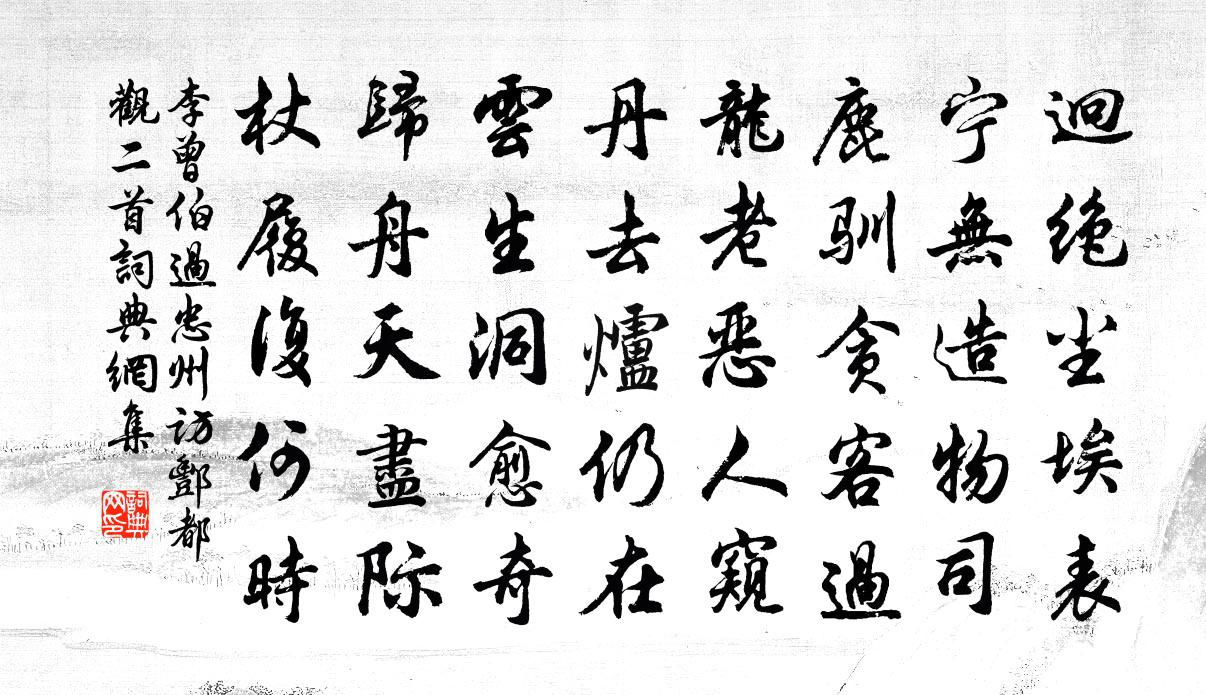 詩詞名句歷史字典書法欣賞書法字典國語詞典說文解字康熙字典古漢語字典標 題 作 者 詩 句 過忠州訪酆都觀二首作者:李曾伯 朝代:宋代過忠州訪酆都觀二首原文迥絕塵埃表,寧無造物司。鹿馴貪客過,龍老惡人窺。丹去爐仍在,雲生洞愈奇。歸舟天盡際,杖履復何時。詩詞問答問:過忠州訪酆都觀二首的作者是誰?答:李曾伯問:過忠州訪酆都觀二首寫於哪個朝代?答:宋代李曾伯過忠州訪酆都觀二首書法欣賞過忠州訪酆都觀二首書法作品詩詞推薦虞萬州生日魏了翁〔宋代〕玉湖面面碧迴環,六月寒飈撼屋山。跨鶴不隨刀夢去,臥龍甘與壁梭閒。漁樵是處便爭席,利慾年來早閉關。拂拭和吳沖卿江鄰幾二學士王景彝舍人秋興梅堯臣〔宋代〕我謂蓬瀛客,清切不畏炎。及觀秋興篇,無遠此窮間。乃知天地大,節候無憂嫌。寒不為富減,暑不為貧添。向者發鬆門寄介甫曾鞏〔宋代〕南風夜發吹孤舟,起視北極星辰稠。曉開徵帆破長浪,挾以兩櫓當中流。松門東面見廬阜,其上少日煙氣浮。舟人黃州左公歌佚名〔唐代〕我欲逃鄉里,我欲去墳墓。左公今既來,誰忍棄之去。病中即事十五首趙蕃〔宋代〕精廬名負郭,古路別通村。落葉多新積,蒼苔半宿根。杖藜溪見影,步屐雨流痕。更羨兒童輩,騎牛不駕轅。王希武通判輓詞范成大〔宋代〕事契從先世,姻聯亦近親。遽為重壤去,淒斷十年鄰。物理真飄忽,家聲正隱轔。門闌可三戟,何止駟車雲。宮詞一百首岳珂〔宋代〕神霄九府絢雲霞,寶錄仙衣御絳紗。擲火流鈴傳帝蹕,蕊珠殿里降菁華。絕句張耒〔宋代〕伏暑新除風露清,五更山舍一雞鳴。幽人枕上朦朧睡,臥看東岡次第明。水調歌頭蔡戡〔宋代〕擁節出閩嶠,易鎮上岷山。東西嶮岨,分陝初不在榮觀。痛念兩河未復,獨作中流砥柱,屹若障狂瀾。極目神京遠清平樂辛棄疾〔宋代〕靈皇醮罷。福祿都來也。試引鵷雛花樹下。斷了驚驚怕怕。從今日日聰明。更宜潭妹嵩兄。看取辛家鐵柱,無災無卜運算元·黃州定慧院寓居作蘇軾〔宋代〕缺月掛疏桐,漏斷人初靜。時見幽人獨往來,縹緲孤鴻影。驚起卻回頭,有恨無人省。揀盡寒枝不肯棲,寂寞沙洲望梅花佚名〔宋代〕百歲韶華如電。空回首、又來一遍。販骨輪迴,千生萬死,只管改頭換面。要得免、捉住清風,把虛空、打破一片書興四首汪炎昶〔宋代〕興逼不暇臥,躡屐鳴難先。裛袂碧氛潤,襲襟爽概繁。噫餒出故氣,咽甘漱新泉。骨瘦易酸楚,骨虛覺輕便。樵子向察推檄至會昌賦所懷呈似二首曾豐〔宋代〕惟此溪山惡,其它州縣無。豈期公骯贓,而為我馳驅。錢穀豈餘事,音容非故吾。史君如問細,為道費枝梧。參雲亭納涼小集二首蘇籀〔宋代〕踽踽迂疏彼一鰥,息交絕學殆頑顏。時儕儻獲多謀助,少作曾希長者刪。餵犬孱尪玩逋竊,轅駒牽跼曠尤瘝。那無次韻王編修二首陳造〔宋代〕老誓捐書斷苦吟,君苗筆硯戴逵琴。因君又試推敲手,揆我終慚繳繹音。漫作蠹魚餐朽策,倏聽鵯鵊語中林。肉台成都信藏主求送行釋寶曇〔宋代〕又得南方一信歸,君臣父子卻饒伊。五年乳竇峰前路,曾把虛空碎一槌。阻水寄友黎廷瑞〔宋代〕綿綿風雨暗西窗,悶擁殘編對夜釭。稚子何知泥污土,良朋共嘆陸成江。負山鰲重應將壓,戰野龍驕未易降。此去見張明府釋紹嵩〔宋代〕聲采當年陸士龍,為官古雅少人同。柱天勳業須君了,更用文篇續國風。璧池望秋月張子容〔唐代〕涼夜窺清沼,池空水月秋。滿輪沉玉鏡,半魄落銀鉤。蟾影搖輕浪,菱花渡淺流。漏移光漸潔,雲斂色偏浮。似璧名句推薦紛紛世事無窮盡,天數茫茫不可逃。羅貫中《三國演義·第一百二十回》 顧謂戚夫人,彼翁羽翼成。李白《山人勸酒》 親履艱難者知下情,備經險易者達物偽。范曄《後漢書·列傳·張衡列傳》 散關三尺雪,回夢舊鴛機。李商隱《悼傷後赴東蜀辟至散關遇雪》 昨夜江邊春水生,艨艟巨艦一毛輕。朱熹《活水亭觀書有感二首·其二》 黃鶴樓前日欲低,漢陽城樹亂烏啼李夢陽《夏口夜泊別友人》 罪至重而刑至輕,庸人不知惡矣,亂莫大焉。荀子《荀子·正論》 梨花院落溶溶月,柳絮池塘淡淡風。晏殊《無題·油壁香車不再逢》 浮雲不系名居易,造化無為字樂天李忱《吊白居易》 蜀國曾聞子規鳥,宣城還見杜鵑花。李白《宣城見杜鵑花 / 子規》