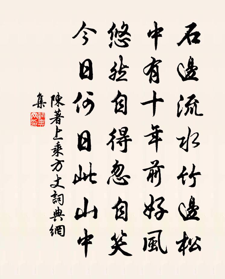 詩詞名句歷史字典書法欣賞書法字典國語詞典說文解字康熙字典古漢語字典標 題 作 者 詩 句 上乘方丈作者:陳著 朝代:宋代上乘方丈原文石邊流水竹邊松,中有十年前好風。悠然自得忽自笑,今日何日此山中。詩詞問答問:上乘方丈的作者是誰?答:陳著問:上乘方丈寫於哪個朝代?答:宋代陳著上乘方丈書法欣賞上乘方丈書法作品詩詞推薦紫溪莊舍讀癸丑壁間舊題轉眼忽十八年同游十劉學箕〔宋代〕團團庭柯,清美無度。今我來斯,忽然老樹。偃蹇輪囷,剝蝕摧蠹。朱顏舜華,詎得如故。會昌小峴亭有碑侍郎陸公作也今通守蓋公之孫曾豐〔宋代〕小峴豐碑大陸書,摩挲蠆尾掃龜趺。機雲宗派公家是,晉宋文章此外無。方被春牽時夢草,豈為秋動輒思鱸。行藏上鄧憲生辰楊簡〔宋代〕使者維何,有祖高密。雲台第一,流芳泌泌。蝶林逋〔宋代〕細眉雙聳敵秋毫,冉冉芳園日幾遭。清宿露花應自得,暖爭風絮欲相高。情人歿後魂猶在,傲吏齊來夢亦榮。閒掩禪人並化主寫真求贊釋正覺〔宋代〕識浪瀝乾,肚皮束寬。口翻瀾而海闊,發垂雪而山寒。妙傳家法髑髏眼,巧幻神通赤肉團。相隨來也,搥鑿無瘢。春晚風雨中作陸游〔宋代〕箕踞藜床岸幅巾,何妨病酒住湖濱。駕風浪作連三日,掃地花空又一春。樂事清宵當秉燭,畏途平地有摧輪。頹然與謝三學士唱和八首昨日偶陪後騎同適近郊歐陽修〔宋代〕堤柳才黃已落梅,尋芳弭蓋共徘徊。桑城日暖蠶催俗,麥壠風和雉應媒。別浦人嬉遺翠羽,弋林春廢鎖歌台。歸鞍送杜元穎元稹〔唐代〕江上五年同送客,與君長羨北歸人。今朝又送君先去,千里洛陽城裡塵。采采歌胡仲弓〔宋代〕朝采畹中蘭,暮采籬下菊。采采復采采,終日不盈掬。為憐芳潔姿,忍受紅塵觸。采蘭殺風味,採菊盈芬馥。落英夏日小集池上韻明甫之作李彌遜〔宋代〕生怕微雲點太清,籜龍莫作斷腸聲。餘霞到晚銖衣薄,滿月當空玉斧成。已結松筠為老伴,不緣蛙黽喚愁生。但令題棲霞寺綦毋潛〔唐代〕南山勢回合,靈境依此住。殿轉雲崖陰,僧探石泉度。龍蛇爭翕習,神鬼皆密護。萬壑奔道場,群峰向雙樹。天花八月七日被命上會稽沿途所歷拙於省記為韻語魏了翁〔宋代〕微之曾謫會稽居,州宅詩聯畫不如。繞閣煙嵐新雨後,滿山樓閣上燈初。元老見過因育新詩吳則禮〔宋代〕西風動湖海,木落蓬戶幽。稍回長者車,聊以消吾憂。脫巾喔新詩,爽氣凌高秋。蕭然漂轉余,文字慵雕鎪。老驥聖號雅二篇趙湘〔唐代〕皇振厥猷,法天以寧。我法我度,我經我營。或風或雨,或雷或霆。日月昭然,奮皇之明。霜肅以平,露澤以清。醜奴兒/採桑子吳禮之〔宋代〕金風顫葉,那更餞別江樓。聽淒切、陽關聲斷,楚館雲收。去也難留。萬重煙水一扁舟。錦屏羅幌,多應換得,蓼送張安國赴天彭司錄郭印〔宋代〕騏驥服鹽車,垂頭困長道。蒼鷹在韝縶,側耳思秋草。憶昔初見公,袞袞一傾倒。平生仰止意,相逢恨不早。清輝點視馬驛因成兩絕張鎡〔宋代〕萬里關山過險巘,風廊聊此憩權奇。天開徑上從茲始,想見長鳴振鬣時。再次前韻六首張嵲〔宋代〕曩日不緣逃暑空,今朝端為採春來。梅花落去香逾烈,去去還應首重回。贈殷山人張籍〔唐代〕鬱郁山中客,知名四十年。恓惶身獨隱,寂寞性應便。世業公侯籍,生涯黍稷田。藤懸讀書帳,竹系網魚船。已種和趙青田燕坐洪咨夔〔宋代〕青田鶴翁杜德機,天根月窟手探之。嬰兒奼女熟搏弄,妙處不許旁人知。渠家庭院紛花葯,啄木黃鸝幾推卻。流蘇名句推薦東風楊柳欲青青。煙淡雨初晴。晏殊《訴衷情·東風楊柳欲青青》 木蘭舟上,何處吳娃越艷:藕花紅照臉。孫光憲《河傳·風颭》 飛龍御天,故資雲雨之勢;帝王興運,必俟股肱之力。房玄齡《晉書·列傳·第三十五章》 和羞走,倚門回首,卻把青梅嗅。李清照《點絳唇·蹴罷鞦韆》 路入南中,桄榔葉暗蓼花紅。歐陽炯《南鄉子·路入南中》 天秋木葉下,月冷莎雞悲。李白《秋思》 寂寞離亭掩,江山此夜寒。王勃《江亭夜月送別二首》 但知江湖者,都是薄命人。佚名《增廣賢文·下集》 落地為兄弟,何必骨肉親!陶淵明《雜詩》 書中自有黃金屋,書中自有顏如玉趙恆《勸學詩》