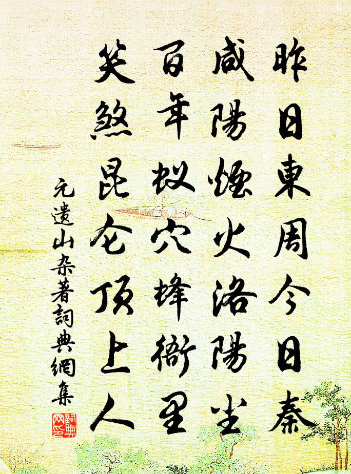 詩詞名句歷史字典書法欣賞書法字典國語詞典說文解字康熙字典古漢語字典標 題 作 者 詩 句 雜著作者:元遺山 朝代:元代雜著原文昨日東周今日秦,鹹陽煙火洛陽塵;百年蟻穴蜂衙里,笑煞崑崙頂上人。詩詞問答問:雜著的作者是誰?答:元遺山問:雜著寫於哪個朝代?答:元代問:雜著是什麼體裁?答:七絕元遺山雜著書法欣賞雜著書法作品詩詞推薦眼兒媚·平沙芳草渡頭洪咨夔〔宋代〕平沙芳草渡頭村。綠遍去年痕。遊絲下上,流鶯來往,無限銷魂。綺窗深靜人歸晚,金鴨水沈溫。海棠影下,子規寄林寬黃滔〔唐代〕相知四十年,故國與長安。俱喜今辰在,休論往歲難。海鳴秋日黑,山直夏風寒。終始前儒道,升沈盡一般。紹興祀祚德廟八首佚名〔宋代〕於皇時宋,永祚有基。始翳覆護,扶而立之。敢忘昭答,牲分酒釃。靈其燕鄉,益相本支。過陝州贈蘇儀掾仲滋晁說之〔宋代〕河擁秋聲客恨新,誰能出語共輪囷。信知五采生丹穴,不許文章屬外人。柏學士茅屋杜甫〔唐代〕碧山學士焚銀魚,白馬卻走身岩居。古人已用三冬足,年少今開萬卷餘。晴雲滿戶團傾蓋,秋水浮階溜決渠。富貴送人游邵州狄煥〔唐代〕春江正渺渺,送別兩依依。煙里棹將遠,渡頭人未歸。漁家侵疊浪,島樹掛殘暉。況入湖湘路,那堪花亂飛。偈頌三十八首釋如淨〔宋代〕涅槃堂里死功夫,風袞葫蘆水上浮。恁麽點開參學眼,釋迦彌勒是他奴。長門怨劉皋〔唐代〕營營孤思通,寂寂長門夜。妾妒亦知非,君恩那不借。攜琴就玉階,調悲聲未諧。將心寄明月,流影入君懷。仲春吳濤〔宋代〕雨余寒氣淺,園林作春媚。不知海棠花,新來著花未。勸漢老弟飲酒虞儔〔宋代〕尊前一醉莫辭頻,三萬場當歲十旬。況有好詩能泣鬼,寧無妙畫可通神。快呼左手持螯客,莫著傾身障鹿人。綠漲小重山薛昭蘊〔唐代〕春到長門春草青,玉階華露滴、月朧明。東風吹斷紫簫聲,宮漏促、簾外曉啼鶯。愁極夢難成,紅妝流宿淚、不勝贈趙舍人趙善括〔宋代〕季父英名上玉津,瞿曇抱送石麒麟。龍文寶冊傳青瑣,鳳閣鸞坡近紫宸。親老侍行知有子,才高見忌豈無人。洪崖去年十一月十二日致宏如秦州仆餞之餘口復到張嵲〔宋代〕憶昔遊河梁,對床三夜語。平生慷慨心,遠別顏亦苦。朔風黃葉深,尚記軀車去。君行已映林,我首猶屢顧。重經酬舉生許遇山居李涉〔唐代〕琉璃潭上新秋月,清淨泉中智惠珠。不似本宗疏二教,許過雲壑訪潛夫。八月八日發潭州後得絕句四十首趙蕃〔宋代〕仰山山峙季溪流,知我東歸俾暫留。盡日如推復如盪,為之成喜不成憂。宮詞胡仲弓〔宋代〕一自長門芳草生,六宮怕見柳梢青。玉樓春盡君王懶,大小梁州不忍聽。四月四日午,初出浙東界入信州永豐界楊萬里〔宋代〕外面千峰合,中間一逕通。日光自搖水,天靜本無風。村酒渟春綠,林花倦午紅。莫欺山堠子,知我入江東。與弁山道士飲周文璞〔宋代〕采茗歸來日未斜,更攜苦菜入仙家。後園同坐枯桐樹,仰看紅桃落澗花。畫工又作道裝王邁〔宋代〕揚州節鉞非吾愛,肯要腰纏十萬錢。只願天公多與壽,道巾野服伴胎仙。行役裘萬頃〔宋代〕宿霧鎖山椒,落月掛林側。崎嶇歷岡巒,仿佛辨阡陌。秋高風露寒,道遠時序迫。安得歸故園,篝燈理書冊。名句推薦我與我周旋久,寧作我。劉義慶《世說新語·品藻》 對酒當歌,人生幾何!曹操《短歌行》 投我以木瓜,報之以瓊琚。佚名《木瓜》 凡與敵戰,若陷在危亡之地,當激勵將士決死而戰,不可懷生,則勝。佚名《百戰奇略·第五卷·危戰》 故人何處。帶我離愁江外去。呂本中《減字木蘭花·去年今夜》 記得綠羅裙,處處憐芳草。賀鑄《綠羅裙·東風柳陌長》 芙蓉生在秋江上,不向東風怨未開。高蟾《下第後上永崇高侍郎》 舌為利害本,口是禍福門。馮夢龍《醒世恆言·卷二十九》 天秋日正中,水碧無塵埃。柳宗元《湘口館瀟湘二水所會》 月黑雁飛高,單于夜遁逃。盧綸《和張僕射塞下曲·其三》