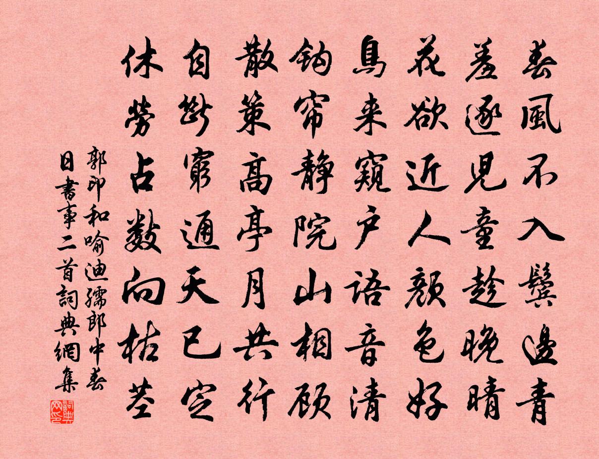 詩詞名句歷史字典書法欣賞書法字典國語詞典說文解字康熙字典古漢語字典標 題 作 者 詩 句 和喻迪孺郎中春日書事二首作者:郭印 朝代:宋代和喻迪孺郎中春日書事二首原文春風不入鬢邊青,羞逐兒童趁晚晴。花欲近人顏色好,鳥來窺戶語音清。鉤簾靜院山相顧,散策高亭月共行。自斷窮通天已定,休勞占數向枯莖。詩詞問答問:和喻迪孺郎中春日書事二首的作者是誰?答:郭印問:和喻迪孺郎中春日書事二首寫於哪個朝代?答:宋代郭印和喻迪孺郎中春日書事二首書法欣賞和喻迪孺郎中春日書事二首書法作品詩詞推薦送物寺丞赴辟秦州判官司馬光〔宋代〕征西大府開,後乘得高材。區脫烽煙靜,渠搜職貢來。隴雲低玉帳,羌舞奉金罍。信美從軍樂,修梧茂帝台。聞明上人逝寄友人李遠〔唐代〕蕭寺曾過最上方,碧桐濃葉覆西廊。遊人縹緲紅衣亂,座客從容白日長。別後旋成莊叟夢,書來忽報惠休亡。他時贈鄭司業張蠙〔唐代〕晚學更求來世達,正懷非與百邪侵。古人名在今人口,不合於名不苦心。和壽昌道中趙希逢〔宋代〕債甘償道路,腳慣踏江村。驀地心生愧,何人日掩門。安貧居陋巷,無事對清樽。我亦動思靜,此懷與誰論。桂管童謠佚名〔唐代〕大蟲來。蒼寒堂張鎡〔宋代〕短橋斜路入松林,何止能銷利慾心。眼悟一真清淨色,耳通千古泰和音。尺量梢影邀僧記,竹護根莖恐鶴侵。莫訝下鐵礓嶺望秦川晚宿九穀李復〔宋代〕六月登壠如登天,騰夷鐵礓須判年。過險欲涉渭水渡,快眼喜見秦州川。溪塍青身下白鷺,驛亭秀木含疏煙。投鞭再次士特韻李處權〔宋代〕愛君直似朱絲繩,遇物可折不可曲。三仕無喜已無慍,肯學時人走巫下。平生不作吠堯事,乘矢猶聞去其鏃。至今與曾公路呂少馮飲曾會卷舟中吳則禮〔宋代〕百年久付一毫端,異縣追隨得自寬。聲入浦雲歌扇麗,影浮江月酒樽寒。黃花窈窕且經眼,白髮蕭條初映冠。共倚以筍送諸公二首趙蕃〔宋代〕昔聞市上三時賣,今已春深見未嘗。莫道寒歷只寒相,及時也復事分張。秋感杜牧〔唐代〕金風萬里思何盡,玉樹一窗秋影寒。獨掩柴門明月下,淚流香袂倚闌乾。海棠高覿〔宋代〕錦里花中色最奇,妖嬈天賦本來稀。綺霞忽照迷紅障,縠露輕籠設翠幃。繁朵有情妝媚景,纖枝無力帶殘暉。好將七十翁吟七言十絕方回〔宋代〕周家八百年天下,文武焉知有赧王。老壽彭公亦余骨,始知生死是興亡。秋日池上薩都剌〔元代〕顧茲林塘幽,消此閒日永。飄風亂萍蹤,落葉散魚影。天清曉露涼,秋深藕花冷。有懷無與言,獨立心自省。寄鹹潤上人釋智圓〔宋代〕流俗不知處,深棲趣轉幽。閒房扃翠岳,遠信隔滄洲。定起花殘砌,詩成雪滿樓。相懷未能去,南北路悠悠。戲呈吳馮皎然〔唐代〕世人不知心是道,只言道在他方妙。還如瞽者望長安,長安在西向東笑。次徐{左山右客}立韻曾幾〔宋代〕此身那得作飛仙,魂夢相從但欲眠。極目參辰不相見,論心膠漆未為堅。別君甲子三千日,問我春秋七十年。久要送王轂及第後歸江西貫休〔唐代〕太宗羅俊彥,桂玉比光輝。難得終須得,言歸始是歸。風帆天際吼,金鶚月中飛。五府如交辟,魚書莫便稀。正冬御殿上壽樂章八首其五賜群臣第二盞酒宮楊億〔宋代〕金奏在懸,有酒斯旨。顒顒卬卬,嚮明負扆。湛湛露斯,式宴以喜。佩玉蕊兮,罔不由禮。送李使君赴邵州皇甫冉〔唐代〕出送東方騎,行安南楚人。城池春足雨,風俗夜迎神。郢路逢歸客,湘川問去津。爭看使君度,皂蓋雪中新。名句推薦蓋世的功勞,當不得一個矜字;彌天的罪過,當不得一個悔字。洪應明《菜根譚·概論》 公子王孫逐後塵,綠珠垂淚滴羅巾。崔郊《贈去婢》 解落三秋葉,能開二月花。李嶠《風》 數點雨聲風約住,朦朧淡月雲來去李冠《蝶戀花·春暮》 天明登前途,獨與老翁別。杜甫《石壕吏》 恨舊愁新。有淚無言對晚春。淮上女《減字木蘭花·淮山隱隱》 目前貧富非為準,久後窮通未可知。馮夢龍《醒世恆言·卷一》 老柘葉黃如嫩樹,寒櫻枝白是狂花。白居易《早冬》 交河城邊鳥飛絕,輪台路上馬蹄滑。岑參《天山雪歌送蕭治歸京》 白日何短短,百年苦易滿。李白《短歌行》